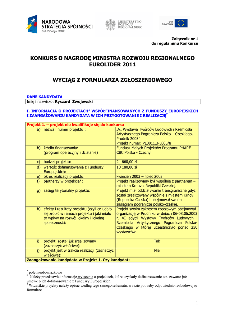 Załącznik nr 1 do regulaminu Konkursu KONKURS O NAGRODĘ MINISTRA ROZWOJU REGIONALNEGO EUROLIDER 2011 WYCIĄG Z FORMULARZA ZGŁOSZENIOWEGO DANE KANDYDATA Imię i nazwisko: Ryszard Zwojewski I. INFORMACJA O PROJEKTACH1 WSPÓŁFINANSOWANYCH Z FUNDUSZY EUROPEJSKICH I ZAANGAśOWANIU KANDYDATA W ICH PRZYGOTOWANIE I REALIZACJĘ2 Projekt 1. – projekt nie kwalifikuje się do konkursu a) nazwa i numer projektu : „VI Wystawa Twórców Ludowych i Rzemiosła Artystycznego Pogranicza Polsko – Czeskiego, Prudnik 2003” Projekt numer: PL0011.3-L005/8 b) źródło finansowania: Fundusz Małych Projektów Programu PHARE (program operacyjny i działanie) CBC Polska - Czechy c) budŜet projektu: d) wartość dofinansowania z Funduszy Europejskich: e) okres realizacji projektu: f) partnerzy w projekcie*: g) zasięg terytorialny projektu: h) efekty i rezultaty projektu (czyli co udało się zrobić w ramach projektu i jaki miało to wpływ na rozwój lokalny i lokalną społeczność): i) 24 660,00 zł 18 180,00 zł kwiecień 2003 – lipiec 2003 Projekt realizowany był wspólnie z partnerem – miastem Krnov z Republiki Czeskiej. Projekt miał oddziaływanie transgraniczne gdyŜ został zrealizowany wspólnie z miastem Krnov (Republika Czeska) i obejmował swoim zasięgiem pogranicze polsko-czeskie. Projekt swoim zakresem rzeczowym obejmował organizację w Prudniku w dniach 06-08.06.2003 r. VI edycji Wystawy Twórców Ludowych i Rzemiosła Artystycznego Pogranicza PolskoCzeskiego w której uczestniczyło ponad 250 wystawców. projekt został juŜ zrealizowany (zaznaczyć właściwe): j) projekt jest w trakcie realizacji (zaznaczyć właściwe): ZaangaŜowanie kandydata w Projekt 1. Czy kandydat: Tak Nie * pole nieobowiązkowe NaleŜy przedstawić informacje wyłącznie o projektach, które uzyskały dofinansowanie tzn. zawarto juŜ umowę o ich dofinansowanie z Funduszy Europejskich. 2 Wszystkie projekty naleŜy opisać według tego samego schematu, w razie potrzeby odpowiednio rozbudowując formularz 1 1 k) jest pomysłodawcą projektu Tak W jakim zakresie? Opis: 1. Skonfrontowanie analizy potrzeb z moŜliwościami uzyskania dofinansowania ze źródeł zewnętrznych. 2. Zidentyfikowanie potrzeb. 3. Określenie głównych celów jak i działań koniecznych do podjęcia. 4. Oczekiwane wyniki projektu. 5. Określenie budŜetu i innych źródeł finansowania. 6. Określenie harmonogramu projektu. 7. Ustalenie sposobu promocji projektu. 8. Określenie sposobów skutecznej realizacji projektu i jego wdroŜenia. 9. Określenie planu utrzymania trwałości efektów projektu (w tym jego przyszłe finansowanie) po jego zakończeniu. 10. Rozmowy z partnerem projektu i uzgodnienie jego roli w realizacji projektu. l) Tak W jakim zakresie? Jakie zadania wykonywał? Opis: Fiszka projektowa w całości została przygotowana przez Pana Ryszard Zwojewskiego. Tak W jakim zakresie? Jakie zdania/czynności wykonuje/wykonywał? Opis: 1.Monitoring finansowy i rzeczowy wdraŜania projektu. 2.Nadzór nad prawidłowością procesu refundacji(sporządzania wniosków o płatność). 3.Nadzór nad sprawozdawczością projektu. 4.Monitoring osiągnięcia wskaźników projektu. 5.Nadzór nad prawidłową archiwizacją dokumentacji związanej z realizacją projektu. uczestniczył w przygotowaniu projektu lub wniosku o dofinansowanie projektu m) jest/był bezpośrednio zaangaŜowany w realizację projektu 2 n) prowadzi/prowadził swoje działania związane z realizacją projektu w ramach obowiązków słuŜbowych, czy te działania wykraczają poza jego obowiązki słuŜbowe o) realizuje/realizował swoje działania związane z realizację projektu w sposób partnerski i na czym polegało partnerstwo (np. czy prowadził konsultacje społeczne, czy informował społeczność o swoich działaniach, czy zapraszał do udziału w projekcie inne podmioty itp.) Kandydat prowadził swoje działania związane z realizacją projektu w ramach obowiązków słuŜbowych. p) wykorzystuje/wykorzystywał w swoich działaniach innowacyjne rozwiązania (nie tylko informatyczne) i na czym one polegały W swoich działaniach kandydat zastosował pełną procedurę zarządzania wszystkimi fazami projektu tj od etapu diagnozy projektu aŜ po jego końcową ewaluację. Projekt realizowany był wspólnie z partnerem – miastem Krnov (Republika Czeska). Partner odpowiedzialny był za realizację uzgodnionej sekwencji działań (nabór czeskich uczestników projektu, promocję projektu po stronie czeskiej, udział w projekcie). q) Inne uwagi* Projekt 2. – projekt nie kwalifikuje się do konkursu a) nazwa i numer projektu: „Publikacja dwutygodnika „Wiadomości bez granic Polsko-Czeski Kurier Informacyjny””. Projekt numer: PL0109.3-L005/05 b) źródło finansowania: Fundusz Małych Projektów Programu PHARE (program operacyjny i działanie) CBC Polska - Czechy c) budŜet projektu: 44 940,00 zł d) wartość dofinansowania z Funduszy 33 540,00 zł Europejskich: e) okres realizacji projektu: kwiecień 2004 – kwiecień 2005 f) partnerzy w projekcie*: Projekt realizowany był wspólnie z partnerem – miastem Krnov z Republiki Czeskiej. g) zasięg terytorialny projektu: Projekt miał oddziaływanie transgraniczne gdyŜ został zrealizowany wspólnie w tym samym czasie: w mieście Prudnik jak i w mieście Krnov (Republika Czeska). h) efekty i rezultaty projektu (czyli co udało Projekt pt "Publikacja dwutygodnika się zrobić w ramach projektu i jaki miało „Wiadomości bez granic Polsko-Czeski Kurier to wpływ na rozwój lokalny i lokalną Informacyjny " posiadał jeden główny cel jakim społeczność): jest dostarczenie społecznościom lokalnym zamieszkującym tereny przygraniczne Polski i Czech regularnego serwisu dotyczącego aktualnych wydarzeń (gospodarczych, kulturalnych oraz o charakterze informacyjnym) mających miejsce na terytorium danego kraju ale teŜ terenów połoŜonych po drugiej stronie granicy. Serwis informacyjny przekazy