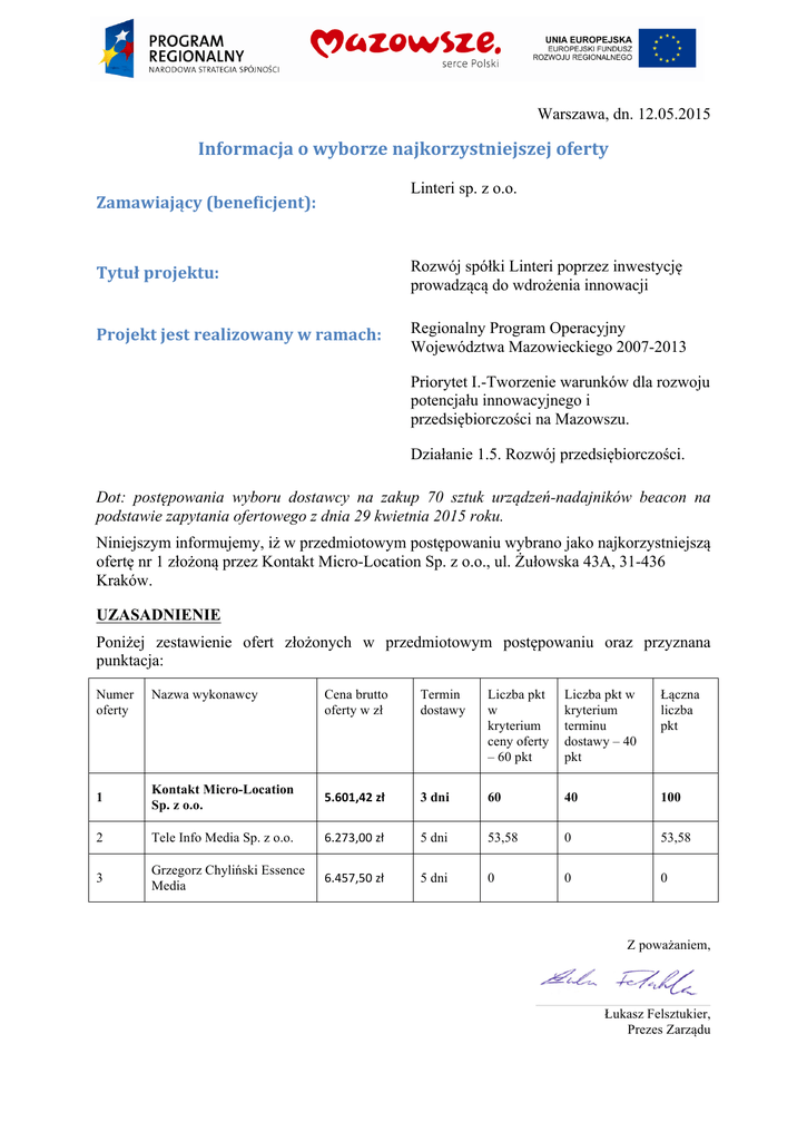 Warszawa, dn. 12.05.2015 Informacja o wyborze najkorzystniejszej oferty Linteri sp. z o.o. Zamawiający (beneficjent): Tytuł projektu: Rozwój spółki Linteri poprzez inwestycję prowadzącą do wdrożenia innowacji Projekt jest realizowany w ramach: Regionalny Program Operacyjny Województwa Mazowieckiego 2007-2013 Priorytet I.-Tworzenie warunków dla rozwoju potencjału innowacyjnego i przedsiębiorczości na Mazowszu. Działanie 1.5. Rozwój przedsiębiorczości. Dot: postępowania wyboru dostawcy na zakup 70 sztuk urządzeń-nadajników beacon na podstawie zapytania ofertowego z dnia 29 kwietnia 2015 roku. Niniejszym informujemy, iż w przedmiotowym postępowaniu wybrano jako najkorzystniejszą ofertę nr 1 złożoną przez Kontakt Micro-Location Sp. z o.o., ul. Żułowska 43A, 31-436 Kraków. UZASADNIENIE Poniżej zestawienie ofert złożonych w przedmiotowym postępowaniu oraz przyznana punktacja: Numer oferty Nazwa wykonawcy Cena brutto oferty w zł Termin dostawy Liczba pkt w kryterium ceny oferty – 60 pkt Liczba pkt w kryterium terminu dostawy – 40 pkt Łączna liczba pkt 1 Kontakt Micro-Location Sp. z o.o. 5.601,42 zł 3 dni 60 40 100 2 Tele Info Media Sp. z o.o. 6.273,00 zł 5 dni 53,58 0 53,58 3 Grzegorz Chyliński Essence Media 6.457,50 zł 5 dni 0 0 0 Z poważaniem, Łukasz Felsztukier, Prezes Zarządu