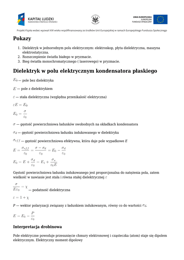 Pokazy 1. Dielektryk w jednorodnym polu elektrycznym: elektroskop, płyta dielektryczna, maszyna elektrostatyczna. 2. Rozszczepienie światła białego w pryzmacie. 3. Bieg światła monochromatycznego ( laserowego) w pryzmacie. Dielektryk w polu elektrycznym kondensatora płaskiego — pole bez dielektryka — pole z dielektrykiem — stała dielektryczna (względna przenikalość elektryczna) — gęstość powierzchniowa ładunków swobodnych na okładkach kondensatora — gęstość powierzchniowa ładunku indukowanego w dielektryku — gęstość powierzchniowa efektywna, która daje pole wypadkowe E Gęstość powierzchniowa ładunku indukowanego jest proporcjonalna do natężenia pola, zatem wielkość w nawiasie jest stała i równa stałej dielektrycznej — podatność dielektryczna P — wektor polaryzacji związany z ładunkiem indukowanym, równy co do wartości . Interpretacja drobinowa Pole elektryczne powoduje przesunięcie chmury elektronowej i cząsteczka (atom) staje się dipolem elektrycznym. Elektryczny moment dipolowy , x — odległość rozsunięcia ładunków — wartość wektora polaryzacji N — liczba atomów w jednostce objętości Klasyczna teoria dyspersji Współczynnik załamania zgodnie z teoria Maxwella wynosi , — stała dielektryczna substancji — przenikalność magnetyczna substancji Przyjmijmy Wyniki doświadczenia pokazują, że współczynnik silnie zależy od częstości. Zależność inny ma charakter dla fal długich i krótkich (krzywa dyspersji). Dyspersja zmienia się, jak odwrotność trzeciej potęgi długości fali Mała długość fali dyspersji. duża zmiana Dyspersja anomalna występuje wtedy, gdy w materiale dla określonej częstości mamy absorpcję ze podręcznika do Fizyki III prof. J.Gintera: Wyniki doświadczalne dla fluorku sodu: 1. w częstości ( podczerwień) fluorek sodu silnie pochłania promieniowanie. 2. Poniżej tej częstości współczynnik załamania rośnie, osiągając wartość większą od 4. 3. W częstości następuje skokowy spadek współczynnika załamania. Najmniejsza jego wartość jest równa 0,2. Ze wzrostem wartość n rośnie. 4. W obszarze widzialnym przebieg prawie płaski. W nadfiolecie zaczyna się znowu wzrost dla częstości , gdzie znów jest absorpcja. Wyniki doświadczeń dla par sodu. W zakresie widzialnym linia absorpcyjna dla 589 nm — żółta linia sodu. W ciele wykazującym dyspersję atomy modelujemy jako oscylatory Drgania jąder w kryształach jonowych lub spolaryzowanych (NaCl) Drgania chmur elektronowych (Na) Model Chmura elektronowa została wychylona przez pole E i jądro stara się przywrócić stan równowagi. Działa siła proporcjonalna do wychylenia: W stanie równowagi F=0. N — liczba atomów w jednostce objętości, — wektor polaryzacji Atom w zmiennym polu elektrycznym Równanie ruchu m masa chmury elektronowej — równanie różniczkowe drugiego rzędu Podstawiamy Podstawiam rozwiązanie równania w postaci Dyskusja Dla Dla — nie ma fali, sytuacja statyczna. — przez dodanie wartości — drgania wybuchają — faza wychylenia przeciwna do pola Przenikalność dielektryczna Dyskusja stałej dielektrycznej — wzór statyczny. Dla — mniejsze od 1. Dla — osiąga duże wartości. Bieg światła monochromatycznego w pryzmacie Przejście światła monochromatycznego przez pryzmat Rozszczepienia światła białego w pryzmacie Szkło wykazuje dyspersję. Współczynnik załamania zależy od częstości. W efekcie każda barwa załamuje się pod innym kątem. Rozszczepienie na barwną wstęgę ma miejsce tam, gdzie promień światła białego wchodzi do pryzmatu (na pierwszej ścianie).