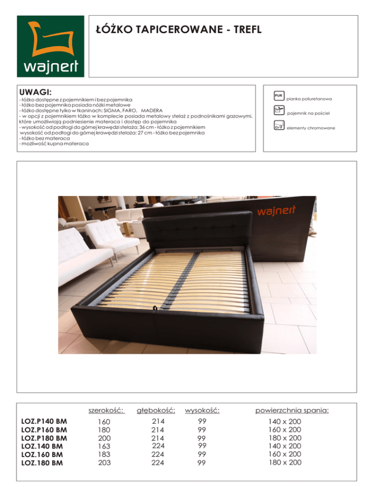 ŁÓŻKO TAPICEROWANE - TREFL UWAGI: PUR - łóżko dostępne z pojemnikiem i bez pojemnika - łóżko bez pojemnika posiada nóżki metalowe - łóżko dostępne tylko w tkaninach: SIGMA, FARO, MADERA - w opcji z pojemnikiem łóżko w komplecie posiada metalowy stelaż z podnośnikami gazowymi, które umożliwiają podniesienie materaca i dostęp do pojemnika - wysokość od podłogi do górnej krawędzi stelaża: 36 cm - łóżko z pojemnikiem wysokość od podłogi do górnej krawędzi stelaża: 27 cm - łóżko bez pojemnika - łóżko bez materaca - możliwość kupna materaca LOZ.P140 BM LOZ.P160 BM LOZ.P180 BM LOZ.140 BM LOZ.160 BM LOZ.180 BM szerokość: głębokość: wysokość: 160 180 200 163 183 203 214 214 214 224 224 224 99 99 99 99 99 99 pianka poliuretanowa pojemnik na pościel Cr elementy chromowane powierzchnia spania: 140 x 200 160 x 200 180 x 200 140 x 200 160 x 200 180 x 200
