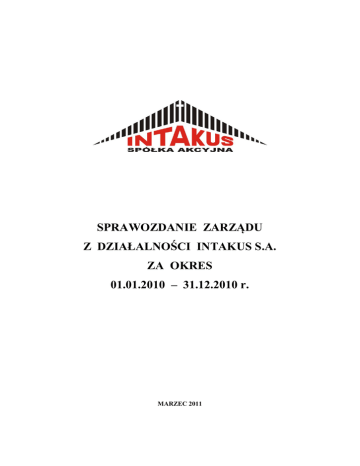 SPRAWOZDANIE ZARZĄDU Z DZIAŁALNOŚCI INTAKUS S.A. ZA OKRES 01.01.2010 – 31.12.2010 r. MARZEC 2011 Sprawozdanie Zarządu z działalności INTAKUS SA za okres od 01.01.2010r. do 31.12.2010r. SPIS TREŚCI: 1. 2. Wprowadzenie do sprawozdania. .................................................................................... 2 Podstawowe informacje o Spółce. .................................................................................... 2 2.1 Dane rejestracyjne i adresowe. ................................................................................... 2 2.2 Przedmiot działalności. ................................................................................................ 2 2.3 Kapitał zakładowy. ....................................................................................................... 4 2.4 Struktura akcjonariatu. ............................................................................................... 5 2.5 Rada Nadzorcza ............................................................................................................ 6 2.6 Zarząd Spółki................................................................................................................ 7 2.7 Rekompensaty dla osób zarządzających w przypadku rezygnacji lub zwolnienia z zajmowanego stanowiska bez ważnej przyczyny. ............................................................. 7 2.8 Prokurenci..................................................................................................................... 7 2.9 Podstawowe informacje o spółkach zależnych od INTAKUS S.A. .......................... 8 3. Podstawowe dane ekonomiczno-finansowe INTAKUS S.A. za 2010r. ........................ 9 4. Charakterystyka działalności w 2010 roku. ................................................................. 12 5. Najważniejsi odbiorcy. ................................................................................................... 12 6. Kontrakty o największym poziomie przerobu w roku 2010. ...................................... 13 7. Najważniejsi dostawcy w roku 2010. ............................................................................. 14 8. Zawarte znaczące umowy i umowy zawarte pomiędzy akcjonariuszami. ................. 15 9. Informacje o powiązaniach kapitałowych lub organizacyjnych z innymi podmiotami. ............................................................................................................................ 15 10. Transakcje z podmiotami powiązanymi. .................................................................. 16 11. Informacje o zaciągniętych i wypowiedzianych umowach dotyczących kredytów i pożyczek. ............................................................................................................................... 16 12. Informacje o udzielonych pożyczkach, poręczeniach i gwarancjach, z uwzględnieniem pożyczek udzielonych jednostkom powiązanym. ................................ 18 13. Postępowania toczące się przed sądem, organem właściwym dla postępowania arbitrażowego lub organem administracji publicznej. ...................................................... 20 14. Opis istotnych czynników ryzyka. ............................................................................. 20 15. Emisja akcji i wykorzystanie wpływów z emisji. ...................................................... 23 16. Objaśnienie różnic pomiędzy wynikami wykazanymi w raporcie rocznym a wcześniej publikowanymi prognozami wyników za dany rok. ....................................... 24 17. Zarządzanie zasobami finansowymi. ......................................................................... 24 18. Ocena czynników nietypowych i zdarzeń mających wpływ na wynik. .................. 25 19. Charakterystyka zewnętrznych i wewnętrznych czynników istotnych dla rozwoju Spółki oraz opis perspektyw rozwoju działalności. ............................................................. 25 20. Zmiany w podstawowych zasadach zarządzania Spółką......................................... 26 21. Liczba i wartość nominalna wszystkich akcji Emitenta będących w posiadaniu osób nadzorujących i zarządzających Emitentem. ............................................................. 26 22. Informacje o znanych Spółce umowach, w wyniku których mogą w przyszłości nastąpić zmiany w proporcjach posiadanych akcji przez dotychczasowych akcjonariuszy. ......................................................................................................................... 27 23. Informacje o systemie kontroli programów akcji pracowniczych. ......................... 27 24. Informacje o dacie zawarcia umowy z podmiotem uprawnionym do badania sprawozdań finansowych, wynagrodzeniu za badanie za rok 2010 i rok 2009. ............... 27 25. Ważniejsze zdarzenia mające znaczący wpływ na działalność oraz wyniki finansowe Spółki w roku obrotowym i których wpływ jest możliwy w następnych latach. ....................................................................................................................................... 28 26. Inwestycje kapitałowe. ................................................................................................ 28 27. Pozycje pozabilansowe. ............................................................................................... 28 1 Sprawozdanie Zarządu z działalności INTAKUS SA za okres od 01.01.2010r. do 31.12.2010r. 1. Wprowadzenie do sprawozdania. Sprawozdanie Zarządu z działalności Spółki Akcyjnej INTAKUS za 2010 rok zostało sporządzone zgodnie z Ustawą o rachunkowości oraz Rozporządzeniem Ministra Finansów w sprawie informacji bieżących i okresowych przekazywanych przez emitentów papierów wartościowych oraz warunków uznawania za równoważne informacji wymaganych przepisami prawa państwa nie będącego państwem członkowskim. 2. Podstawowe 