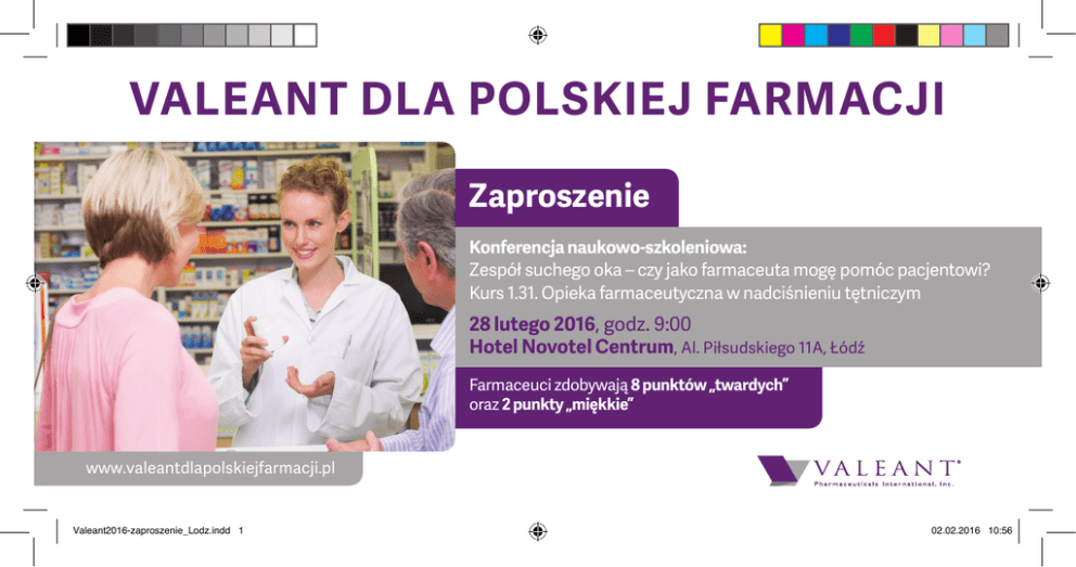 VALEANT DLA POLSKIEJ FARMACJI Zaproszenie Konferencja naukowo-szkoleniowa: Zespół suchego oka – czy jako farmaceuta mogę pomóc pacjentowi? Kurs 1.31. Opieka farmaceutyczna w nadciśnieniu tętniczym 28 lutego 2016, godz. 9:00 Hotel Novotel Centrum, Al. Piłsudskiego 11A, Łódź Farmaceuci zdobywają 8 punktów „twardych” oraz 2 punkty „miękkie” www.valeantdlapolskiejfarmacji.pl Valeant2016-zaproszenie_Lodz.indd 1 02.02.2016 10:56 PROGRAM KURSU 8.00-9.00Rejestracja uczestników 9.00-9.15Rozpoczęcie i powitanie uczestników 9.15-10.15Zespół suchego oka – czy jako farmaceuta mogę pomóc pacjentowi? 10.15-10.30 Przerwa od 10.30 Kurs 1.31. Opieka farmaceutyczna w nadciśnieniu tętniczym 1. Procedury ratunkowe u chorego z krytycznym wzrostem ciśnienia, ryzykiem udaru mózgu, udarem – część I i II 2.Epidemiologia, diagnostyka, wiedza ogólna o NT 3.Wykrywanie i rozwiązywanie problemów lekowych związanych z NT 4.Powikłania NT 5.Edukacja i monitorowanie stanu zdrowia pacjenta z NT 6.Farmakoterapia i ustalanie celów terapeutycznych w NT 17.00 Dyskusja, podsumowanie, zakończenie kursu szkoleniowego, test www.valeantdlapolskiejfarmacji.pl Valeant2016-zaproszenie_Lodz.indd 2 02.02.2016 10:56 INFORMACJE ORGANIZACYJNE KURS JEST BEZPŁATNY Farmaceuci zdobywają 8 punktów edukacyjnych „twardych” (po zaliczeniu testu sprawdzającego) przyznanych przez Gdański Uniwersytet Medyczny oraz 2 punkty edukacyjne „miękkie” przyznane przez Okręgową Izbę Aptekarską w Łodzi . Warunkiem otrzymania certyfikatu na punkty twarde w dniu kursu jest zgłoszenie swojej rejestracji na 5 dni przed rozpoczęciem, uczestnictwo w kursie oraz oddanie prawidłowo wypełnionego testu. Pozostałe osoby, które zaliczą test będą mogły odebrać certyfikat w OIA do których należą. POTWIERDZENIE OBECNOŚCI ORGANIZATOR: GRANT EDUKACYJNY: WSPÓŁORGANIZATOR: Prosimy o potwierdzenie swojej obecności na www.valeantdlapolskiejfarmacji.pl, wysyłając e-mail na adres [email protected] lub pod numerem tel. 514 553 039 w godzinach 9:00 -17:00. Valeant2016-zaproszenie_Lodz.indd 3 02.02.2016 10:56 KOMITET NAUKOWY KIEROWNIK NAUKOWY: PROF. DR HAB. N. MED. ARTUR MAMCARZ Zan-PL-1601-261 Kierownik III Kliniki Chorób Wewnętrznych i Kardiologii WUM. Autor wielu prac oryginalnych, poglądowych i rozdziałów w podręcznikach. Znany, ceniony i lubiany wykładowca. Obszar zainteresowań klinicznych, naukowych i dydaktycznych to m.in. nieinwazyjna diagnostyka kardiologiczna, farmakologia kliniczna, kardiodiabetologia, kardiologia sportowa. WYKŁADOWCY: DR N. MED. MAREK CHMIELEWSKI Adiunkt w Katedrze i Klinice Katedry Kardiologii, Nadciśnienia Tętniczego i Chorób Wewnętrznych Warszawskiego Uniwersytetu Medycznego. Kierownik Pracowni Hemodynamiki w Mazowieckim Szpitalu Wojewódzkim. Nauczyciel akademicki z wieloletnim doświadczeniem dydaktycznym. DR N. MED. MACIEJ JANISZEWSKI Kierownik Zakładu Niewydolności Serca i Rehabilitacji Kardiologicznej Warszawskiego Uniwersytetu Medycznego. Nauczyciel akademicki z kilkunastoletnim doświadczeniem dydaktycznym zarówno w zakresie nauczania studentów, jak i edukacji podyplomowej. LEK. MARCIN WEŁNICKI Specjalista chorób wewnętrznych, pracownik III Kliniki Chorób Wewnętrznych i Kardiologii Warszawskiego Uniwersytetu Medycznego. Uczestnik Studiów Doktoranckich Drugiego Wydziału Lekarskiego WUM. Stały współpracownik gazety „Służba Zdrowia” (dział kliniczny i naukowy). Wykładowca w wielu cyklach szkoleń przeznaczonych dla farmaceutów. DR. N. MED. DANIEL ŚLIŻ Specjalista chorób wewnętrznych, specjalizant w zakresie zdrowia publicznego, adiunkt w III Klinice Chorób Wewnętrznych i Kardiologii Warszawskiego Uniwersytetu Medycznego, członek zarządu Sekcji Prewencji i Epidemiologii Polskiego Towarzystwa Kardiologicznego, członek komisji rewizyjnej Kardiologii Sportowej Polskiego Towarzystwa Kardiologicznego, nauczyciel akademicki. W ramach działalności edukacyjnej wielokrotnie prowadził wykłady dla pacjentów, studentów medycyny, lekarzy oraz farmaceutów. Fascynat medycyny, stylu życia. LEK. MED. MIROSŁAW PASTUSZKA Specjalista drugiego stopnia w zakresie okulistyki. Obecnie zatrudniony jest w Klinice Okulistyki i Rehabilitacji Wzrokowej Uniwersyteckiego Szpitala Klinicznego im. Wojskowej Akademii Medycznej – Centralnego Szpitala Weteranów. Valeant2016-zaproszenie_Lodz.indd 4 02.02.2016 10:56