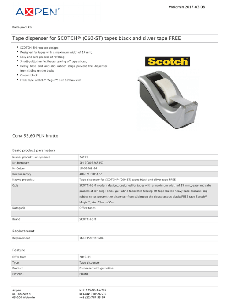Wołomin 2017-03-08 Karta produktu: Tape dispenser for SCOTCH® (C60-ST) tapes black and silver tape FREE SCOTCH-3M modern design; Designed for tapes with a maximum width of 19 mm; Easy and safe process of refilling; Small guillotine facilitates tearing off tape slices; Heavy base and anti-slip rubber strips prevent the dispenser from sliding on the desk; Colour: black FREE tape Scotch® Magic™, size 19mmx33m Cena 35,60 PLN brutto Basic product parameters Numer produktu w systemie 24171 Nr dostawcy 3M-70005263457 Nr Celcen 18-01068-14 Kod kreskowy 4046719105472 Nazwa produktu Tape dispenser for SCOTCH® (C60-ST) tapes black and silver tape FREE Opis SCOTCH-3M modern design;; designed for tapes with a maximum width of 19 mm;; easy and safe process of refilling;; small guillotine facilitates tearing off tape slices;; heavy base and anti-slip rubber strips prevent the dispenser from sliding on the desk;; colour: black; FREE tape Scotch® Magic™, size 19mmx33m Kategoria Office tapes Brand SCOTCH-3M Replacement Replacement 3M-FT510110586 Feature Offer from 2015-01 Type Tape dispenser Product Dispenser with guillotine Material Plastic Axpen ul. Laskowa 4 05-200 Wołomin NIP: 125-00-16-787 REGON: 010346305 +48 (22) 787 55 99 Wołomin 2017-03-08 Karta katalogowa produktu cd. Tape dispenser for SCOTCH® (C60-ST) tapes black and silver tape FREE Dimensions Size Do 19mm Width (mm) 19 Thickness (mm) N.a. Procurement vocabulary CPV 30192000-1 Wyroby biurowe Certifications New product Standard Hit Standard Colour Colour Black Serdecznie zapraszamy do współpracy Axpen zespół. Axpen ul. Laskowa 4 05-200 Wołomin NIP: 125-00-16-787 REGON: 010346305 +48 (22) 787 55 99