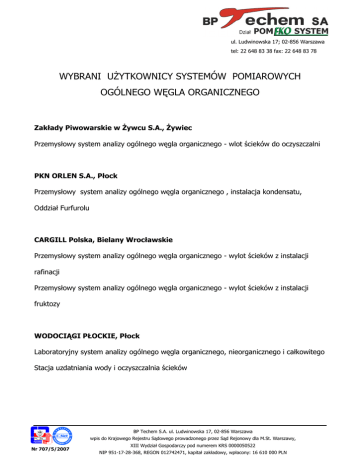 ul. Ludwinowska 17; 02-856 Warszawa tel: 22 648 83 38 fax: 22 648 83 78 WYBRANI UśYTKOWNICY SYSTEMÓW POMIAROWYCH OGÓLNEGO WĘGLA ORGANICZNEGO Zakłady Piwowarskie w śywcu S.A., śywiec Przemysłowy system analizy ogólnego węgla organicznego - wlot ścieków do oczyszczalni PKN ORLEN S.A., Płock Przemysłowy system analizy ogólnego węgla organicznego , instalacja kondensatu, Oddział Furfurolu CARGILL Polska, Bielany Wrocławskie Przemysłowy system analizy ogólnego węgla organicznego - wylot ścieków z instalacji rafinacji Przemysłowy system analizy ogólnego węgla organicznego - wylot ścieków z instalacji fruktozy WODOCIĄGI PŁOCKIE, Płock Laboratoryjny system analizy ogólnego węgla organicznego, nieorganicznego i całkowitego Stacja uzdatniania wody i oczyszczalnia ścieków BP Techem S.A. ul. Ludwinowska 17, 02-856 Warszawa wpis do Krajowego Rejestru Sądowego prowadzonego przez Sąd Rejonowy dla M.St. Warszawy, Nr 707/5/2007 XIII Wydział Gospodarczy pod numerem KRS 0000050522 NIP 951-17-28-368, REGON 012742471, kapitał zakładowy, wpłacony: 16 610 000 PLN ul. Ludwinowska 17; 02-856 Warszawa tel: 22 648 83 38 fax: 22 648 83 78 MIEJSKIE WODOCIĄGI I KANALIZACJA, Rzeszów Laboratoryjny system analizy ogólnego węgla organicznego, nieorganicznego i całkowitego Stacja uzdatniania wody Zwięczyca PKN ORLEN S.A., Płock System analizy ogólnego węgla organicznego( róŜnica węgla całkowitego i nieorganicznego) oraz wolnego chloru w Bloku Wodnym R3, sekwencyjny pomiar 5 strumieni próbek CHEMEKO, Włocławek Laboratoryjny system analizy ogólnego węgla organicznego i całkowitego azotu Z przystawką do próbek stałych AQUANET Sp. z o.o., Poznań Laboratoryjny system analizy ogólnego węgla organicznego, nieorganicznego i całkowitego US Pharmacia, Wrocław System analizy ogólnego węgla organicznego w pętli wody ultra czystej POLPHARMA, Starogard Gdański Przemysłowy, trzykanałowy system analizy ogólnego węgla organicznego i przewodnictwa, instalacja wody do iniekcji BP Techem S.A. ul. Ludwinowska 17, 02-856 Warszawa wpis do Krajowego Rejestru Sądowego prowadzonego przez Sąd Rejonowy dla M.St. Warszawy, Nr 707/5/2007 XIII Wydział Gospodarczy pod numerem KRS 0000050522 NIP 951-17-28-368, REGON 012742471, kapitał zakładowy, wpłacony: 16 610 000 PLN ul. Ludwinowska 17; 02-856 Warszawa tel: 22 648 83 38 fax: 22 648 83 78 BROWARY WARKA, Warka Przemysłowy, dwukanałowy system analizy ogólnego węgla organicznego, wlot i wylot ścieków z podczyszczalni PKN ORLEN S.A., Płock Przemysłowy system analizy ogólnego węgla organicznego, Zakład Wodno-Ściekowy, wlot ścieków z instalacji rafineryjnych TYSKIE BROWARY KSIĄśĘCE, Tychy Przemysłowy system analizy ogólnego węgla organicznego- wlot ścieków do podczyszczalni PKN ORLEN S.A., Płock Przemysłowy system analizy ogólnego węgla organicznego, Zakład Wodno-Ściekowy, wlot ścieków z instalacji petrochemicznych PKN ORLEN S.A., Płock Przemysłowy system analizy ogólnego węgla organicznego (róŜnica węgla całkowitego i nieorganicznego) w Bloku Wodnym P1-3, sekwencyjny pomiar 10 strumieni próbek BP Techem S.A. ul. Ludwinowska 17, 02-856 Warszawa wpis do Krajowego Rejestru Sądowego prowadzonego przez Sąd Rejonowy dla M.St. Warszawy, Nr 707/5/2007 XIII Wydział Gospodarczy pod numerem KRS 0000050522 NIP 951-17-28-368, REGON 012742471, kapitał zakładowy, wpłacony: 16 610 000 PLN ul. Ludwinowska 17; 02-856 Warszawa tel: 22 648 83 38 fax: 22 648 83 78 BIOWET PUŁAWY, Puławy System analizy ogólnego węgla organicznego wodach czystych Wojewódzka Stacja Sanitarno Epidemiologiczna, Warszawa Laboratoryjny system analizy ogólnego węgla organicznego, nieorganicznego i całkowitego PKN ORLEN S.A., Płock Przemysłowy system analizy ogólnego węgla organicznego – blok wodny petrochemiczny P4 PP Porty Lotnicze, Lotnisko Okęcie, Warszawa Przemysłowy system analizy ogólnego węgla organicznego na wylocie z oczyszczalni ścieków Zakłady Piwowarskie w śywcu S.A., śywiec Przewoźny system analizy ogólnego węgla organicznego w ściekach Zakłady Farmaceutyczne UNIA, Warszawa Przemysłowy, dwukanałowy system analizy ogólnego węgla organicznego w pętli wody ultra czystej BP Techem S.A. ul. Ludwinowska 17, 02-856 Warszawa wpis do Krajowego Rejestru Sądowego prowadzonego przez Sąd Rejonowy dla M.St. Warszawy, Nr 707/5/2007 XIII Wydział Gospodarczy pod numerem KRS 0000050522 NIP 951-17-28-368, REGON 012742471, kapitał zakładowy, wpłacony: 16 610 000 PLN ul. Ludwinowska 17; 02-856 Warszawa tel: 22 648 83 38 fax: 22 648 83 78 Browar Belgia Sp. z o.o., Kielce Przemysłowy system analizy ogólnego węgla organicznego- oczyszczalnia ścieków Wodociągi Toruńskie Sp. z o.o. Laboratoryjny system analizy ogólnego węgla organicznego, nieorganicznego i całkowitego Wojewódzka Stacja Sanitarno Epidemiologiczna, Bydgoszcz Laboratoryjny system analizy ogólnego węgla organicznego, nieorganicznego i całkowitego TYMBARK S.A., Oczyszczalnia ścieków Przemysłowy system pomiaru TOC w ściekach surowych GRUPA śYWIEC S.A., Oczyszczalnia ścieków Przemysłowy system pomiaru TOC w ściekach surowych PKN ORLEN, Płock EC, system monitorowania zanieczyszczeń kondensatu z instalacji MEKTOL DANONE Sp. z o.o., Bieruń System analizy TOC w ściekach surowych, pomiar w 3 punktach BP Techem S.A. ul. Ludwinowska 17, 02-856 Warszawa wpis do Krajowego Rejestru Sądowego prowadzonego przez Sąd Rejonowy dla M.St. Warszawy, Nr 707/5/2007 XIII Wydział Gospodarczy pod numerem KRS 0000050522 NIP 951-17-28-368, REGON 012742471, kapitał zakładowy, wpłacony: 16 610 000 PLN ul. Ludwinowska 17; 02-856 Warszawa tel: 22 648 83 38 fax: 22 648 83 78 Wojewódzka Stacja Sanitarno Epidemiologiczna, Katowice Laboratoryjny system analizy ogólnego węgla organicznego PKN ORLEN S.A., Płock Przemysłowy system analizy ogólnego węgla organicznego ( róŜnica węgla całkowitego i nieorganicznego) BP Techem S.A. ul. Lud