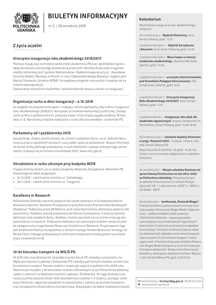 BIULETYN INFORMACYJNY nr 5 / 29 września 2016 Kalendarium Wydziałowe inauguracje roku akademickiego 2016/2017: 30 września (pt.) – Wydział Chemiczny, Aula, Gmach Główny, godz. 13.15 Z życia uczelni 3 października (pon.) – Wydział Zarządzania i Ekonomii, Aula, Gmach Główny, godz. 12.00 Uroczysta inauguracja roku akademickiego 2016/2017 1 października (sob.) – Msza święta w intencji środowiska akademickiego, Bazylika Mariacka, Gdańsk, godz. 12.00. Podczas inauguracji centralnej społeczność akademicka PG oraz zgromadzeni goście będą świadkami uroczystego przekazania przez prof. Henryka Krawczyka insygniów władzy rektorskiej prof. Jackowi Namieśnikowi. Wykład inauguracyjny pt. „Narodowe Centrum Badań i Rozwoju w Planie na rzecz Odpowiedzialnego Rozwoju” wygłosi prof. Maciej Chorowski, dyrektor NCBiR. Szczegółowy program uroczystości znajduje się na stronie www.pg.edu.pl. Zapraszamy wszystkich studentów i pracowników do wzięcia udziału w inauguracji. Organizacja ruchu w dniu inauguracji – 4.10.2016 Ze względu na przyjazd wielu gości i trwający remont apelujemy, aby w dniu inauguracji roku akademickiego 2016/2017 skorzystać ze środków komunikacji publicznej. Zasady ruchu w dniu 4 października br. pokazuje mapa: https://repos.pg.gda.pl/d/ho3. W tym dniu ul. G. Narutowicza będzie wyłączona z ruchu dla pracowników i studentów PG. Parkometry od 1 października 2016 Zarząd Dróg i Zieleni poinformował, że z dniem 1 października br. na ul. Gabriela Narutowicza oraz w sąsiednich uliczkach ruszy pobór opłat za parkowanie. Więcej informacji na temat strefy płatnego parkowania, w tym możliwości wykupu miesięcznego abonamentu, znajduje się na stronie internetowej ZDiZ: www.zdiz.gda.pl. 4 października (wt.) – uroczyste złożenie kwiatów pod Pomnikiem Poległych Stoczniowców, Plac Solidarności, Gdańsk, godz. 9.00. 4 października (wt.) – Uroczysta Inauguracja Roku Akademickiego 2016/2017, Aula, Gmach Główny, godz. 11.15 5 października (śr.) – Inauguracja roku akad. dla studentów zagranicznych, miejsce: Dziedziniec im. Fahrenheita, Gmach Główny, godz. 14.00–16.00 29 września (czw.) – szkolenie Aspekty finansowe w progr. Horyzont 2020 – II edycja, miejsce: sala 300, Gmach Główny PG. Rejestracja do 26.09.2016 r. do godz. 15.00, formularz na stronie www.rpkgdansk.pl w zakładce Szkolenia. Utrudnienia w ruchu ulicznym przy budynku WZIE Trwają remonty dwóch ulic w okolicy budynku Wydziału Zarządzania i Ekonomii PG. Harmonogram robót drogowych: • 31.10.2016 – zakończenie remontu ul. Sobieskiego, • 30.11.2016 – zakończenie remontu ul. Traugutta. 30 września (pt.) – Wizyta członków Komitetu do spraw Umowy Partnerstwa na lata 2014–2020 na Politechnice Gdańskiej. Wizytacja dużych projektów finansowanych w ramach Polityki Spójności UE: 1. Laboratorium LINTE^2 – WEiA, 2. CD NIWA – WETI. Excellence in Research Politechnika Gdańska wyraziła poparcie dla zasad zawartych w Europejskiej Karcie Naukowca (Karcie) i Kodeksie Postępowania przy Rekrutacji Pracowników Naukowych (Kodeksie). Podpisana przez JM Rektora, prof. Jacka Namieśnika, deklaracja poparcia dla zasad Karty i Kodeksu została przekazana do Komisji Europejskiej. Z treścią złożonej deklaracji oraz zasadami Karty i Kodeksu można zapoznać się na stronie www.pg.edu. pl/excellence-in-research. Podpisanie deklaracji jest pierwszym krokiem naszej Uczelni do ubiegania się o Logo Human Resources Excellence in Research. Przyznawanie loga jest działaniem Komisji Europejskiej w ramach strategii Human Resources Strategy for Researchers, którego podstawowym celem jest zwiększanie atrakcyjności warunków pracy naukowców w UE. 10 lat kierunku transport na WILiŚ PG W 2016 roku mija dziesięć lat od podjęcia przez Senat PG uchwały o utworzeniu na Wydziale Inżynierii Lądowej i Środowiska PG interdyscyplinarnych studiów na kierunku kształcenia transport. Pierwsi studenci rozpoczęli zajęcia w październiku 2006 roku. Obecnie jest to jeden z 36 kierunków studiów oferowanych przez Politechnikę Gdańską i jeden z czterech na Wydziale Inżynierii Lądowej i Środowiska. W ciągu dziesięciu lat naszą uczelnię opuściło blisko 1000 absolwentów studiów I i II stopnia, zasilając rynek pracy Pomorza i regionów sąsiednich w specjalistów z zakresu systemów transportu oraz zarządzania infrastrukturą transportową. Rozwijająca się kadra naukowa prowadzi 30 września (pt.) – konferencja „Pomorski Biogas”. Podczas konferencji podsumowane zostaną rezultaty projektu Pomeranian Biogas Model. Organizatorzy – spółka InnoBaltica (lider projektu) i Politechnika Gdańska – zapraszają władze samorządowe oraz przedstawicieli regionalnych operatorów instalacji do przetwarzania odpadów komunalnych. Tematem konferencji będzie redukcja składowanych odpadów komunalnych poprzez wykorzystanie ich do produkcji biogazu z frakcji organicznej. Informacje dotyczące projektu Pomeranian Biogas Model dostępne są na stronie www.pom-biogas.eu/pl/projekt. Wstęp na konferencję jest bezpłatny, obowiązuje rejestracja mailowa. Miejsce: s. 300, Gmach Główny PG, godz. 9.00-15.00. ✉ Dział Promocji / [email protected] / 58 347 23 61 www.biuletyn.pg.edu.pl interdyscyplinarne badania uczestnicząc w projektach, których wyniki wdrażane są przez instytucje krajowe i samorządowe, zarządy transportu, zarządy dróg, a także przedsiębiorstwa transportowe. Nowa oferta Biura Karier dla studentów PG Biuro Karier PG otrzymało dofinansowanie z NCBiR w wys. blisko 530 tys. zł. na wsparcie działań wspomagających studentów w rozpoczęciu aktywności zawodowej na rynku pracy. Udział w projekcie „Do kariery, gotowi, START! – Zawodowcy na mecie” to szansa na zyskanie przydatnych kompetencji i szybsze podjęcie pracy związanej z kierunkiem studiów. Projekt przeznaczony jest dla studentów dwóch ostatnich semestrów I