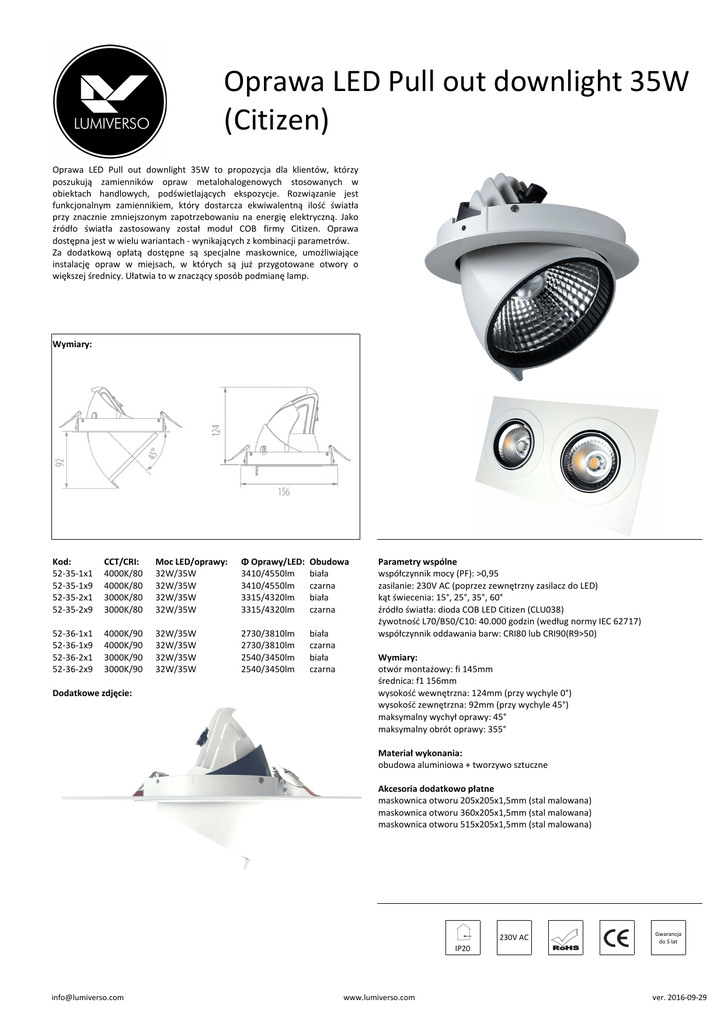 Oprawa LED Pull out downlight 35W (Citizen) Oprawa LED Pull out downlight 35W to propozycja dla klientów, którzy poszukują zamienników opraw metalohalogenowych stosowanych w obiektach handlowych, podświetlających ekspozycje. Rozwiązanie jest funkcjonalnym zamiennikiem, który dostarcza ekwiwalentną ilość światła przy znacznie zmniejszonym zapotrzebowaniu na energię elektryczną. Jako źródło światła zastosowany został moduł COB firmy Citizen. Oprawa dostępna jest w wielu wariantach - wynikających z kombinacji parametrów. Za dodatkową opłatą dostępne są specjalne maskownice, umożliwiające instalację opraw w miejsach, w których są już przygotowane otwory o większej średnicy. Ułatwia to w znaczący sposób podmianę lamp. Wymiary: Kod: 52-35-1x1 52-35-1x9 52-35-2x1 52-35-2x9 CCT/CRI: 4000K/80 4000K/80 3000K/80 3000K/80 Moc LED/oprawy: 32W/35W 32W/35W 32W/35W 32W/35W Φ Oprawy/LED: 3410/4550lm 3410/4550lm 3315/4320lm 3315/4320lm Obudowa biała czarna biała czarna 52-36-1x1 52-36-1x9 52-36-2x1 52-36-2x9 4000K/90 4000K/90 3000K/90 3000K/90 32W/35W 32W/35W 32W/35W 32W/35W 2730/3810lm 2730/3810lm 2540/3450lm 2540/3450lm biała czarna biała czarna Dodatkowe zdjęcie: Parametry wspólne współczynnik mocy (PF): >0,95 zasilanie: 230V AC (poprzez zewnętrzny zasilacz do LED) kąt świecenia: 15°, 25°, 35°, 60° źródło światła: dioda COB LED Citizen (CLU038) żywotność L70/B50/C10: 40.000 godzin (według normy IEC 62717) współczynnik oddawania barw: CRI80 lub CRI90(R9>50) Wymiary: otwór montażowy: fi 145mm średnica: f1 156mm wysokość wewnętrzna: 124mm (przy wychyle 0°) wysokość zewnętrzna: 92mm (przy wychyle 45°) maksymalny wychył oprawy: 45° maksymalny obrót oprawy: 355° Materiał wykonania: obudowa aluminiowa + tworzywo sztuczne Akcesoria dodatkowo płatne maskownica otworu 205x205x1,5mm (stal malowana) maskownica otworu 360x205x1,5mm (stal malowana) maskownica otworu 515x205x1,5mm (stal malowana) 230V AC IP20 [email protected] www.lumiverso.com Gwarancja do 5 lat ver. 2016-09-29