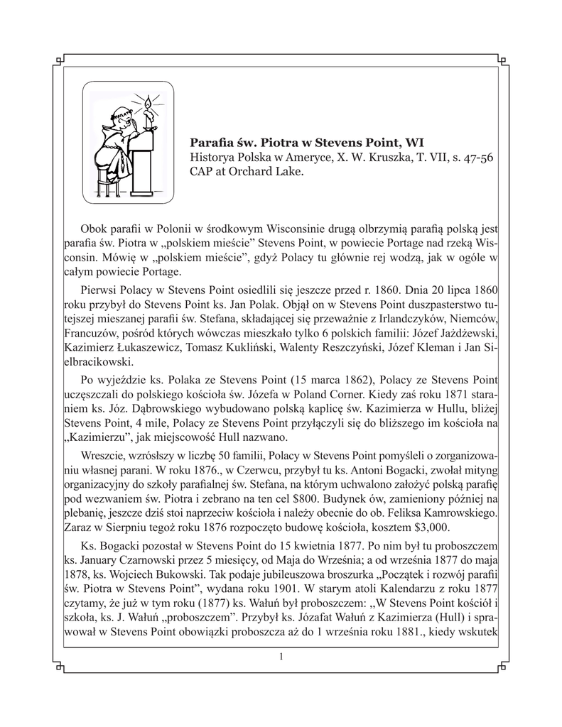 Parafia św. Piotra w Stevens Point, WI Historya Polska w Ameryce, X. W. Kruszka, T. VII, s. 47-56 CAP at Orchard Lake. Obok parafii w Polonii w środkowym Wisconsinie drugą olbrzymią parafią polską jest parafia św. Piotra w „polskiem mieście” Stevens Point, w powiecie Portage nad rzeką Wisconsin. Mówię w „polskiem mieście”, gdyż Polacy tu głównie rej wodzą, jak w ogóle w całym powiecie Portage. Pierwsi Polacy w Stevens Point osiedlili się jeszcze przed r. 1860. Dnia 20 lipca 1860 roku przybył do Stevens Point ks. Jan Polak. Objął on w Stevens Point duszpasterstwo tutejszej mieszanej parafii św. Stefana, składającej się przeważnie z Irlandczyków, Niemców, Francuzów, pośród których wówczas mieszkało tylko 6 polskich familii: Józef Jażdżewski, Kazimierz Łukaszewicz, Tomasz Kukliński, Walenty Reszczyński, Józef Kleman i Jan Sielbracikowski. Po wyjeździe ks. Polaka ze Stevens Point (15 marca 1862), Polacy ze Stevens Point uczęszczali do polskiego kościoła św. Józefa w Poland Corner. Kiedy zaś roku 1871 staraniem ks. Józ. Dąbrowskiego wybudowano polską kaplicę św. Kazimierza w Hullu, bliżej Stevens Point, 4 mile, Polacy ze Stevens Point przyłączyli się do bliższego im kościoła na „Kazimierzu”, jak miejscowość Hull nazwano. Wreszcie, wzrósłszy w liczbę 50 familii, Polacy w Stevens Point pomyśleli o zorganizowaniu własnej parani. W roku 1876., w Czerwcu, przybył tu ks. Antoni Bogacki, zwołał mityng organizacyjny do szkoły parafialnej św. Stefana, na którym uchwalono założyć polską parafię pod wezwaniem św. Piotra i zebrano na ten cel $800. Budynek ów, zamieniony później na plebanię, jeszcze dziś stoi naprzeciw kościoła i należy obecnie do ob. Feliksa Kamrowskiego. Zaraz w Sierpniu tegoż roku 1876 rozpoczęto budowę kościoła, kosztem $3,000. Ks. Bogacki pozostał w Stevens Point do 15 kwietnia 1877. Po nim był tu proboszczem ks. January Czarnowski przez 5 miesięcy, od Maja do Września; a od września 1877 do maja 1878, ks. Wojciech Bukowski. Tak podaje jubileuszowa broszurka „Początek i rozwój parafii św. Piotra w Stevens Point”, wydana roku 1901. W starym atoli Kalendarzu z roku 1877 czytamy, że już w tym roku (1877) ks. Wałuń był proboszczem: ,,W Stevens Point kościół i szkoła, ks. J. Wałuń „proboszczem”. Przybył ks. Józafat Wałuń z Kazimierza (Hull) i sprawował w Stevens Point obowiązki proboszcza aż do 1 września roku 1881., kiedy wskutek 1 różnych nieporozumień i przykrości podupadł na zdrowiu, udał się na prywatny spoczynek do pp. Bulmańskich i tam też w dwa miesiące później, 2 listopada zmarł. Jego szczątki spoczywają na cmentarzu w Hull. Przez owe dwa miesiące choroby ks. Wałunia, zastępował go ks. J. J. Zawistowski. Od śmierci ks. Wałunia nie było w tej parafii księdza przez cały prawie rok. Dopiero w listopadzie roku 1882 przybył ks. E. I. Słowikowski. O tym ks. Słowikowskim piszą nam ze Starego Sącza, z Galicji: „W kwietniu w roku 1895 zmarł pod Ztoczowem tułacz zakonnik ks. Emanuel Słowikowski, rodem ze Starego Sącza, który uciuławszy w Ameryce grosz, złożył w ofierze rodakom. Testamentem przeznaczył cały swój majątek na cele publiczne dla mieszkańców swego rodzinnego miasta Sącza, jak: na restauracyę kościoła parafialnego, kanonizacyę błog. Kingi, szpital ubogich, a także na fundacyę stypendyjną dla ubogiej młodzieży szkolnej starosądeckiej. Spadek po nim przeprowadził i ukończył jeszcze w Marcu 1899 roku sąd powiatowy w Starym Sączu, wypłaciwszy, gdzie należało, wszystkie legaty, a fundusz stypendyjny, przeszło 80,000 koron wynoszący, przesłał namiestnictwu we Lwowie do dalszego rozporządzenia.” Wybudował on nową plebanię kosztem $2,500. W następnym roku 1883 parafia została inkorporowana. Ks. Słowikowski pozostaje do 23 maja roku 1884. Po nim, obejmuje parafię ks. Antoni Lex i sprawuje urząd proboszcza do 13 listopada roku 1888. Odrestaurował kościół, zakupił w roku 1887 szkołę publiczną od miasta razem z 4 lotami, za $1,000 i przemienił ją na szkołę parafialną, która dotąd jeszcze stoi. Poświęcenia tej szkoły dokonał ks. Wincenty Barzyński, C. R. Kierownictwo szkoły objęły SS. Notre Damki, zaraz po poświęceniu. Nastąpił ks. Władysław Grabowski, aż do 25 stycznia 1891 roku. Wybudował dom dla Sióstr roku 1890, za $2,400 i powiększył kościół kosztem $1,200. Potem ks. Grabowski udaje się do La Salle, IL., a stamtąd na jego miejsce przybywa ks. Zygmunt Woźny. Ten odnowił wieże kościelne i sprawił nowy wielki ołtarz i dzwon. Dnia 1. Maja 1894 opuszcza Stevens Point i zamienia się z ks. Zielińskim, który z Menasha przybył do Stevens Point i w najburzliwszych tej parafii czasach wytrwał na swojem trudnem stanowisku (utrudnionem jeszcze przez pokątne intrygi) aż do 15 listopada roku 1896. Ks. Zieliński sprawił nowy dach na kościele, powiększył chór na 26 miejsc, upiększył plebanię, powiększył cmentarz i podzielił go na loty. W roku 1895 Siostry Notre Damki zmuszone były opuścić kierownictwo szkoły i przez cały rok kierowały szkołą świeckie nauczycielki: panna Marta Michalska i panna Walerja Łukaszewicz, które później były nauczycielkami jedna w Toruniu, a druga w Two Rivers, Wis. (R. 1902.) We Wrześniu roku 1896 objęły szkołę Siostry Franciszkanki z klasztoru św. Józefa w Milwaukee, Wis., i dotąd ją prowadzą. W roku 1901 Siostry te, oderwawszy się od pnia niemieckiego, zapoczątkowały nowe czysto polskie zgromadzenie, z domem macierzystym w Stevens Point, i zwią się „Polskie Siostry Szkolne św. Józefa”. Miesiąc przed odjazdem ks. Zielińskiego, dnia 18 października roku 1896., w niedzielę po nieszporach, wskutek niewiadomej przyczyny kościół i plebania zgorzały doszczętnie, a 2 ks. Zieliński, zgnębiony tem zajściem oraz rozmaitymi knowaniami, spiskami i zamachami niegod