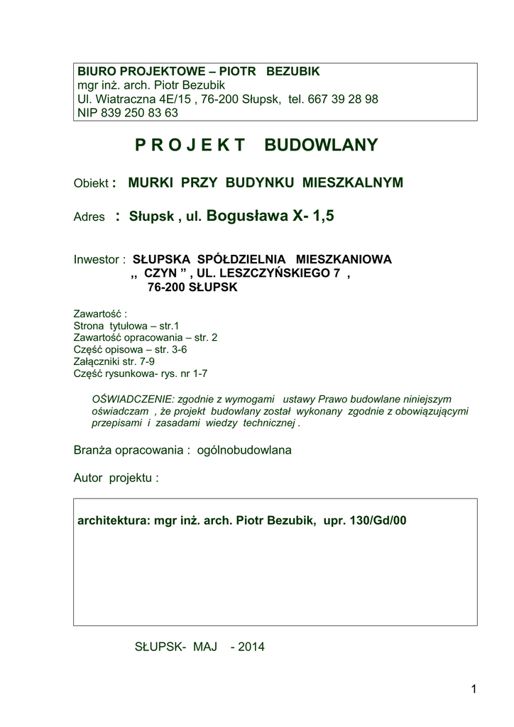 BIURO PROJEKTOWE – PIOTR BEZUBIK mgr inż. arch. Piotr Bezubik Ul. Wiatraczna 4E/15 , 76-200 Słupsk, tel. 667 39 28 98 NIP 839 250 83 63 PROJEKT BUDOWLANY Obiekt : MURKI PRZY BUDYNKU MIESZKALNYM Adres : Słupsk , ul. Bogusława X- 1,5 Inwestor : SŁUPSKA SPÓŁDZIELNIA MIESZKANIOWA ,, CZYN ” , UL. LESZCZYŃSKIEGO 7 , 76-200 SŁUPSK Zawartość : Strona tytułowa – str.1 Zawartość opracowania – str. 2 Część opisowa – str. 3-6 Załączniki str. 7-9 Część rysunkowa- rys. nr 1-7 OŚWIADCZENIE: zgodnie z wymogami ustawy Prawo budowlane niniejszym oświadczam , że projekt budowlany został wykonany zgodnie z obowiązującymi przepisami i zasadami wiedzy technicznej . Branża opracowania : ogólnobudowlana Autor projektu : architektura: mgr inż. arch. Piotr Bezubik, upr. 130/Gd/00 SŁUPSK- MAJ - 2014 1 ZAWARTOŚĆ OPRACOWANIA CZĘŚĆ OPISOWA 1. Strona tytułowa str.1 2. Zawartość opracowania str.2 3. Projekt zagospodarowania terenu str. 3 4. Opis techniczny str. 4-6 5. Załączniki : • Informacja BIOS str. 7 • Wpis do Izby i uprawnienia projektanta str.8 -9 CZĘŚĆ GRAFICZNA 1. MAPA SYT. –WYS. (1: 500 ) 2. MUREK NR1 –STAN ISTNIEJACY (1:50 ) 3. 4. 5. 6. MUREK NR 1 – STAN PROJEKTOWANY (1:50 ) MUREK NR 1 - ŁAWA FUNDAMENTOWA ( 1: 100 ) MUREK NR1 – DETAL FUNDAMENTU ( 1:20 ) MUREK NR 1 – DETAL FUNDAMENTU (1 :20 ) 7. MUREK NR1 - BALUSTRADA (1: 25 ) 8. MUREK NR 2- STAN ISTNIEJĄCY ( 1: 75 ) 9. MUREK NR 2- STAN PROJEKTOWANY ( 1: 50 ) 10. ŁAWA FUNDAMENTOWA ( 1: 100 ) 11. MUREK NR 2 -DETAL FUNDAMENTU ( 1:20 ) 2 PROJEKT ZAGOSPODAROWANIA TERENU -CZĘŚĆ OPISOWA 1.Przedmiot opracowania i projektowane zagospodarowanie działki : Przedmiotem opracowania jest projekt budowlany dwóch murków oporowych zlokalizowanych w Słupsku przy budynkach mieszkalnych wielorodzinnych ul. Bogusława X – 1,5 . 2. Istniejące zagospodarowanie terenu : W chwili obecnej na terenie obszaru objętego opracowaniem znajdują się już murki oporowe , są one jednak w złym stanie technicznym . Murek znajdujący się przy budynku mieszkalnym nr1 wybudowany został z betonowych bloczków o wymiarach 50x20 i szerokości 15 cm otynkowanych od czoła tynkiem cementowowapiennym znajduje się on na spadku terenu (ok. 4% ) , jego średnia wysokość to ok. 60-70 cm a długość ok. 950 cm . Na poziomie podstawy murka znajduje się parking na poziomie jego zwieńczenia również parking . W jego pobliżu rosną krzewy róży pomarszczonej , klony pospolite jako rośliny samosiejne oraz winobluszcz zaroślowy . Murek oporowy znajdujący się przy budynku mieszkalnym nr 5 wybudowany został z betonowych bloczków ozdobnych o wymiarach 50x20 i szerokości 15 cm . Jego wysokość wynosi ok. 90 cm a długość ok. 24 m . Murek posiada 3 wnęki w których zlokalizowane są drewniane ławki . W bezpośredniej bliskości murków poza ich obrysem zewnętrznym rosną krzewy ozdobne : śnieguliczka , tawuła pospolita , śliwa ozdobna , porzeczka ozdobna . 3. Dane ogólne o projektowanej inwestycji : Teren znajduje się we władaniu S.S.S.M. ,,CZYN’’, ul. Leszczyńskiego -7 , 76-200 Słupsk . 4. Uzbrojenie terenu : Na działkach objętych opracowaniem znajduje się podziemna sieć energetyczna związana z oświetleniem zewnętrznym , podziemna sieć cieplna ,wodociąg , kanalizacja deszczowa . 5. Otaczające drogi : Murki zlokalizowane są wzdłuż ciągu pieszo-jezdnego znajdującego się przy budynkach mieszkalnych wielorodzinnych . 6. Zieleń : Na terenie znajduje się zieleń istniejąca . Projekt nie odnosi się do zieleni istniejącej to znaczy nie planuje się wycinek ani przesadzeń istniejących roślin . 7.Charakterystyka przyjętych rozwiązań projektowych : W miejscu istniejących murków planuje się budowę nowych murków oporowych wykonanych z betonu oraz betonu zbrojonego obłożonych cegłą klinkierową . Nowe murki z niewielkimi zmianami rzutu będą biegły po śladzie murków istniejących ,które należy rozebrać . Opracował : Piotr Bezubik 3 OPIS SPOSOBU PRZEPROWADZENIA INWESTYCJI 1.Roboty rozbiórkowe . Istniejące murki nie spełniają już swojej roli. Należy je rozebrać a materiał rozbiórkowy przekazać do przetworzenia . 2. MUREK NR 1 : Murek zlokalizowany będzie przy budynku mieszkalnym Bogusława X nr 1 , cały teren jest użytkowany jako parking . Obszar na którym znajduje się murek posiada spadek ok. 4% . Na górnym tarasie znajduje się również spadek w kierunku przeciwnym ok. 4% . Poprzedni murek oraz jego fundament należy rozebrać , w jego miejsce należy wykonać fundament żelbetowy wg. rysunków projektowych . Na fundamencie wznieść ścianę żelbetową monolityczną wg. rysunków projektowych oraz wznieść mur z bloczków betonowych o wymiarach : 30x25x10 cm. Następnie zaizolować całość abizolem R+P . Od strony zewnętrznej i od góry mur należy obłożyć cegłą klinkierową pełną murowaną na zaprawie cementowo- wapiennej , spoinę muru należy wykonać w kolorze popielatym . W warstwie cegieł znajdującej się najbliżej poziomu chodnika należy pozostawić jedna spoinę pionową nie zamurowaną na każde pięć cegieł . 3. MUREK NR 2 : Murek zlokalizowany będzie przy budynku mieszkalnym Bogusława X nr 5 Zostanie on wykonany z uwzględnieniem znajdujących się tam schodów terenowych , jego wysokość w stanie wykończonym będzie wynosiła ok. 90 cm . Murek należy wykonywać tak aby nie uszkodzić znajdujących się w jego pobliżu krzewów ozdobnych . Dlatego też należy prowadzić go w ten sposób aby tylna ściana muru znajdowała się w miejscu tylnej ściany obecnie istniejącej . Wyjątek stanowi tu część znajdująca się w pobliżu kratki kanalizacji deszczowej . Fundament po poprzednim murku należy wybrać , w jego miejsce należy wykonać fundament żelbetowy wg. rysunków projektowych oraz ścianę oporową . Całość zaizolować abizolem R+P . Od strony zewnętrznej i od góry mur należy obłożyć cegłą klinkie