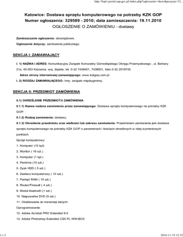1z3 http://bzp1.portal.uzp.gov.pl/index.php?ogloszenie=show&pozycja=32... Katowice: Dostawa sprzętu komputerowego na potrzeby KZK GOP Numer ogłoszenia: 329589 - 2010; data zamieszczenia: 19.11.2010 OGŁOSZENIE O ZAMÓWIENIU - dostawy Zamieszczanie ogłoszenia: obowiązkowe. Ogłoszenie dotyczy: zamówienia publicznego. SEKCJA I: ZAMAWIAJĄCY I. 1) NAZWA I ADRES: Komunikacyjny Związek Komunalny Górnośląskiego Okręgu Przemysłowego , ul. Barbary 21a, 40-053 Katowice, woj. śląskie, tel. 0-32 7438401, 7438501, faks 0-32 2519745. Adres strony internetowej zamawiającego: www.kzkgop.com.pl I. 2) RODZAJ ZAMAWIAJĄCEGO: Inny: związek międzygminny. SEKCJA II: PRZEDMIOT ZAMÓWIENIA II.1) OKREŚLENIE PRZEDMIOTU ZAMÓWIENIA II.1.1) Nazwa nadana zamówieniu przez zamawiającego: Dostawa sprzętu komputerowego na potrzeby KZK GOP. II.1.2) Rodzaj zamówienia: dostawy. II.1.3) Określenie przedmiotu oraz wielkości lub zakresu zamówienia: Przedmiotem zamówienia jest dostawa sprzętu komputerowego na potrzeby KZK GOP o parametrach i ilościach określonych w niżej wymienionych punktach. Sprzęt komputerowy: 1. Komputer (15 kpl) 2. Monitor ( 16 szt.) 3. Komputer (1 kpl.) 4. Pendrive (10 szt.) 5. Dysk HDD ( 5 szt.) 6. Zasilacz komputerowy ( 10 szt.) 7. Pamięć RAM ( 10 szt.) 8. Router/Firewall ( 4 szt.) 9. Moduł bluetooth (1 szt.) 10. Nagrywarka DVD (5 szt.) 11. Okablowanie do transmisji danych. Oprogramowanie: 12. Adobe Acrobat PRO Extended 9.0 13. Adobe Photoshop Extended CS5 PL WIN BOX 2010-11-19 12:52 2z3 http://bzp1.portal.uzp.gov.pl/index.php?ogloszenie=show&pozycja=32... 14. Adobe Flash Pro CS5 PL WIN BOX 15. CorelDraw Graphics Suite X5 PL 16. Zend Studio 7.2 17. Nero Multimedia Suite 10 PL BOX 18. Easy Recovery 6.2 Professional 19. GFI LanGuard Network Security Scanner 9.5 20. Database Master 3.0. II.1.4) Czy przewiduje się udzielenie zamówień uzupełniających: nie. II.1.5) Wspólny Słownik Zamówień (CPV): 20.21.33.00-8, 30.23.46.00-4, 30.23.61.10-6, 30.23.31.32-5, 30.23.31.50-7, 32.58.11.00-0, 30.20.00.00-1, 32.42.00.00-3, 30.23.13.00-0, 48.00.00.00-8. II.1.6) Czy dopuszcza się złożenie oferty częściowej: nie. II.1.7) Czy dopuszcza się złożenie oferty wariantowej: nie. II.2) CZAS TRWANIA ZAMÓWIENIA LUB TERMIN WYKONANIA: Okres w dniach: 30. SEKCJA III: INFORMACJE O CHARAKTERZE PRAWNYM, EKONOMICZNYM, FINANSOWYM I TECHNICZNYM III.1) WADIUM Informacja na temat wadium: 2 000,00 zł (słownie: dwa tysiące złotych 00/100) III.2) ZALICZKI Czy przewiduje się udzielenie zaliczek na poczet wykonania zamówienia: nie III.4) INFORMACJA O OŚWIADCZENIACH LUB DOKUMENTACH, JAKIE MAJĄ DOSTARCZYĆ WYKONAWCY W CELU POTWIERDZENIA SPEŁNIANIA WARUNKÓW UDZIAŁU W POSTĘPOWANIU ORAZ NIEPODLEGANIA WYKLUCZENIU NA PODSTAWIE ART. 24 UST. 1 USTAWY III.4.1) W zakresie wykazania spełniania przez wykonawcę warunków, o których mowa w art. 22 ust. 1 ustawy, oprócz oświadczenia o spełnieniu warunków udziału w postępowaniu, należy przedłożyć: III.4.2) W zakresie potwierdzenia niepodlegania wykluczeniu na podstawie art. 24 ust. 1 ustawy, należy przedłożyć: oświadczenie o braku podstaw do wykluczenia aktualny odpis z właściwego rejestru, jeżeli odrębne przepisy wymagają wpisu do rejestru, w celu wykazania braku podstaw do wykluczenia w oparciu o art. 24 ust. 1 pkt 2 ustawy, wystawiony nie wcześniej niż 6 miesięcy przed upływem terminu składania wniosków o dopuszczenie do udziału w postępowaniu o udzielenie zamówienia albo składania ofert, a w stosunku do osób fizycznych oświadczenie w zakresie art. 24 ust. 1 pkt 2 ustawy III.4.3) Dokumenty podmiotów zagranicznych Jeżeli wykonawca ma siedzibę lub miejsce zamieszkania poza terytorium Rzeczypospolitej Polskiej, przedkłada: 2010-11-19 12:52 3z3 http://bzp1.portal.uzp.gov.pl/index.php?ogloszenie=show&pozycja=32... III.4.3.1) dokument wystawiony w kraju, w którym ma siedzibę lub miejsce zamieszkania potwierdzający, że: nie otwarto jego likwidacji ani nie ogłoszono upadłości - wystawiony nie wcześniej niż 6 miesięcy przed upływem terminu składania wniosków o dopuszczenie do udziału w postępowaniu o udzielenie zamówienia albo składania ofert III.7) Czy ogranicza się możliwość ubiegania się o zamówienie publiczne tylko dla wykonawców, u których ponad 50 % pracowników stanowią osoby niepełnosprawne: nie SEKCJA IV: PROCEDURA IV.1) TRYB UDZIELENIA ZAMÓWIENIA IV.1.1) Tryb udzielenia zamówienia: przetarg nieograniczony. IV.2) KRYTERIA OCENY OFERT IV.2.1) Kryteria oceny ofert: najniższa cena. IV.2.2) Czy przeprowadzona będzie aukcja elektroniczna: nie. IV.3) ZMIANA UMOWY Czy przewiduje się istotne zmiany postanowień zawartej umowy w stosunku do treści oferty, na podstawie której dokonano wyboru wykonawcy: nie IV.4) INFORMACJE ADMINISTRACYJNE IV.4.1) Adres strony internetowej, na której jest dostępna specyfikacja istotnych warunków zamówienia: http://bip.kzkgop.pl Specyfikację istotnych warunków zamówienia można uzyskać pod adresem: Komunikacyjny Związek Komunalny Górnośląskiego Okręgu Przemysłowego w Katowicach, ul. Barbary 21 A, 40-053 Katowice, pok. nr 138 (I piętro) - Wydział Zamówień Publicznych. IV.4.4) Termin składania wniosków o dopuszczenie do udziału w postępowaniu lub ofert: 29.11.2010 godzina 12:00, miejsce: Komunikacyjny Związek Komunalny Górnośląskiego Okręgu Przemysłowego w Katowicach, ul. Barbary 21 A, 40-053 Katowice, (pok. nr 014, parter - kancelaria.). IV.4.5) Termin związania ofertą: okres w dniach: 30 (od ostatecznego terminu składania ofert). IV.4.17) Czy przewiduje się unieważnienie postępowania o udzielenie zamówienia, w przypadku nieprzyznania środków pochodzących z budżetu Unii Europejskiej oraz niepodlegających zwrotowi środków z pomocy udzielonej przez państwa członkowskie Europejskiego Porozumienia o Wolnym Handlu (EFTA), które miały być przeznaczone na sfinansowanie całości lub części zamówienia: nie 2010-1