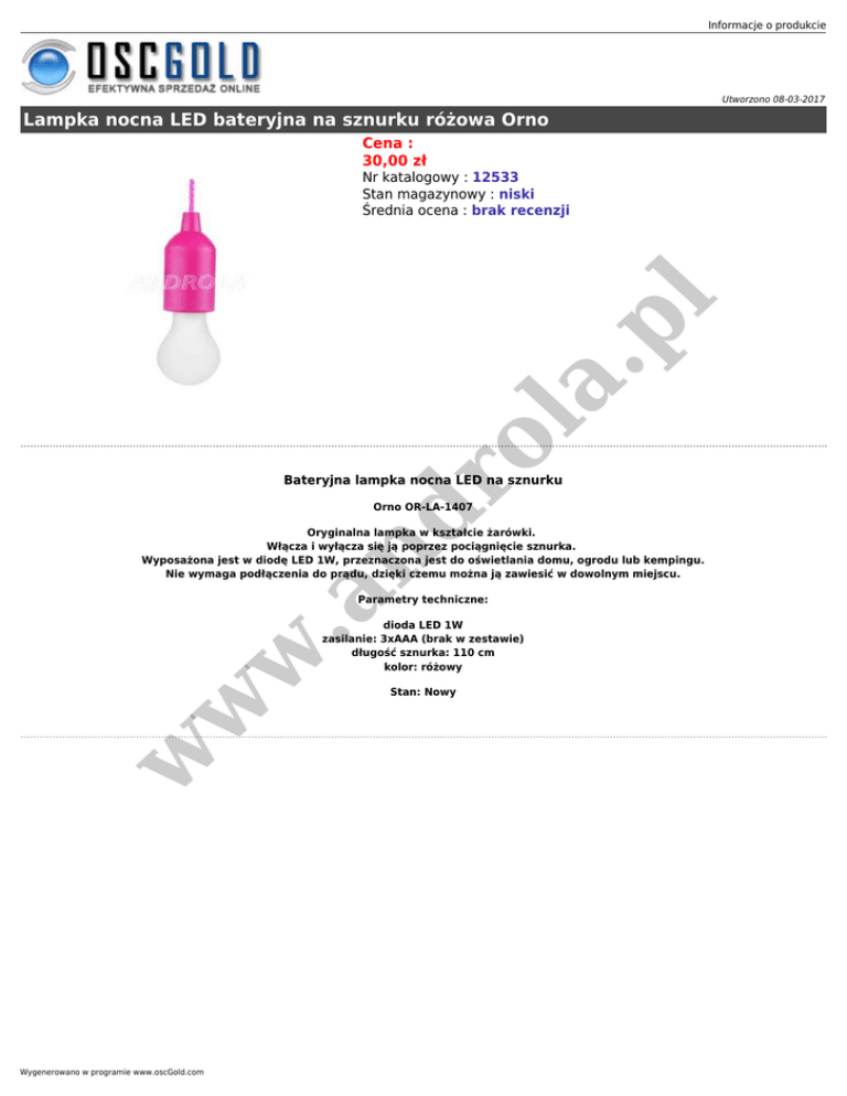 Informacje o produkcie Utworzono 08-03-2017 Lampka nocna LED bateryjna na sznurku różowa Orno Cena : 30,00 zł ro la .p l Nr katalogowy : 12533 Stan magazynowy : niski Średnia ocena : brak recenzji Bateryjna lampka nocna LED na sznurku nd Orno OR-LA-1407 w .a Oryginalna lampka w kształcie żarówki. Włącza i wyłącza się ją poprzez pociągnięcie sznurka. Wyposażona jest w diodę LED 1W, przeznaczona jest do oświetlania domu, ogrodu lub kempingu. Nie wymaga podłączenia do prądu, dzięki czemu można ją zawiesić w dowolnym miejscu. Parametry techniczne: w w dioda LED 1W zasilanie: 3xAAA (brak w zestawie) długość sznurka: 110 cm kolor: różowy Wygenerowano w programie www.oscGold.com Stan: Nowy