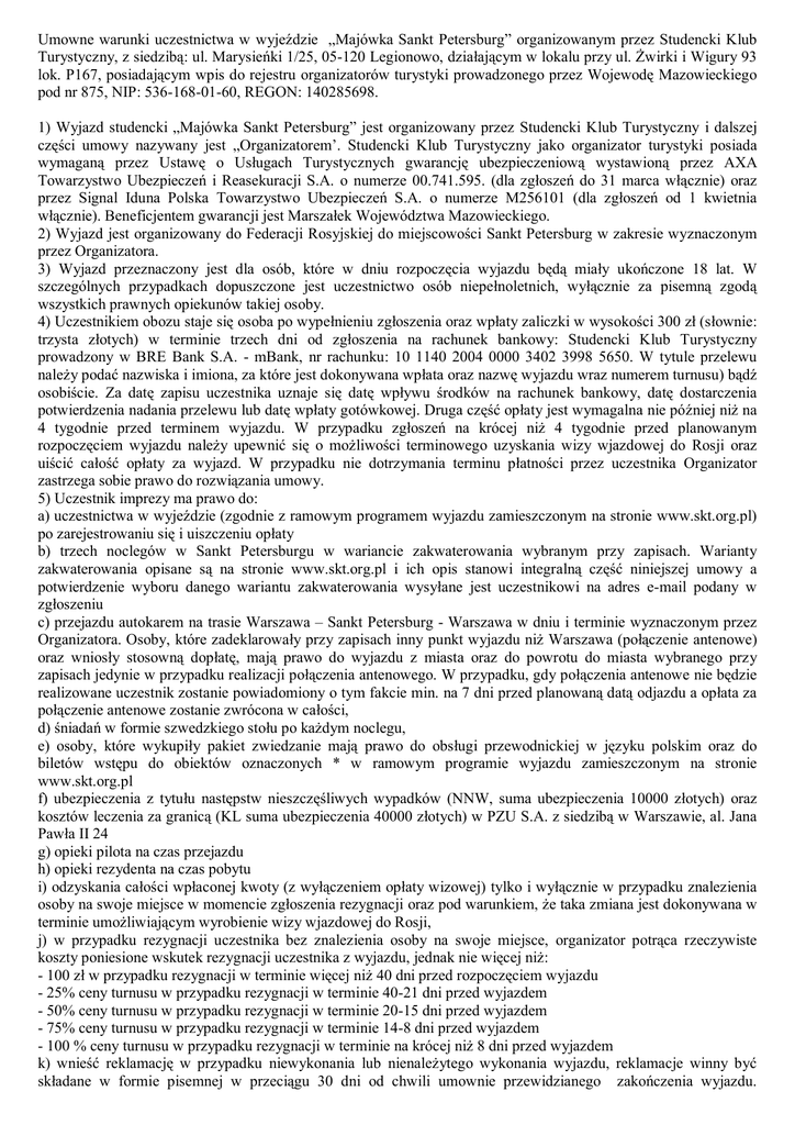 Umowne warunki uczestnictwa w wyjeździe „Majówka Sankt Petersburg” organizowanym przez Studencki Klub Turystyczny, z siedzibą: ul. Marysieńki 1/25, 05-120 Legionowo, działającym w lokalu przy ul. Żwirki i Wigury 93 lok. P167, posiadającym wpis do rejestru organizatorów turystyki prowadzonego przez Wojewodę Mazowieckiego pod nr 875, NIP: 536-168-01-60, REGON: 140285698. 1) Wyjazd studencki „Majówka Sankt Petersburg” jest organizowany przez Studencki Klub Turystyczny i dalszej części umowy nazywany jest „Organizatorem’. Studencki Klub Turystyczny jako organizator turystyki posiada wymaganą przez Ustawę o Usługach Turystycznych gwarancję ubezpieczeniową wystawioną przez AXA Towarzystwo Ubezpieczeń i Reasekuracji S.A. o numerze 00.741.595. (dla zgłoszeń do 31 marca włącznie) oraz przez Signal Iduna Polska Towarzystwo Ubezpieczeń S.A. o numerze M256101 (dla zgłoszeń od 1 kwietnia włącznie). Beneficjentem gwarancji jest Marszałek Województwa Mazowieckiego. 2) Wyjazd jest organizowany do Federacji Rosyjskiej do miejscowości Sankt Petersburg w zakresie wyznaczonym przez Organizatora. 3) Wyjazd przeznaczony jest dla osób, które w dniu rozpoczęcia wyjazdu będą miały ukończone 18 lat. W szczególnych przypadkach dopuszczone jest uczestnictwo osób niepełnoletnich, wyłącznie za pisemną zgodą wszystkich prawnych opiekunów takiej osoby. 4) Uczestnikiem obozu staje się osoba po wypełnieniu zgłoszenia oraz wpłaty zaliczki w wysokości 300 zł (słownie: trzysta złotych) w terminie trzech dni od zgłoszenia na rachunek bankowy: Studencki Klub Turystyczny prowadzony w BRE Bank S.A. - mBank, nr rachunku: 10 1140 2004 0000 3402 3998 5650. W tytule przelewu należy podać nazwiska i imiona, za które jest dokonywana wpłata oraz nazwę wyjazdu wraz numerem turnusu) bądź osobiście. Za datę zapisu uczestnika uznaje się datę wpływu środków na rachunek bankowy, datę dostarczenia potwierdzenia nadania przelewu lub datę wpłaty gotówkowej. Druga część opłaty jest wymagalna nie później niż na 4 tygodnie przed terminem wyjazdu. W przypadku zgłoszeń na krócej niż 4 tygodnie przed planowanym rozpoczęciem wyjazdu należy upewnić się o możliwości terminowego uzyskania wizy wjazdowej do Rosji oraz uiścić całość opłaty za wyjazd. W przypadku nie dotrzymania terminu płatności przez uczestnika Organizator zastrzega sobie prawo do rozwiązania umowy. 5) Uczestnik imprezy ma prawo do: a) uczestnictwa w wyjeździe (zgodnie z ramowym programem wyjazdu zamieszczonym na stronie www.skt.org.pl) po zarejestrowaniu się i uiszczeniu opłaty b) trzech noclegów w Sankt Petersburgu w wariancie zakwaterowania wybranym przy zapisach. Warianty zakwaterowania opisane są na stronie www.skt.org.pl i ich opis stanowi integralną część niniejszej umowy a potwierdzenie wyboru danego wariantu zakwaterowania wysyłane jest uczestnikowi na adres e-mail podany w zgłoszeniu c) przejazdu autokarem na trasie Warszawa – Sankt Petersburg - Warszawa w dniu i terminie wyznaczonym przez Organizatora. Osoby, które zadeklarowały przy zapisach inny punkt wyjazdu niż Warszawa (połączenie antenowe) oraz wniosły stosowną dopłatę, mają prawo do wyjazdu z miasta oraz do powrotu do miasta wybranego przy zapisach jedynie w przypadku realizacji połączenia antenowego. W przypadku, gdy połączenia antenowe nie będzie realizowane uczestnik zostanie powiadomiony o tym fakcie min. na 7 dni przed planowaną datą odjazdu a opłata za połączenie antenowe zostanie zwrócona w całości, d) śniadań w formie szwedzkiego stołu po każdym noclegu, e) osoby, które wykupiły pakiet zwiedzanie mają prawo do obsługi przewodnickiej w języku polskim oraz do biletów wstępu do obiektów oznaczonych * w ramowym programie wyjazdu zamieszczonym na stronie www.skt.org.pl f) ubezpieczenia z tytułu następstw nieszczęśliwych wypadków (NNW, suma ubezpieczenia 10000 złotych) oraz kosztów leczenia za granicą (KL suma ubezpieczenia 40000 złotych) w PZU S.A. z siedzibą w Warszawie, al. Jana Pawła II 24 g) opieki pilota na czas przejazdu h) opieki rezydenta na czas pobytu i) odzyskania całości wpłaconej kwoty (z wyłączeniem opłaty wizowej) tylko i wyłącznie w przypadku znalezienia osoby na swoje miejsce w momencie zgłoszenia rezygnacji oraz pod warunkiem, że taka zmiana jest dokonywana w terminie umożliwiającym wyrobienie wizy wjazdowej do Rosji, j) w przypadku rezygnacji uczestnika bez znalezienia osoby na swoje miejsce, organizator potrąca rzeczywiste koszty poniesione wskutek rezygnacji uczestnika z wyjazdu, jednak nie więcej niż: - 100 zł w przypadku rezygnacji w terminie więcej niż 40 dni przed rozpoczęciem wyjazdu - 25% ceny turnusu w przypadku rezygnacji w terminie 40-21 dni przed wyjazdem - 50% ceny turnusu w przypadku rezygnacji w terminie 20-15 dni przed wyjazdem - 75% ceny turnusu w przypadku rezygnacji w terminie 14-8 dni przed wyjazdem - 100 % ceny turnusu w przypadku rezygnacji w terminie na krócej niż 8 dni przed wyjazdem k) wnieść reklamację w przypadku niewykonania lub nienależytego wykonania wyjazdu, reklamacje winny być składane w formie pisemnej w przeciągu 30 dni od chwili umownie przewidzianego zakończenia wyjazdu. Reklamację będą rozpatrywane przez Organizatora w terminach przewidzianych przez obowiązujące w tym zakresie przepisy prawa a przysługujące na podstawie tej umowy roszczenia ulegają przedawnieniu na zasadach ogólnych określonych przepisami Kodeksu Cywilnego. Jednocześnie Organizator ogranicza swoją odpowiedzialność (na warunkach określonych w art. 11b ustawy o usługach turystycznych) z tytułu niewykonania lub nienależytego wykonania usługi do dwukrotności ceny wyjazdu względem każdego Uczestnika. 6) Uczestnik oświadcza, iż wszystkie podane przy zapisach dane są prawdziwe 7) W przypadku zapisywania przez 1 osobę większej liczby uczestników uznaje się, iż wszystkie osoby 