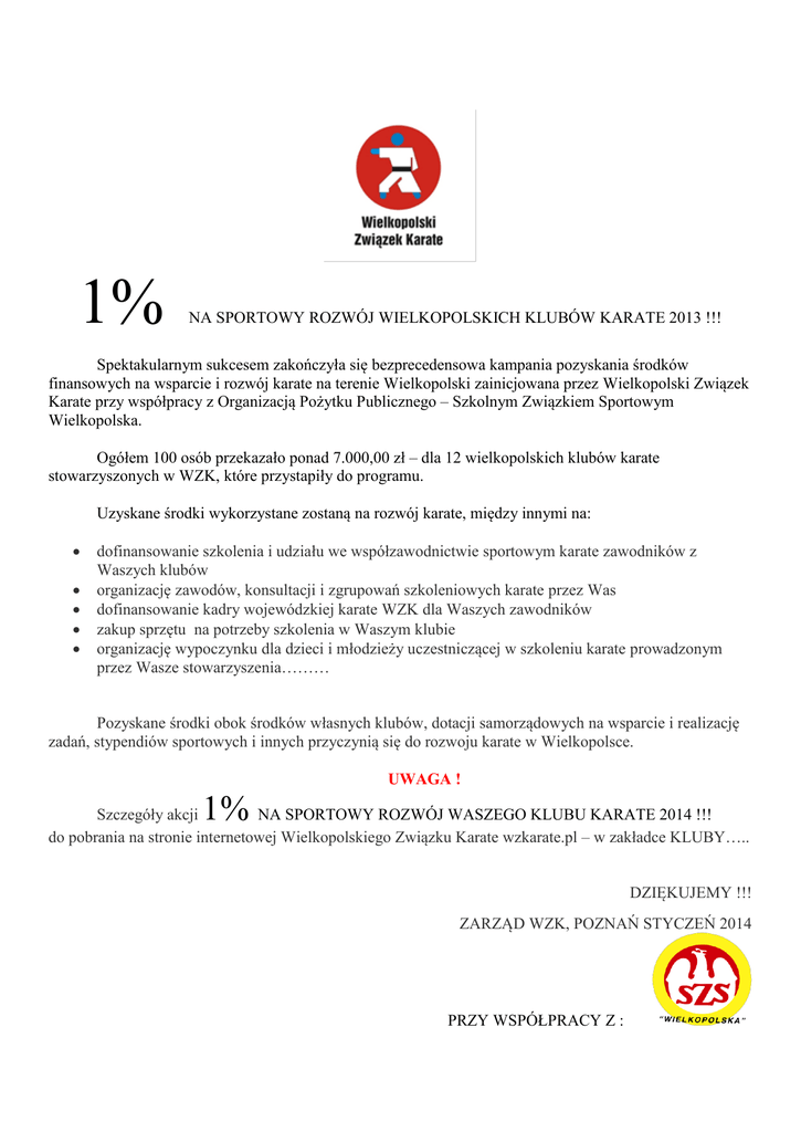 1% NA SPORTOWY ROZWÓJ WIELKOPOLSKICH KLUBÓW KARATE 2013 !!! Spektakularnym sukcesem zakończyła się bezprecedensowa kampania pozyskania środków finansowych na wsparcie i rozwój karate na terenie Wielkopolski zainicjowana przez Wielkopolski Związek Karate przy współpracy z Organizacją Pożytku Publicznego – Szkolnym Związkiem Sportowym Wielkopolska. Ogółem 100 osób przekazało ponad 7.000,00 zł – dla 12 wielkopolskich klubów karate stowarzyszonych w WZK, które przystapiły do programu. Uzyskane środki wykorzystane zostaną na rozwój karate, między innymi na: dofinansowanie szkolenia i udziału we współzawodnictwie sportowym karate zawodników z Waszych klubów organizację zawodów, konsultacji i zgrupowań szkoleniowych karate przez Was dofinansowanie kadry wojewódzkiej karate WZK dla Waszych zawodników zakup sprzętu na potrzeby szkolenia w Waszym klubie organizację wypoczynku dla dzieci i młodzieży uczestniczącej w szkoleniu karate prowadzonym przez Wasze stowarzyszenia……… Pozyskane środki obok środków własnych klubów, dotacji samorządowych na wsparcie i realizację zadań, stypendiów sportowych i innych przyczynią się do rozwoju karate w Wielkopolsce. UWAGA ! 1% Szczegóły akcji NA SPORTOWY ROZWÓJ WASZEGO KLUBU KARATE 2014 !!! do pobrania na stronie internetowej Wielkopolskiego Związku Karate wzkarate.pl – w zakładce KLUBY….. DZIĘKUJEMY !!! ZARZĄD WZK, POZNAŃ STYCZEŃ 2014 PRZY WSPÓŁPRACY Z :
