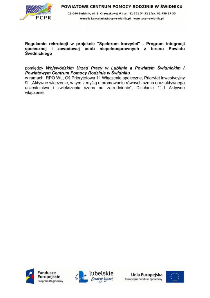 Regulamin rekrutacji w projekcie "Spektrum korzyści" - Program integracji społecznej i zawodowej osób niepełnosprawnych z terenu Powiatu Świdnickiego pomiędzy Wojewódzkim Urząd Pracy w Lublinie a Powiatem Świdnickim / Powiatowym Centrum Pomocy Rodzinie w Świdniku w ramach RPO WL, Oś Priorytetowa 11 Włączenie społeczne, Priorytet inwestycyjny 9i: „Aktywne włączenie, w tym z myślą o promowaniu równych szans oraz aktywnego uczestnictwa i zwiększaniu szans na zatrudnienie”, Działanie 11.1 Aktywne włączenie. Słownik pojęć i skrótów: 1. EFS – Europejski Fundusz Społeczny. 2. RPO WL – Regionalny Program Operacyjny Województwa Lubelskiego. 3. Projekt – Projekt "Spektrum korzyści" - Program integracji społecznej i zawodowej osób niepełnosprawnych z terenu Powiatu Świdnickiego, realizowany w ramach RPO WL, Oś Priorytetowa 11 Włączenie społeczne, Priorytet inwestycyjny 9i: „Aktywne włączenie, w tym z myślą o promowaniu równych szans oraz aktywnego uczestnictwa i zwiększaniu szans na zatrudnienie”, Działanie 11.1 Aktywne włączenie. 4. Beneficjent projektu – Powiat Świdnicki 5. Realizator projektu – Powiatowe Centrum Pomocy Rodzinie w Świdniku 6. Uczestnik projektu, zwany dalej „UP” – osoba, spełniająca kryterium grupy docelowej, zakwalifikowana do udziału w projekcie, której udzielono wsparcia w ramach projektu. 7. Grupa docelowa – kategorie uczestników projektu, którzy zaliczani są do osób i rodzin zagrożonych ubóstwem lub wykluczeniem społecznym. Grupę docelową tworzą osoby niepełnosprawne, między innymi w rozumieniu ustawy z dnia 27 sierpnia 1997 r. o rehabilitacji zawodowej i społecznej oraz zatrudnianiu osób niepełnosprawnych zamieszkujące powiat świdnicki, bez względu na płeć, wiek, rasę lub pochodzenie etniczne, wyznawaną religię lub światopogląd oraz orientację seksualną. 8. ON – osoba z niepełnosprawnością, posiadająca orzeczenie zaliczające do lekkiego, umiarkowanego lub znacznego stopnia niepełnosprawności, albo osoba z zaburzeniami psychicznymi, w rozumieniu ustawy z dnia 19 sierpnia 1994r. o ochronie zdrowia psychicznego (Dz.U. z 2011 r. Nr 231, poz. 1375). 9. Biuro projektu - siedziba realizatora, tzn. w siedziba Powiatowego Centrum Pomocy Rodzinie w Świdniku, ul. Orzeszkowej 6, 21 – 040 Świdnik §1 Postanowienia ogólne 1. Niniejszy regulamin określa warunki rekrutacji w Projekcie: "Spektrum korzyści" Program integracji społecznej i zawodowej osób niepełnosprawnych z terenu Powiatu Świdnickiego. 2. Projekt realizowany jest w okresie od dnia 1 października 2016 r. do dnia 31 maja 2018 r., na terenie powiatu świdnickiego na podstawie umowy o dofinansowanie. 3. Projekt dofinansowany jest z Funduszy Europejskich w ramach Regionalnego Programu Operacyjnego Województwa Lubelskiego 2014-2020. 4. Biuro projektu czynne jest w godzinach urzędowania PCPR Świdnik. 5. Działania projektowe będą podejmowane wśród niepełnosprawnych mieszkańców i mieszkanek powiatu świdnickiego. 6. Celem projektu jest włączenie społeczne 100 osób zagrożonych ubóstwem lub wykluczeniem społecznym, tzn. osób niepełnosprawnych z terenu Powiatu Świdnickiego do aktywnego uczestnictwa w życiu społeczno-zawodowym poprzez pomoc w znalezieniu zatrudnienia, wzrost integracji społecznej i poprawę dostępu do pracy dzięki uczestnictwie w stażach zawodowych, kursach i szkoleniach. 7. Udział w projekcie jest bezpłatny. §3 Uczestnicy projektu Uczestnikami projektu mogą być osoby zagrożone wykluczeniem społecznym, spełniające następujące warunki formalne: 1. będące osobami niepełnosprawnymi w rozumieniu ustawy z dnia 27 sierpnia 1997 r. o rehabilitacji zawodowej i społecznej oraz zatrudnianiu osób niepełnosprawnych (Dz. U. z 2011 r. Nr 127, poz. 721, z późn. zm.) lub będące osobami z zaburzeniami psychicznymi w rozumieniu ustawy z dnia 19 sierpnia 1994 r. o ochronie zdrowia psychicznego (Dz. U. z 2011 r. Nr 231, poz. 1375 z późn. zm.); 2. zamieszkałe na terenie powiatu świdnickiego; 3. w dniu przystąpienia do projektu będące osobami pełnoletnimi, w wieku aktywności zawodowej. §4 Proces rekrutacji 1. Za rekrutację do projektu odpowiada Realizator projektu, na zasadach określonych w niniejszym regulaminie. 2. Rekrutacja będzie realizowana przez pracowników projektu, w biurze projektu, tzn. w budynku PCPR Świdnik, ul. Orzeszkowej 6, 21–040 Świdnik, który jest dostępny i przystosowany dla osób niepełnosprawnych. 3. Rekrutacja odbywać się będzie z uwzględnieniem zasady równych szans, w tym zasady równości płci. Realizator zakłada równy dostęp do projektu zarówno kobiet, jak i mężczyzn znajdujących się w grupie potencjalnych Uczestników projektu. 4. Realizator zapewni możliwie szeroki dostęp do uczestnictwa w Projekcie potencjalnym beneficjentom projektu, przy zagwarantowaniu bezstronności i przejrzystości zastosowanych procedur rekrutacyjnych. 5. Kandydaci, przed złożeniem formularza zgłoszeniowego, mają obowiązek zapoznać się z całością tekstu niniejszego regulaminu. 6. Niniejszy regulamin oraz dokumenty rekrutacyjne dostępne będą na stronie internetowej www.pcpr-swidnik.pl oraz w Biurze projektu. 7. Dokumenty rekrutacyjne przyjmowane będą w Biurze projektu. Rozpatrywane będą jedynie zgłoszenia wypełnione na właściwym formularzu zgłoszeniowym, opatrzone datą i podpisem kandydata, zawierające załączniki o których mowa w § 4 ust. 16. Za datę dokonania zgłoszenia przyjmuje się datę, w której złożone zostały wszystkie wymagane dokumenty. 8. Częstotliwość prowadzenia rekrutacji: a. rekrutacja główna przeprowadzona będzie w okresie pierwszych trzech miesięcy realizacji projektu; b. osoby niezakwalifikowane do projektu z powodu braku wolnych miejsc wpisane zostaną na listę rezerwową, z której będą mogły zostać zakwalifikowane do uczestnictwa w przypadku rezygnacji uczestnika proj