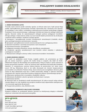 POGLĄDOWY ZAKRES DZIAŁALNOŚCI Hasłem naszej firmy jest „Promocja zieleni” – dbałość o estetykę, zdrowie i bezpieczeństwo naszego otoczenia 1. OKRES WIOSENNO-LETNI Trawnik często stanowi punkt centralny ogrodu, na którym tętni życie, bądź panuje błogi spokój. Uporządkowana powierzchnia trawnika wprowadza ład i harmonię oraz sprawia, że sąsiadujące z nim rośliny i architektura nabierają jeszcze bardziej atrakcyjnego wyglądu. Posiadanie równo przystrzyżonego i zadbanego trawnika jest dumą nie jednego właściciela ogrodu. Koszenie należy do najważniejszych zabiegów podczas pielęgnacji trawników. Od tego zabiegu w dużej mierze zależy czy nasz trawnik będzie prezentował się atrakcyjnie i podnosił walory ozdobne i użytkowe naszego ogrodu. A. Sprzątanie i porządkowanie terenów zewnętrznych utwardzonych (chodniki, uliczki, place, parkingi) sprzętem mechanicznym i ręcznym. B. Sprzątanie i porządkowanie terenów nieutwardzonych wraz z pielęgnacją zieleni: a. Koszenie trawników z wywózka nieczystości z tym związanych. b. Przycinanie krzewów i żywopłotów. c. Pielęgnacja trawników (koszenie, aeracja, skaryfikacja, nawadnianie). d. Urządzanie ogrodów przydomowych oraz terenów zieleni miejskiej i zakładowej („ekologiczne trawniki”). e. Wykonywanie zabiegów ochrony roślin/ nawożenie trawników i kwietników. 2. OKRES JESIENNO-ZIMOWY Biały puch na podjeździe przed bramą wygląda pięknie, ale przestajemy go lubić, gdy nie można wyjechać z garażu lub trzeba brnąć w zaspach, aby dojść do furtki. Odśnieżanie łopatą nie dla każdego jest przyjemnością. Śnieg na dachu w porze zimowej to bardzo powszechne zjawisko - może on stwarzać duże zagrożenie dla konstrukcji budynku. Zaledwie 15 centymetrowa warstwa lodowo-śnieżna na powierzchni 1m2 może ważyć nawet 150 kg. Odśnieżony dach to nie tylko obowiązek ale również bezpieczeństwo pracowników oraz klientów Państwa firmy. Sezon zimowy jest szczególnym okresem, gdzie sprzęt do akcji odśnieżania musi być w 100% niezawodny, dlatego w zakresie zimowego utrzymania ulic i placów nasza firma świadczy usługi przy pomocy sprawdzonego sprzętu. A. Odkurzanie i grabienie liści z trawników, chodników i placów. B. Odśnieżanie chodników i placów sprzętem mechanicznym i ręcznym. C. Odśnieżanie dachów. D. Skuwanie lodu na chodnikach osiedli mieszkaniowych. W zakres naszych usług wchodzi również dbanie o to, aby chodniki oraz przejścia osiedlowe były odpowiednio zabezpieczone i nie stwarzały zagrożenia dla pieszych. E. Posypywanie piaskiem, solą, chlorkiem sodu. 3. PRODUKCJA I KOMPOSTU ORAZ KORY OZDOBNEJ Kompost zwiększa on urodzajność plonów, pozwala na rekultywację ubogiej w składniki odżywcze i mineralne lub zanieczyszczonej gleby. pro-green Wrocław kom. 604 497 092 kom. 660 537 105 e-mail: [email protected] www.pro-green.pl USŁUGI ANTYGRAFFITI 1. GRAFFITI Zabrudzone ściany graffiti budynków narażone są na szybszą od naturalnej degradację, gdyż nienaturalne powłoki graffiti izolują „oddychanie” tynku, co wpływa na odpadanie i łuszczenie się warstw elewacyjnych, a co za tym idzie konieczność ich naprawy i ponoszenia kosztów przedwczesnego remontu. Występowanie graffiti w dzielnicach mieszkalnych czy ośrodkach kultury i turystyki jest symptomem „zagrożenia” dla normalnego współżycia społecznego. Jego powstawanie w ośrodkach użyteczności publicznej jest czynnikiem „odstraszającym”, czy to nowych lokatorów dzielnic lub turystów, co ma nie bagatelny wpływ na opinie i rozwój danego regionu. 2. USŁUGI ANTYGRAFFITI Nasz system jest technologią unikatową, ponieważ pozwala przy uprzednim zastosowaniu preparatów zabezpieczających usunąć zabrudzenia graffiti, nie naruszając podłoża, na którym ono występuje, co umożliwia przywrócenie pierwotnego stanu czyszczonej powierzchni. Preparaty mają zastosowanie zarówno w pomieszczeniach zamkniętych jak i na zewnątrz. Najistotniejszym aspektem technologii jest zabezpieczanie powierzchni przed graffiti, gdyż działania te mają uzasadnienie w zdecydowanie mniejszych kosztach usuwania zabrudzenia i dają 100% pewność uzyskania tego efektu. 3. CO NAS ODRÓŻNIA NAS OD INNCH FIRM? Nasze usługi charakteryzują się dwoma kierunkami działań wzajemnie się uzupełniającymi: A. PROFILAKTYKA - zabezpieczanie powierzchni przed graffiti. B. INTERWENCJA - chemiczne czyszczenie graffiti z powierzchni niezabezpieczonej. A. ZABEZPIECZENIE POWIERZCHNI PRZED GRAFFITI Zabezpieczenie powierzchni przed graffiti polega na pokryciu fragmentu np. elewacji (na całej szerokości do wysokości około 3 - 4 m) preparatem, który nakłada się w kilku warstwach (ilość warstw uzależniona od typu powierzchni) najlepiej metodą natryskową, dzięki czemu uzyskuje się trwałą i prawie niewidoczną, zmywalną powłokę ochronną, która izoluje powierzchnię elewacji od wszelkich zabrudzeń. Dzięki tej powłoce zabrudzenie wykonane lakierem w aerozolu - graffiti nie wiąże się w sposób trwały ze strukturą materiału elewacyjnego, lecz utrzymuje się na wierzchniej warstwie powłoki ochronnej i usuwane jest w 100%, przy zastosowaniu płukania gorącą wodą (około 90°C) pod ciśnieniem. Po usunięciu graffiti należy ponownie nałożyć (odnowić) warstwę zabezpieczenia (w miejscu przeprowadzonego czyszczenia). B. CHEMICZNE USUWANIE GRAFFITI Chemiczne usuwanie graffiti polega na pokryciu zabrudzonej powierzchni odpowiednim środkiem, a następnie gorąco - wodnym płukaniu najlepiej pod ciśnieniem. Jest metodą zazwyczaj czasochłonną (zwłaszcza na powierzchniach porowatych), wymagającą zastosowania wyważonych operacji mających na celu zlikwidowanie graffiti w sposób nie uszkadzający czyszczonej powierzchni. pro-green Wrocław kom. 604 497 092 kom. 660 537 105 e-mail: [email protected] www.pro-green.pl USŁUGI PORZĄDKOWE - KOMPLEKSOWA OBSŁUG