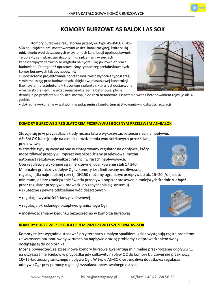 KARTA KATALOGOWA KOMÓR BURZOWYCH KOMORY BURZOWE AS BALOK i AS SOK Komory burzowe z regulatorem przepływu typu AS–BALOK i AS– SOK są urządzeniami montowanymi w sieci kanalizacyjnej, które służą oddzieleniu wód deszczowych w systemach kanalizacji ogólnospławnej. Te obiekty są najbardziej złożonymi urządzeniami w sieciach kanalizacyjnych zarówno ze względu na hydraulikę jak również prace budowlane. Dlatego też opracowaliśmy typoszereg prefabrykowanych komór burzowych tak aby zapewnić: • uproszczenie projektowania poprzez możliwość wyboru z typoszeregu • minimalizację prac budowlanych, dzięki dwupłaszczowej konstrukcji (tzw. system plastobetonu – traconego szalunku), która jest dostarczona wraz ze zbrojeniem. Te urządzenia osadza się na betonowej płycie dennej a po przyłączeniu do sieci można je od razu betonować. Osadzenie wraz z betonowaniem zajmuje ok. 4 godzin. • dokładne wykonanie w wytwórni w połączeniu z komfortem użytkowania – możliwość regulacji KOMORY BURZOWE Z REGULATOREM PRZEPŁYWU I BOCZNYM PRZELEWEM AS–BALOK Stosuje się je w przypadkach kiedy można łatwo wykorzystać retencje sieci na napływie. AS–BALOK funkcjonuje na zasadzie rozdzielenia wód ściekowych przez ścianę przelewową. Wszystkie typy są wyposażone w zintegrowany regulator na odpływie, który może zdławić przepływ. Poprzez wysokość ściany przelewowej można natomiast regulować wielkość retencji w rurach napływowych. Oba regulatory wykonane są z nierdzewnej ocynkowanej stali 17 240. Minimalny graniczny odpływ Qgr z komory jest limitowany możliwością regulacji (dla najmniejszej rury tj. DN150 możemy ograniczyć przepływ do ok. 15–20 l/s i jest to minimum, dalsze zmniejszanie światła przepływu poprzez stosowanie mniejszych średnic rur bądź przez regulator przepływu, prowadzi do zapychania się systemu). • skuteczne i pewne oddzielenie wód deszczowych • regulacja wysokości ściany przelewowej • regulacja określonego przepływu granicznego Qgr • możliwość zmiany kierunku bezpośrednio w komorze burzowej KOMORY BURZOWE Z REGULATOREM PRZEPŁYWU I SZCZELINĄ AS–SOK Komory te jest wygodnie stosować przy terenach z małym spadkiem, gdzie występują częste problemy ze wzrostem poziomu wody w rurach na napływie oraz są problemy z odprowadzeniem wody odciążającej do odbiornika. Można powiedzieć, że szczelinowe komory burzowe gwarantują minimalne przekroczenie odpływu QC na oczyszczalnie ścieków w przypadku gdy całkowity napływ QC do komory burzowej nie przekroczy 10–15-krotności granicznego napływu Qgr. W typie AS–SOK jest możliwa dodatkowa regulacja odpływu Qgr przy pomocy regulacji wysokości przesuwalnego ostrza. www.maragency.pl [email protected] tel/fax: + 48 42 658 58 36 1 KARTA KATALOGOWA KOMÓR BURZOWYCH • prosta eksploatacja • minimalne problemy z odkładaniem się osadu • wychwycenie znacznych ilości zanieczyszczeń z pierwszej fali burzowej • w rurze napływowej nie występuje podwyższenie poziomu • możliwość regulacji zakładanego napływu Qgr TYPOSZEREG KOMÓR BURZOWYCH AS–BALOK/PB Typoszereg komór burzowych AS–BALOK/PB Typ L B H* hv ho 1 ho 2 D mm Waga Objętość betonu kg m AS-BALOK 0/400 3400 1300 2400 450 425 200 300, 400 880 4,9 AS-BALOK 0/600 4700 1800 2400 450 410 200 500, 600 1340 8,6 AS-BALOK 0/800 5700 2470 2500 450 400 200 800 1880 14 AS-BALOK K/600 0 2470 2300 450 425 200 300, 400, 500, 600 920 4,8 AS-BALOK K/800 0 3670 2300 450 415 200 800 1520 8,8 www.maragency.pl [email protected] tel/fax: + 48 42 658 58 36 2 KARTA KATALOGOWA KOMÓR BURZOWYCH * Typowa wysokość urządzenia (w przypadku potrzeby można zmienić) Typoszereg komór burzowych AS–SOK/PB www.maragency.pl [email protected] tel/fax: + 48 42 658 58 36 3 KARTA KATALOGOWA KOMÓR BURZOWYCH Typoszereg komór burzowych AS–SOK/PB Typ AS-SOK 400 AS-SOK 600 AS-SOK 800 AS-SOK 1000 AS-SOK 1200 L 2400 3400 4550 5400 6550 B 1300 1300 1300 1800 1800 H* hv 2500 600 2700 800 2700 900 2900 1100 2900 1300 D mm 300,4 500,6 800 1000 1200 d* s** Waga Objętość betonu 75, 100 125, 150 200 250 300 kg 860 1150 1580 2120 2690 m3 3,9 6 10,4 16,3 18,3 z** 300 500 400 700 400 800 500 1000 600 1200 *maksymalna wielkość dla danego typu urządzenia, ** zalecane wielkości do danego typu urządzenia SCHEMAT OZNAKOWANIA KOMÓR BURZOWYCH OZNACZENIE TYPÓW KOMÓR BURZOWYCH Komory burzowe są oznaczone wg następującego schematu: AS–TYP/ xxx/ yy/ z Typ komory burzowej – SOK … szczelinowa komora burzowa – BALOK O … komora burzowa z równą ścianą przelewową (komora owalna) – BALOK K … komora burzowa ze ścianą łukową (komora okrągła) xxx wielkość urządzenia wg wielkości rury napływowej yy wielkość otworu rewizyjnego w cm – 100 … przy użyciu prefabrykowanego kręgu – 60, 80 … przy bezpośrednim osadzeniu pokrywy z wersja wykonania urządzenia – PPn … plastikowa komora z PP do obetonowania – PB … konstrukcja dwupłaszczowa betono – plastik, samonośna. Beton wlewany w dwupłaszcz na miejscu budowy www.maragency.pl [email protected] tel/fax: + 48 42 658 58 36 4 KARTA KATALOGOWA KOMÓR BURZOWYCH Przykład: AS–BALOK K/600 oznacza komorę burzową z łukową ścianą przelewową (komora okrągła) DN 300-600 Konstrukcja typu „PB” jest pomyślana jako dwupłaszczowy plastikowy szkielet wyposażony w tradycyjne zbrojenie (zasada traconego szalunku). Do zalet tego systemu należą: • szybkie i proste osadzenie i podłączenie do kanalizacji, • betonowanie na miejscu bez dalszych prac zbrojeniowych i szalunkowych, łącznie z płytą stropową, • czas osadzenia, podłączenia i betonowania to około 4 godz, • 100 % ochrona betonu przez korozją, • 100 % szczelność przed nasiąkaniem wód gruntowych. www.maragency.pl [email protected] tel/fax: + 48 42 658 58 36 5