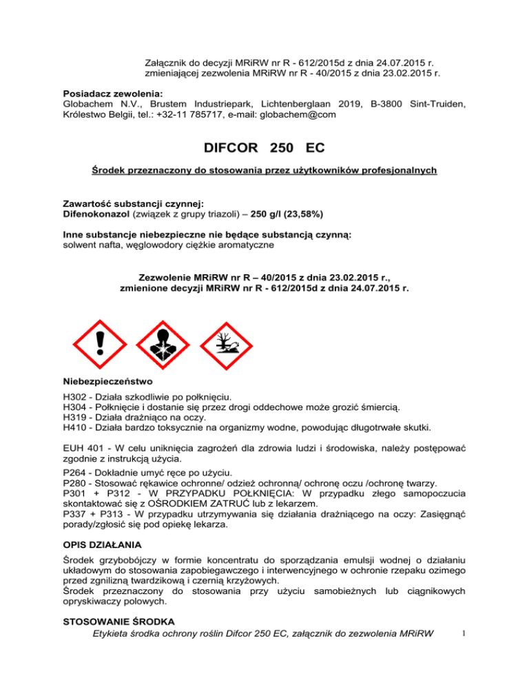 Załącznik do decyzji MRiRW nr R - 612/2015d z dnia 24.07.2015 r. zmieniającej zezwolenia MRiRW nr R - 40/2015 z dnia 23.02.2015 r. Posiadacz zewolenia: Globachem N.V., Brustem Industriepark, Lichtenberglaan 2019, B-3800 Sint-Truiden, Królestwo Belgii, tel.: +32-11 785717, e-mail: globachem@com DIFCOR 250 EC Środek przeznaczony do stosowania przez użytkowników profesjonalnych Zawartość substancji czynnej: Difenokonazol (związek z grupy triazoli) – 250 g/l (23,58%) Inne substancje niebezpieczne nie będące substancją czynną: solwent nafta, węglowodory ciężkie aromatyczne Zezwolenie MRiRW nr R – 40/2015 z dnia 23.02.2015 r., zmienione decyzji MRiRW nr R - 612/2015d z dnia 24.07.2015 r. Niebezpieczeństwo H302 - Działa szkodliwie po połknięciu. H304 - Połknięcie i dostanie się przez drogi oddechowe może grozić śmiercią. H319 - Działa drażniąco na oczy. H410 - Działa bardzo toksycznie na organizmy wodne, powodując długotrwałe skutki. EUH 401 - W celu uniknięcia zagrożeń dla zdrowia ludzi i środowiska, należy postępować zgodnie z instrukcją użycia. P264 - Dokładnie umyć ręce po użyciu. P280 - Stosować rękawice ochronne/ odzież ochronną/ ochronę oczu /ochronę twarzy. P301 + P312 - W PRZYPADKU POŁKNIĘCIA: W przypadku złego samopoczucia skontaktować się z OŚRODKIEM ZATRUĆ lub z lekarzem. P337 + P313 - W przypadku utrzymywania się działania drażniącego na oczy: Zasięgnąć porady/zgłosić się pod opiekę lekarza. OPIS DZIAŁANIA Środek grzybobójczy w formie koncentratu do sporządzania emulsji wodnej o działaniu układowym do stosowania zapobiegawczego i interwencyjnego w ochronie rzepaku ozimego przed zgnilizną twardzikową i czernią krzyżowych. Środek przeznaczony do stosowania przy użyciu samobieżnych lub ciągnikowych opryskiwaczy polowych. STOSOWANIE ŚRODKA Etykieta środka ochrony roślin Difcor 250 EC, załącznik do zezwolenia MRiRW 1 Rzepak ozimy Czerń krzyżowych, zgnilizna twardzikowa Maksymalna/zalecana dawka dla jednorazowego zastosowania: 0,5 l/ha. Termin stosowania: Stosować od początku fazy kwitnienia do pełni kwitnienia (ok. 50% kwiatów otwartych) (BBCH 60-65). Środek stosować zapobiegawczo lub po zauważeniu pierwszych objawów choroby. Maksymalna liczba zabiegów w sezonie wegetacyjnym: 1. Zalecana ilość wody: 100 - 400 l/ha. Zalecane opryskiwanie: drobnokropliste. ŚRODKI OSTROŻNOŚCI I ZALECENIA STOSOWANIA ZWIĄZANE Z DOBRĄ PRAKTYKĄ ROLNICZĄ 1. Środek stosować w temperaturze powietrza powyżej 120C. 2. Środek stosować przemiennie z fungicydami należącymi do innych grup chemicznych. SPORZĄDZANIE CIECZY UŻYTKOWEJ Przed przystąpieniem do sporządzania cieczy użytkowej dokładnie ustalić potrzebną jej ilość. Odmierzoną ilość środka wlać do zbiornika opryskiwacza napełnionego częściowo wodą (z włączonym mieszadłem) i uzupełnić wodą do potrzebnej ilości. Po wlaniu środka do zbiornika opryskiwacza nie wyposażonego w mieszadło hydrauliczne ciecz w zbiorniku mechanicznie wymieszać. Opróżnione opakowania przepłukać trzykrotnie wodą, a popłuczyny wlać do zbiornika opryskiwacza z cieczą użytkową. W przypadku przerw w opryskiwaniu przed ponownym przystąpieniem do pracy, dokładnie wymieszać ciecz użytkową w zbiorniku opryskiwacza. POSTĘPOWANIE Z RESZTKAMI CIECZY UŻYTKOWEJ I MYCIE APARATURY Z resztkami cieczy użytkowej po zabiegu należy postępować w sposób ograniczający ryzyko skażenia wód powierzchniowych i podziemnych, w rozumieniu przepisów Prawa wodnego oraz skażenia gruntu, tj.: – po uprzednim rozcieńczeniu zużyć na powierzchni, na której przeprowadzono zabieg, jeżeli jest to możliwe, lub, – unieszkodliwić z wykorzystaniem rozwiązań technicznych zapewniających biologiczną degradację substancji czynnych środków ochrony roślin, lub, – unieszkodliwić w inny sposób, zgodny z przepisami o odpadach. Po pracy aparaturę dokładnie wymyć. Z wodą użytą do mycia aparatury postąpić tak, jak z resztkami cieczy użytkowej, stosując te same środki ochrony osobistej. WARUNKI BEZPIECZNEGO STOSOWANIA ŚRODKA Przed zastosowaniem środka należy poinformować o tym fakcie wszystkie zainteresowane strony, które mogą być narażone na znoszenie cieczy użytkowej i które zwróciły się o taką informację. Środki ostrożności dla osób stosujących środek: Nie jeść, nie pić ani nie palić podczas używania produktu. Stosować rękawice ochronne oraz odzież ochronną, zabezpieczającą przed oddziaływaniem środków ochrony roślin, oraz odpowiednie obuwie w trakcie przygotowywania cieczy Etykieta środka ochrony roślin Difcor 250 EC, załącznik do zezwolenia MRiRW 2 roboczej oraz w trakcie wykonywania zabiegu. Zanieczyszczoną odzież zdjąć i wyprać przed ponownym użyciem. Środki ostrożności związane z ochroną środowiska naturalnego: Nie zanieczyszczać wód produktem lub jego opakowaniem. Nie myć aparatury w pobliżu wód powierzchniowych. Unikać zanieczyszczania wód poprzez rowy odwadniające z gospodarstw i dróg. W czasie kwitnienia roślin uprawnych zaleca się stosować środek poza okresami aktywności pszczół. W celu ochrony organizmów wodnych konieczne jest wyznaczenie strefy ochronnej o szerokości 5 m od zbiorników i cieków wodnych. W celu ochrony roślin oraz stawonogów niebędących celem działania środka konieczne jest wyznaczenie strefy ochronnej o szerokości 1 m od terenów nieużytkowanych rolniczo. Okres od zastosowania środka do dnia, w którym na obszar, na którym zastosowano środek mogą wejść ludzie oraz zostać wprowadzone zwierzęta (okres prewencji): Nie wchodzić do czasu całkowitego wyschnięcia cieczy użytkowej na powierzchni roślin. Okres od ostatniego zastosowania środka do dnia zbioru rośliny uprawnej (okres karencji): Rzepak ozimy – 56 dni. Okres od ostatniego zastosowania środka na rośliny przeznaczone na paszę do dnia w którym zwierzęta mog