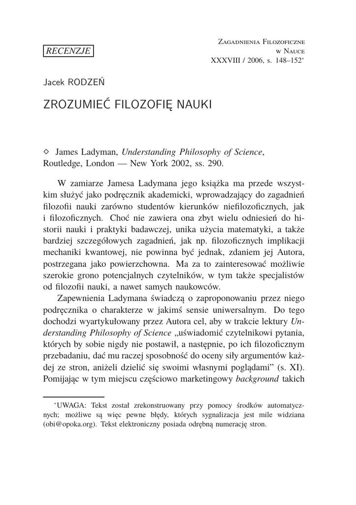 RECENZJE Zagadnienia Filozoficzne w Nauce XXXVIII / 2006, s. 148–152∗ Jacek RODZEŃ ZROZUMIEĆ FILOZOFIĘ NAUKI James Ladyman, Understanding Philosophy of Science, Routledge, London — New York 2002, ss. 290. ⋄ W zamiarze Jamesa Ladymana jego książka ma przede wszystkim służyć jako podręcznik akademicki, wprowadzający do zagadnień filozofii nauki zarówno studentów kierunków niefilozoficznych, jak i filozoficznych. Choć nie zawiera ona zbyt wielu odniesień do historii nauki i praktyki badawczej, unika użycia matematyki, a także bardziej szczegółowych zagadnień, jak np. filozoficznych implikacji mechaniki kwantowej, nie powinna być jednak, zdaniem jej Autora, postrzegana jako powierzchowna. Ma za to zainteresować możliwie szerokie grono potencjalnych czytelników, w tym także specjalistów od filozofii nauki, a nawet samych naukowców. Zapewnienia Ladymana świadczą o zaproponowaniu przez niego podręcznika o charakterze w jakimś sensie uniwersalnym. Do tego dochodzi wyartykułowany przez Autora cel, aby w trakcie lektury Understanding Philosophy of Science „uświadomić czytelnikowi pytania, których by sobie nigdy nie postawił, a następnie, po ich filozoficznym przebadaniu, dać mu raczej sposobność do oceny siły argumentów każdej ze stron, aniżeli dzielić się swoimi własnymi poglądami” (s. XI). Pomijając w tym miejscu częściowo marketingowy background takich ∗ UWAGA: Tekst został zrekonstruowany przy pomocy środków automatycznych; możliwe są więc pewne błędy, których sygnalizacja jest mile widziana ([email protected]). Tekst elektroniczny posiada odrębną numerację stron. 2 Jacek RODZEŃ zapewnień, wypadałoby wniknąć bardziej szczegółowo w strukturę i treść tak zareklamowanego podręcznika. Nawet jeśli się redaguje możliwie uniwersalny, a przy tym bezstronny podręcznik akademicki, jest przypuszczalnie rzeczą niemożliwą wyzbyć się wszelkich własnych preferencji filozoficznych, nawet tych przemycanych implicite. Wydaje się to także dotyczyć książki Ladymana. Już na jej wstępie Autor dzieli się z czytelnikiem określonym rozumieniem filozofii nauki. I tak, według niego, stawia ona pod adresem nauki takie pytania, jakie w długiej swojej historii od zawsze stawiała filozofia, uzyskując na nie odpowiedzi nie w konfrontacji z samą przyrodą (jak badania empiryczne) lub z instytucjonalnymi strukturami społeczności naukowców (jak czyni to socjologia czy psychologia nauki), lecz przez filozoficzną analizę, argumentację i debatę. Dla Ladymana filozofia nauki ani nie jest typem „fotelowej spekulacji” (armchair reflection), ani nie wyraża się w przekonaniu o zasadniczej ciągłości filozofii i badań empirycznych w samej nauce. To ostatnie przekonanie podzielane jest współcześnie przez licznych zwolenników tzw. naturalizmu w filozofii nauki, zacierających różnice między filozofią a naukami empirycznymi. Znając ich niezaprzeczalne „wpływy” w aktualnie toczonych dyskusjach, Ladyman sprytnie zapewnia, iż „nie musi się przyjmować absolutnego rozdziału między filozofią a empirycznymi formami badania, by uznać wyraźne różnice między tymi ostatnimi a dociekaniem problemów filozoficznych zrodzonych z refleksji nad nauką” (s. 4). Jednocześnie Autor Understanding Philosophy of Science skądinąd słusznie zauważa, że wypowiadanie się w tym przypadku o różnicach pozostaje niejasne, dopóki nie postawi się bodajże najważniejszego dla filozofii nauki pytania: „czym jest nauka?”. Pytanie o naturę czy charakter nauki pociąga z kolei kwestię jej odróżnienia od innych form aktywności człowieka. Ladyman dydaktycznie korzysta z okazji pojawienia się tej kwestii, aby zaakcentować doniosły dla filozofii nauki tzw. problem demarkacji, czyli ustalenia kryteriów naukowości. A stąd już tylko krok do stwierdzenia, że natura nauki najpełniej wyraża się w stosowanej przez nią metodzie lub ZROZUMIEĆ FILOZOFIĘ NAUKI 3 metodach i to one stanowią differentia specifica nauki. Oczywiście pozostaje nadal problem demarkacji, gdyż należałoby się obecnie przyjrzeć tym metodom. Dociekania dotyczące metody naukowej (zwane także metodologią nauki) są z kolei, zdaniem Ladymana, priorytetowym zadaniem filozofii nauk. Ponieważ metoda naukowa przede wszystkim wyraża się w sposobach zdobywania i uzasadniania określonego typu wiedzy, rodzi się szereg pytań o charakterze epistemologicznym. Autor Understanding Philosophy of Science dostrzega w tym możliwość nawiązania do tradycyjnych pytań teoriopoznawczych zrelatywizowanych do aktywności naukowej. Dla Ladymana filozofia nauki to jednak nie tylko epistemologia, ale i metafizyka. Tym ostatnim terminem obejmuje on szereg kwestii głównie związanych z interpretacją uzyskiwanej metodycznie wiedzy naukowej. Czy dotyczy ona jedynie obserwowanych zjawisk, czy także odnosi się do realnych, choć często nieobserwowalnych bytów, które są postulowane przez teorie naukowe? Jak się okazuje, problematyka epistemologiczna i metafizyczna wyznacza także strukturę książki Ladymana. Po wstępnych wyjaśnieniach i rozróżnieniach Autor ten dokonał objętościowego podziału swojego podręcznika na dwie niemal równe części. Pierwsza dotyczy natury metody naukowej i skupia się na postulowanej uprzednio problematyce metodologiczno– epistemologicznej. Druga część omawia debatę wokół tzw. realizmu naukowego, w ramach której poruszana jest problematyka epistemologiczno–metafizyczna nauki. Wydaje się, że taki układ, oprócz niewątpliwych zalet dydaktycznych, posiada także ważną zaletę, dającą pewną perspektywę natury historycznej. Patrząc mianowicie na dwudziestowieczną filozofię nauki niejako z lotu ptaka można dostrzec, że w pierwszym jej półwieczu dominowała głównie refleksja (i spory) nad charakterem metody naukowej (empiryzm logiczny, K. Popper), a następnie nad jej racjo