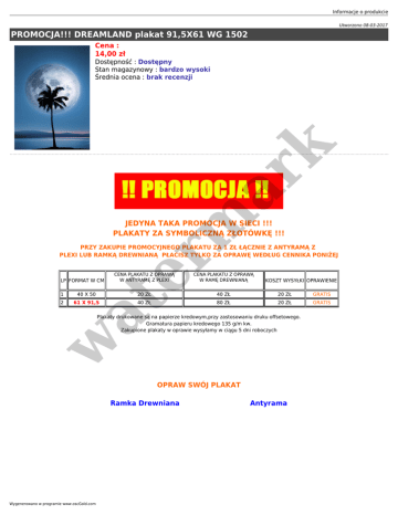 Informacje o produkcie Utworzono 08-03-2017 PROMOCJA!!! DREAMLAND plakat 91,5X61 WG 1502 Cena : 14,00 zł er m ar k Dostępność : Dostępny Stan magazynowy : bardzo wysoki Średnia ocena : brak recenzji JEDYNA TAKA PROMOCJA W SIECI !!! PLAKATY ZA SYMBOLICZNĄ ZŁOTÓWKĘ !!! PRZY ZAKUPIE PROMOCYJNEGO PLAKATU ZA 1 ZŁ ŁĄCZNIE Z ANTYRAMĄ Z PLEXI LUB RAMKĄ DREWNIANĄ PŁACISZ TYLKO ZA OPRAWĘ WEDŁUG CENNIKA PONIŻEJ LP FORMAT W CM 2 40 X 50 CENA PLAKATU Z OPRAWĄ W RAMĘ DREWNIANĄ 20 ZŁ 40 ZŁ 20 ZŁ GRATIS 40 ZŁ 80 ZŁ 20 ZŁ GRATIS at 1 CENA PLAKATU Z OPRAWĄ W ANTYRAMĘ Z PLEXI 61 X 91,5 KOSZT WYSYŁKI OPRAWIENIE w Plakaty drukowane są na papierze kredowym,przy zastosowaniu druku offsetowego. Gramatura papieru kredowego 135 g/m kw. Zakupione plakaty w oprawie wysyłamy w ciągu 5 dni roboczych OPRAW SWÓJ PLAKAT Ramka Drewniana Wygenerowano w programie www.oscGold.com Antyrama er m ar k at ZOBACZ RÓWNIEŻ RAMY DREWNIANE w ANTYRAMY TABLICE KORKOWE PLAKATY w at er m ar k Informacje o produkcie Wygenerowano w programie www.oscGold.com