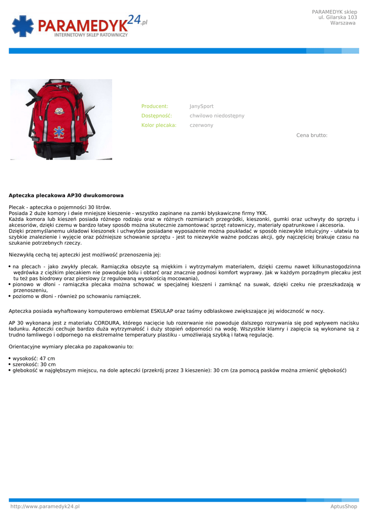PARAMEDYK sklep ul. Gilarska 103 Warszawa Producent: JanySport Dostępność: chwilowo niedostępny Kolor plecaka: czerwony Cena brutto: Apteczka plecakowa AP30 dwukomorowa Plecak - apteczka o pojemności 30 litrów. Posiada 2 duże komory i dwie mniejsze kieszenie - wszystko zapinane na zamki błyskawiczne firmy YKK. Każda komora lub kieszeń posiada różnego rodzaju oraz w różnych rozmiarach przegródki, kieszonki, gumki oraz uchwyty do sprzętu i akcesoriów, dzięki czemu w bardzo łatwy sposób można skutecznie zamontować sprzęt ratowniczy, materiały opatrunkowe i akcesoria. Dzięki przemyślanemu układowi kieszonek i uchwytów posiadane wyposażenie można poukładać w sposób niezwykle intuicyjny - ułatwia to szybkie znalezienie i wyjęcie oraz późniejsze schowanie sprzętu - jest to niezwykle ważne podczas akcji, gdy najczęściej brakuje czasu na szukanie potrzebnych rzeczy. Niezwykłą cechą tej apteczki jest możliwość przenoszenia jej: na plecach - jako zwykły plecak. Ramiączka obszyte są miękkim i wytrzymałym materiałem, dzięki czemu nawet kilkunastogodzinna wędrówka z ciężkim plecakiem nie powoduje bólu i obtarć oraz znacznie podnosi komfort wyprawy. Jak w każdym porządnym plecaku jest tu też pas biodrowy oraz piersiowy (z regulowaną wysokością mocowania), pionowo w dłoni - ramiączka plecaka można schować w specjalnej kieszeni i zamknąć na suwak, dzięki czeku nie przeszkadzają w przenoszeniu, poziomo w dłoni - również po schowaniu ramiączek. Apteczka posiada wyhaftowany komputerowo emblemat ESKULAP oraz taśmy odblaskowe zwiększające jej widoczność w nocy. AP 30 wykonana jest z materiału CORDURA, którego nacięcie lub rozerwanie nie powoduje dalszego rozrywania się pod wpływem nacisku ładunku. Apteczki cechuje bardzo duża wytrzymałość i duży stopień odporności na wodę. Wszystkie klamry i zapięcia są wykonane są z trudno łamliwego i odpornego na ekstremalne temperatury plastiku - umożliwiają szybką i łatwą regulację. Orientacyjne wymiary plecaka po zapakowaniu to: wysokość: 47 cm szerokość: 30 cm głebokość w najgłębszym miejscu, na dole apteczki (przekrój przez 3 kieszenie): 30 cm (za pomocą pasków można zmienić głębokość) http://www.paramedyk24.pl AptusShop
