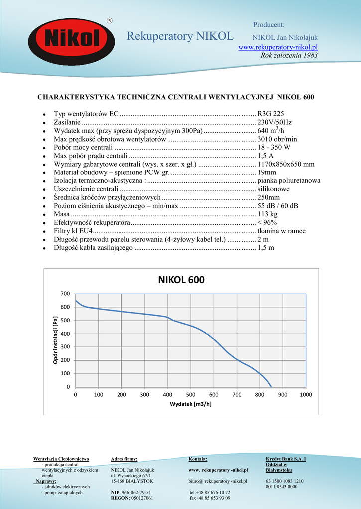 Producent: Rekuperatory NIKOL NIKOL Jan Nikołajuk www.rekuperatory-nikol.pl Rok założenia 1983 CHARAKTERYSTYKA TECHNICZNA CENTRALI WENTYLACYJNEJ NIKOL 600 Typ wentylatorów EC ........................................................................... R3G 225 Zasilanie ................................................................................................ 230V/50Hz Wydatek max (przy sprężu dyspozycyjnym 300Pa) ............................. 640 m3/h Max prędkość obrotowa wentylatorów ................................................. 3010 obr/min Pobór mocy centrali .............................................................................. 18 - 350 W Max pobór prądu centrali ...................................................................... 1,5 A Wymiary gabarytowe centrali (wys. x szer. x gł.) ................................ 1170x850x650 mm Materiał obudowy – spienione PCW gr. ............................................... 19mm Izolacja termiczno-akustyczna : ............................................................ pianka poliuretanowa Uszczelnienie centrali ........................................................................... silikonowe Średnica króćców przyłączeniowych .................................................... 250mm Poziom ciśnienia akustycznego – min/max .......................................... 55 dB / 60 dB Masa ...................................................................................................... 113 kg Efektywność rekuperatora ..................................................................... < 96% Filtry kl EU4 .......................................................................................... tkanina w ramce Długość przewodu panelu sterowania (4-żyłowy kabel tel.) ................ 2 m Długość kabla zasilającego ................................................................... 1,5 m NIKOL 600 700 Opór instalacji [Pa] 600 500 400 300 200 100 0 0 100 200 300 400 500 600 700 800 900 1000 Wydatek [m3/h] Wentylacja Ciepłownictwo - produkcja central wentylacyjnych z odzyskiem ciepła Naprawy: - silników elektrycznych - pomp zatapialnych Adres firmy: Kontakt: NIKOL Jan Nikołajuk ul. Wysockiego 67/1 15-168 BIAŁYSTOK www. rekuperatory -nikol.pl NIP: 966-062-79-51 REGON: 050127061 tel.+48 85 676 10 72 fax+48 85 653 93 09 biuro@ rekuperatory -nikol.pl Kredyt Bank S.A. I Oddział w Białymstoku 63 1500 1083 1210 8011 8543 0000 Producent: Rekuperatory NIKOL NIKOL Jan Nikołajuk www.rekuperatory-nikol.pl Rok założenia 1983 Moc centrali [%] NIKOL 600 dla instalacji 300Pa 100 90 80 70 60 50 40 30 20 10 0 0 100 200 300 400 500 600 700 Wydatek [m3/h] Sterownik elektroniczny z panelem sterującym: 4 tryby pracy (MIN – centrala pracuje na minimalnych obrotach, MAX- szybkie przewietrzanie, Kalendarz – 7 dniowy, 4 strefy każdego dnia z możliwością ustawiania wydatków wentylatora nawiewu i wywiewu w każdej strefie oddzielnie, Ulubione – centrala pracuje na stałym wydatku cały czas) w trybach Kalendarz i Ulubione płynna regulacja wydatków wentylatorów w zakresie 20%-99% wbudowany czujnik temperatury pomieszczenia, czerpni, nawiewu i wywiewu ustawienie temperatury załączania bypass ustawienie temperatury załączania GWC dynamiczne wyliczenie sprawności odzysku ciepła* połączenie z centralą za pomocą 4-żyłowego przewodu telefonicznego * Sprawność temperaturowa wyliczana ze wzoru n=(Tn-Tz)/(Tw-Tz)*100% jest jedynie wartością orientacyjną i nie stanowi podstawy do reklamacji. Wentylacja Ciepłownictwo - produkcja central wentylacyjnych z odzyskiem ciepła Naprawy: - silników elektrycznych - pomp zatapialnych Adres firmy: Kontakt: NIKOL Jan Nikołajuk ul. Wysockiego 67/1 15-168 BIAŁYSTOK www. rekuperatory -nikol.pl NIP: 966-062-79-51 REGON: 050127061 tel.+48 85 676 10 72 fax+48 85 653 93 09 biuro@ rekuperatory -nikol.pl Kredyt Bank S.A. I Oddział w Białymstoku 63 1500 1083 1210 8011 8543 0000 Producent: Rekuperatory NIKOL Wentylacja Ciepłownictwo - produkcja central wentylacyjnych z odzyskiem ciepła Naprawy: - silników elektrycznych - pomp zatapialnych NIKOL Jan Nikołajuk www.rekuperatory-nikol.pl Rok założenia 1983 Adres firmy: Kontakt: NIKOL Jan Nikołajuk ul. Wysockiego 67/1 15-168 BIAŁYSTOK www. rekuperatory -nikol.pl NIP: 966-062-79-51 REGON: 050127061 tel.+48 85 676 10 72 fax+48 85 653 93 09 biuro@ rekuperatory -nikol.pl Kredyt Bank S.A. I Oddział w Białymstoku 63 1500 1083 1210 8011 8543 0000