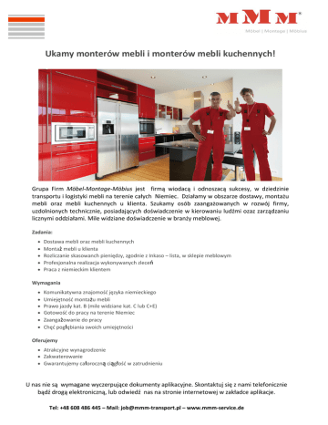 Ukamy monterów mebli i monterów mebli kuchennych! Grupa Firm Möbel-Montage-Möbius jest firmą wiodacą i odnoszacą sukcesy, w dziedzinie transportu i logistyki mebli na terenie całych Niemiec. Działamy w obszarze dostawy, montażu mebli oraz mebli kuchennych u klienta. Szukamy osób zaangażowanych w rozwój firmy, uzdolnionych technicznie, posiadających doświadczenie w kierowaniu ludźmi ozaz zarządzaniu licznymi oddziałami. Mile widziane doświadczenie w branży meblowej. Zadania: Dostawa mebli oraz mebli kuchennych Montaż mebli u klienta Rozliczanie skasowanch pieniędzy, zgodnie z Inkaso – lista, w sklepie meblowym Profesjonalna realizacja wykonywanych zleceń Praca z niemieckim klientem Wymagania Komunikatywna znajomość języka niemieckiego Umiejętność montażu mebli Prawo jazdy kat. B (mile widziane kat. C lub C+E) Gotowość do pracy na terenie Niemiec Zaangażowanie do pracy Chęć pogłębiania swoich umiejętności Oferujemy Atrakcyjne wynagrodzenie Zakwaterowanie Gwarantujemy całoroczną ciągłość w zatrudnieniu U nas nie są wymagane wyczerpujące dokumenty aplikacyjne. Skontaktuj się z nami telefonicznie bądź drogą elektroniczną, lub odwiedź nas na stronie internetowej w zakładce aplikacje. Tel: +48 608 486 445 – Mail: [email protected] – www.mmm-service.de