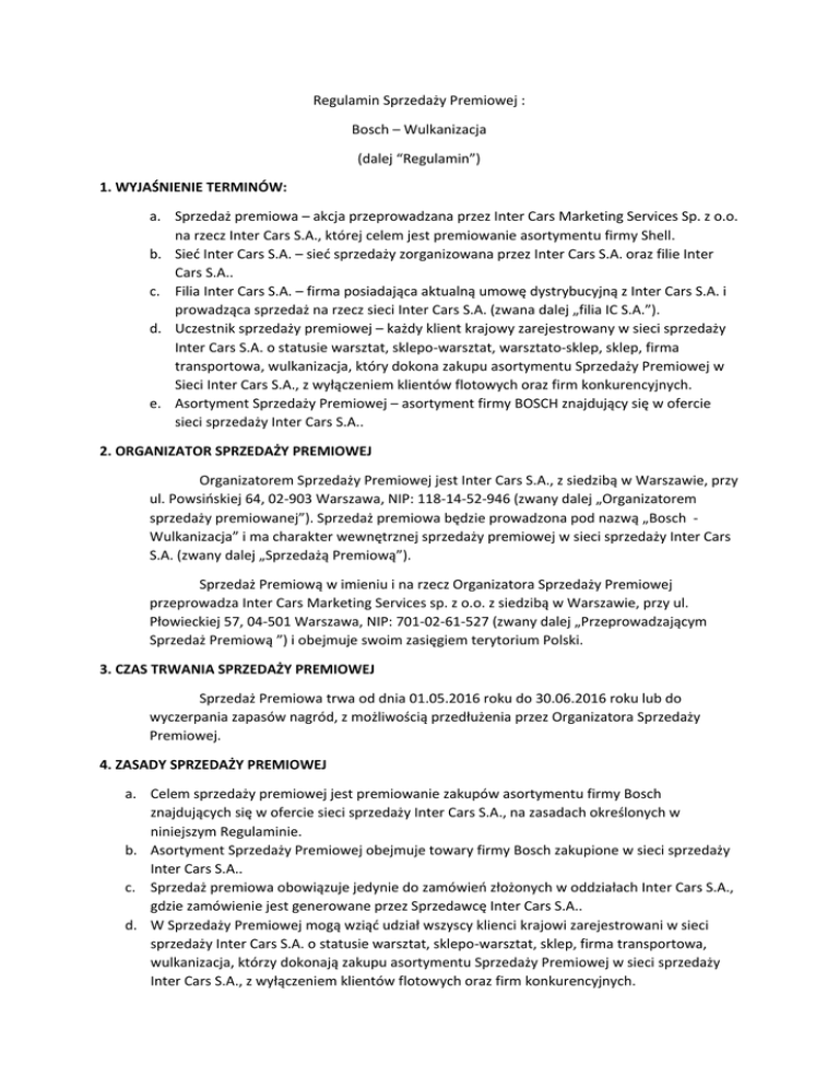 Regulamin Sprzedaży Premiowej : Bosch – Wulkanizacja (dalej “Regulamin”) 1. WYJAŚNIENIE TERMINÓW: a. Sprzedaż premiowa – akcja przeprowadzana przez Inter Cars Marketing Services Sp. z o.o. na rzecz Inter Cars S.A., której celem jest premiowanie asortymentu firmy Shell. b. Sieć Inter Cars S.A. – sieć sprzedaży zorganizowana przez Inter Cars S.A. oraz filie Inter Cars S.A.. c. Filia Inter Cars S.A. – firma posiadająca aktualną umowę dystrybucyjną z Inter Cars S.A. i prowadząca sprzedaż na rzecz sieci Inter Cars S.A. (zwana dalej „filia IC S.A.”). d. Uczestnik sprzedaży premiowej – każdy klient krajowy zarejestrowany w sieci sprzedaży Inter Cars S.A. o statusie warsztat, sklepo-warsztat, warsztato-sklep, sklep, firma transportowa, wulkanizacja, który dokona zakupu asortymentu Sprzedaży Premiowej w Sieci Inter Cars S.A., z wyłączeniem klientów flotowych oraz firm konkurencyjnych. e. Asortyment Sprzedaży Premiowej – asortyment firmy BOSCH znajdujący się w ofercie sieci sprzedaży Inter Cars S.A.. 2. ORGANIZATOR SPRZEDAŻY PREMIOWEJ Organizatorem Sprzedaży Premiowej jest Inter Cars S.A., z siedzibą w Warszawie, przy ul. Powsińskiej 64, 02-903 Warszawa, NIP: 118-14-52-946 (zwany dalej „Organizatorem sprzedaży premiowanej”). Sprzedaż premiowa będzie prowadzona pod nazwą „Bosch Wulkanizacja” i ma charakter wewnętrznej sprzedaży premiowej w sieci sprzedaży Inter Cars S.A. (zwany dalej „Sprzedażą Premiową”). Sprzedaż Premiową w imieniu i na rzecz Organizatora Sprzedaży Premiowej przeprowadza Inter Cars Marketing Services sp. z o.o. z siedzibą w Warszawie, przy ul. Płowieckiej 57, 04-501 Warszawa, NIP: 701-02-61-527 (zwany dalej „Przeprowadzającym Sprzedaż Premiową ”) i obejmuje swoim zasięgiem terytorium Polski. 3. CZAS TRWANIA SPRZEDAŻY PREMIOWEJ Sprzedaż Premiowa trwa od dnia 01.05.2016 roku do 30.06.2016 roku lub do wyczerpania zapasów nagród, z możliwością przedłużenia przez Organizatora Sprzedaży Premiowej. 4. ZASADY SPRZEDAŻY PREMIOWEJ a. Celem sprzedaży premiowej jest premiowanie zakupów asortymentu firmy Bosch znajdujących się w ofercie sieci sprzedaży Inter Cars S.A., na zasadach określonych w niniejszym Regulaminie. b. Asortyment Sprzedaży Premiowej obejmuje towary firmy Bosch zakupione w sieci sprzedaży Inter Cars S.A.. c. Sprzedaż premiowa obowiązuje jedynie do zamówień złożonych w oddziałach Inter Cars S.A., gdzie zamówienie jest generowane przez Sprzedawcę Inter Cars S.A.. d. W Sprzedaży Premiowej mogą wziąć udział wszyscy klienci krajowi zarejestrowani w sieci sprzedaży Inter Cars S.A. o statusie warsztat, sklepo-warsztat, sklep, firma transportowa, wulkanizacja, którzy dokonają zakupu asortymentu Sprzedaży Premiowej w sieci sprzedaży Inter Cars S.A., z wyłączeniem klientów flotowych oraz firm konkurencyjnych. e. Organizator powoła Komisję Sprzedaży Premiowej, w skład której wchodzą następujące osoby: Przedstawiciel Przeprowadzającego Konkurs – Michał Michalczyk Przedstawiciel Przeprowadzającego Konkurs – Paweł Jagodziński f. Komisja Sprzedaży Premiowej nadzoruje zgodność wyłonienia laureatów zgodnie z niniejszym Regulaminem. g. Prace Komisji Konkursowej są niejawne. h. Platformą informacyjną w ramach Sprzedaży Premiowej jest strona internetowa www.wszystkodlawarsztatu.pl , która jest obsługiwana przez Przeprowadzającego Konkurs. i. Informacje o organizacji Konkursu i jego przebiegu będą emitowane (ogłaszane) za pośrednictwem środków masowego przekazu, w tym: akcji mailingowej, strony internetowej. j. Nagrody w Sprzedaży Premiowej będą przyznawane zgodnie z zasadami ustalonymi poniżej. k. Nieterminowe płatności za zakupy asortymentu Sprzedaży Premiowej lub przeterminowane należności wobec Organizatora Sprzedaży Premiowej, powodują wykluczenie Uczestnika z udziału w Sprzedaży Premiowej. 5. NAGRODY a. Za jednorazowy zakup : Dowolnej wyważarki lub montażownicy Bosch lub Beissbarth w okresie obowiązywania akcji klient otrzyma klucz pneumatyczny Chicago Pneumatic CP734H w cenie 1 zł (netto). Dowolnego zestawu (wyważarki + montażownicy) Bosch lub Beissbarth (w zestawie mogą być urządzenia obu producentów) w okresie obowiązywania akcji klient otrzyma klucz pneumatyczny Chicago Pneumatic CP734H w cenie 1 zł (netto) oraz klucz dynamometryczny Toptul DT-200N w cenie 1zł (netto). b. Uczestnik sprzedaży premiowej musi wyrazić zgodę na zakup nagrody w cenie 1 zł netto w momencie składania zamówienia u sprzedawcy Inter Cars S.A.. c. Liczba zestawów nagród przyznanych Uczestnikowi Sprzedaży Premiowej zależy od ostatecznej ilości zakupionego towaru, dokonanych w czasie trwania Sprzedaży Premiowej. d. Promocja dostępna jest dla klientów w oddziałach Inter Cars S.A. oraz w tzw. sprzedaży przez IC KATALOG ONLINE. e. Zakupy asortymentu Sprzedaży Premiowej dokonanej przez klienta nie sumują się przez cały okres obowiązywania Sprzedaży Premiowej. f. Organizator Sprzedaży Premiowej zastrzega że wszelkie należności podatkowe które mogą zaistnieć w związku z przekazaniem nagród pozostają po stronie Laureata Sprzedaży Premiowej. 6. ODPOWIEDZIALNOŚĆ ORGANIZATORA Odpowiedzialność Organizatora Sprzedaży Premiowej wobec Uczestników z tytułu Sprzedaży Premiowej, w żadnym przypadku nie przekroczy wartości nagród określonych w niniejszym Regulaminie. 7. REKLAMACJE I ROSZCZENIA a. Uczestnikowi przysługuje prawo złożenia reklamacji. Reklamacje przyjmowane będą wyłącznie w trybie korespondencji przesłanej listem poleconym na adres Przeprowadzającego Sprzedaż Premiową z dopiskiem „Bosch – b. c. d. e. f. Wulkanizacja ”, nie później niż do dnia 14.07.2016 r., przy czym o dotrzymaniu terminu będzie decydować data stempla pocztowego. Reklamacja zgłoszona po tym terminie nie zostanie rozpatrzona. Reklamacja powinna być sporządzona na piśmie i zawierać imię, nazwisko i dok