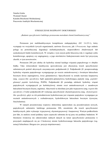 Natalia Gruba Wydział Chemii Katedra Biochemii Molekularnej Pracownia Analityki Biochemicznej STRESZCZENIE ROZPRAWY DOKTORSKIEJ „Badanie specyficzności ludzkiego proteasomu metodami chemii kombinatorycznej” Proteasom jest multikatalitycznym kompleksem endopeptydazy (EC 3.4.25.1), który występuje we wszystkich żywych organizmach, zarówno Eucaryota, jak i Procaryota. Jego zadanie polega na proteolitycznej degradacji niefunkcjonalnych, nieprawidłowo zbudowanych lub uszkodzonych białek komórkowych. W związku z tym enzym pełni kluczową rolę w regulacji cyklu komórkowego, apoptozy czy angiogenezy, a jego niewłaściwe funkcjonowanie może być przyczyną chorób, w tym nowotworów. Proteasom 20S jest zdolny do hydrolizy niemal każdego wiązania peptydowego w obrębie białka. Taka różnorodność katalityczna spowodowana jest obecnością trzech specyficzności substratowych pośród aktywnych enzymatycznie podjednostek β. Podjednostki β1 przeprowadzają hydrolizę wiązania peptydowego występującego po reszcie aminokwasowej z kwaśnym łańcuchem bocznym (kwas asparaginowy, kwas glutaminowy). Specyficzność ta została nazwana kaspazową (ang. caspase-like specificity), bądź peptydylo-glutamylową hydrolizującą peptydy (ang. peptidylglutamyl peptide hydrolizing, PGPH). Podjednostki β2 posiadają zdolność hydrolizy wiązań peptydowych występujących po karboksylowej stronie reszt aminokwasowych z zasadowym łańcuchem bocznym (lizyna, arginina). Aktywność ta określana jest jako trypsynowa (ang. trypsin-like specificity). Z kolei podjednostki β5 wykazują specyficzność chymotrypsynową (ang. chymotrypsinlike specificity), gdyż za ich pośrednictwem hydrolizowane jest wiązanie peptydowe występujące po resztach aminokwasowych z rozbudowanym, hydrofobowym łańcuchem bocznym (tyrozyna, fenyloalanina). W ramach prezentowanej rozprawy doktorskiej zajmowałam się poszukiwaniem nowych, peptydowych substratów ludzkiego proteasomu 20S, niezależnie dla trzech specyficzności katalitycznych, jakie wykazuje: trypsynowej, chymotrypsynowej i kaspazowej. Wartym podkreślenia jest fakt, że analizie został poddany rejon cząsteczki substratu do tej pory nie poddany badaniom. W literaturze światowej nie odnotowałam żadnych danych na temat specyficzności proteasomu w pozycjach znajdujących się po C-końcowej stronie hydrolizowanego łańcucha peptydowego (wg. notacji Schechtera i Bergera tzw. pozycje nieprimowane). W pierwszej części pracy zaprojektowałam i zsyntetyzowałam trzy biblioteki tetrapeptydowe, zawierające substraty fluorescencyjne i chromogeniczne ludzkiego proteasomu 20S. Ogólny wzór biblioteki przedstawiał się następująco: ABZ-X4-X3-X2-X1-ANB-NH2, gdzie ABZ to kwas 2aminobenzoesowy (donor fluorescencji), ANB-NH2 - amid kwasu 5-amino-2-nitrobenzoesowego (akceptor fluorescencji), w pozycje X4 do X2 wprowadziłam wszystkie aminokwasy proteinogenne (z wyjątkiem Cys). Każda z bibliotek posiadała inne reszty aminokwasowe w pozycji X1: dla podjednostki trypsynowej były to Arg i Lys, chymotrypsynowej - Tyr, Phe, a kaspazowej był to Glu i Asp. Syntezę wykonałam na nośniku stałym z zastosowaniem metody chemii kombinatorycznej „porcjowania i łączenia”. W wyniku dekonwolucji metodą iteracyjną w roztworze wyselekcjonowałam 3 substraty zoptymalizowane w pozycjach nieprimowanych: podjednostka chymotrypsynowa: ABZ-Val-Val-Ser-Tyr-ANB-NH2; podjednostka trypsynowa: ABZ-Val-Val-Ser-Arg-ANB-NH2; podjednostka kaspazowa: ABZ-Ile-Leu-Met-Asp-ANB-NH2. W następnym kroku otrzymane sekwencje wykorzystałam do syntezy bibliotek, tym razem heptapeptydowych, które pozwoliły mi na optymalizację pozycji primowanych. Biblioteka o wzorze: ABZ-„sekwencja dla pozycji nieprimowanych”-X1’-X2’-X3’-Tyr(3-NO2)-NH2, zawierała amid 3-nitroL-tyrozyny jako akceptor fluorescencji, z kolei w zmienne pozycje X1’-X3’ wprowadziłam 19 aminokwasów białkowych z wyjątkiem cysteiny. Badania enzymatyczne otrzymanych bibliotek skutkowały czterema substratami specyficznymi wobec poszczególnych aktywności proteasomu 20S: podjednostka chymotrypsynowa: ABZ-Val-Val-Ser-Tyr-Ala-Met-Gly-Tyr(3-NO2)-NH2; podjednostka trypsynowa: ABZ-Val-Val-Ser-Arg-Ser-Leu-Gly-Tyr(3-NO2)-NH2, ABZ-Val-Val-Ser-Arg-Ala-Phe-Phe-Tyr(3-NO2)-NH2; podjednostka kaspazowa: ABZ-Ile-Leu-Met-Asp- Ala-Met-Gly-Tyr(3-NO2)-NH2. Wyselekcjonowane substraty dla podjednostki chymotrypsynowej i trypsynowej poddałam dalszym modyfikacjom, uzyskując 24 analogi. Ustaliłam, że podstawienie reszty Tyr w substracie ABZ-ValVal-Ser-Tyr-Ala-Met-Gly-Tyr(3-NO2)-NH2, resztą 4-guanidylo-L-fenyloalaniny (GNF), doprowadziło do odkrycia substratu selektywnego wobec podjednostki trypsynowej. Okazało się, że peptyd ten charakteryzuje się największym powinowactwem względem ludzkiego proteasomu 20S spośród wszystkich otrzymanych analogów. Poprawność przeprowadzonych syntez została określona przy pomocy analizy RP-HPLC, a masy cząsteczkowe otrzymanych bibliotek i związków potwierdziłam przez spektrometrię mas. W kolejnej części mojej pracy doktorskiej zajęłam się badaniami enzymatycznymi próbek biologicznych na obecność proteasomu. Do eksperymentów wybrałam zoptymalizowne substraty, charakteryzujące się najlepszymi parametrami kinetycznymi. Dzięki współpracy z prof. dr hab. Joanną Chorostowską-Wynimko z Instytutu Gruźlicy i Chorób Płuc w Warszawie, a także dr hab. Ewą Gorodkiewicz z Wydziału Chemii Uniwersytetu w Białymstoku, byłam w stanie przebadać próbki moczu osób cierpiących na nowotwór pęcherza, a także osocza pacjentów chorych na nowotwór płuc. W wyniku przeprowadzonych badań potwierdziłam obecność proteasomu u osób ze stwierdzoną chorobą nowotworową pęcherza moczowego. Dodatkowo okazało się, że mocz jest bardziej przydatnym materiałem do badań niż osocze, ze względu na mniejszą ilość innych enzymów, które oprócz proteasomu równi
