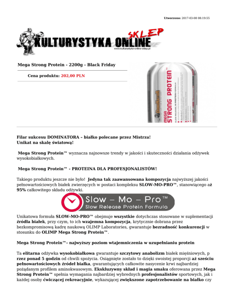 Utworzono: 2017-03-08 08:19:55 Mega Strong Protein - 2200g - Black Friday Cena produktu: 202,00 PLN Filar sukcesu DOMINATORA – białko polecane przez Mistrza! Unikat na skalę światową! Mega Strong Protein™ wyznacza najnowsze trendy w jakości i skuteczności działania odżywek wysokobiałkowych. Mega Strong Protein™ - PROTEINA DLA PROFESJONALISTÓW! Takiego produktu jeszcze nie było! Jedyna tak zaawansowana kompozycja najwyższej jakości pełnowartościowych białek zwierzęcych w postaci kompleksu SLOW-MO-PRO™, stanowiącego aż 95% całkowitego składu odżywki. Unikatowa formuła SLOW-MO-PRO™ obejmuje wszystkie dotychczas stosowane w suplementacji źródła białek, przy czym, to ich wzajemna kompozycja, krytycznie dobrana przez bezkompromisową kadrę naukową OLIMP Laboratories, gwarantuje bezradność konkurencji w stosunku do OLIMP Mega Strong Protein™. Mega Strong Protein™- najwyższy poziom wtajemniczenia w uzupełnianiu protein Ta elitarna odżywka wysokobiałkowa gwarantuje szczytowy anabolizm białek mięśniowych, p rzez ponad 5 godzin od chwili spożycia. Osiągnięte zostało to dzięki swoistej proporcji aż sześciu pełnowartościowych źródeł białka, gwarantujących całkowite nasycenie krwi najbardziej pożądanym profilem aminokwasowym. Ekskluzywny skład i magia smaku oferowana przez Mega Strong Protein™ spełnia wymagania najbardziej wybrednych profesjonalistów sportowych, jak i każdej osoby ćwiczącej rekreacyjnie, wykazującej zwiększone zapotrzebowanie na białko czy też dążącej do szybkiego rozwoju masy mięśniowej. Mega Strong Protein™- esencja anabolizmu w potędze działania antykatabolicznego! Unikatowy skład Mega Strong Protein™ bazuje na sześciu najwyższej jakości źródłach białka: kazeinie micelarnej, koncentracie, izolacie i hydrolizacie białek serwatkowych, albuminie białka jaja, oraz peptydzie glutaminowym. Wszystko to zostało uzupełnione dodatkiem czystej farmaceutyczne L glutaminy, która od pierwszej chwili po spożyciu stanowi idealne zabezpieczenie przed katabolizmem struktur mięśniowych, dając potrzebny czas na rozpoczęcie przyswajania aminokwasów pochodzących z hydrolizatu białek serwatki, co ma miejsce już niespełna 30 minut od momentu spożycia. W chwile później zaczyna się wchłanianie aminokwasów pochodzących z koncentratu i izolatu (mikrofiltrowanego w przepływie krzyżowym - CFM) białek serwatkowych, które dają potężną eksplozję poziomu aminokwasów w krwiobiegu, gwarantując nieprzerwany anabolizm najwyższego stopnia. W ciągu 90 minut, od chwili przyjęcia Mega Strong Protein™, strumień aminokwasów zaczyna być zasilany uruchomieniem trawienia i przyswajania najwyższej klasy albuminy jaja kurzego, peptydu glutaminowego i ekskluzywnej kazeiny micelarnej. Te trzy, precyzyjnie zestawione źródła białka, charakteryzują się bardzo długim czasem trawienia, który w przypadku micelarnej kazeiny wynosi ponad 5 godzin, co czyni z nich doskonałe ”narzędzia” anaboliczne o silnie zaznaczonym charakterze antykatabolicznym. Gwarantują one wysoki poziom we krwi najcenniejszych aminokwasów, w tym L glutaminy, w momencie, gdy inne źródła białka zostały juz przyswojone. Czasy absorbcji wolnych aminokwasów oraz produktów trawienia poszczególnych źródeł białka wchodzących w skład Mega Strong Protein™ Dzięki spożyciu Mega Strong Protein™ zapewniamy sobie ekstremalnie skuteczną, niesłabnącą falę uderzeniową anabolicznych aminokwasów, która od początku swego działania zaprzęga wszelkie mechanizmy metaboliczne organizmu do rozpoczęcia procesu syntezy i regeneracji struktur mięśniowych. Całości dopełnia nasycenie OLIMP Mega Strong Protein™ tauryną i kompleksem witamin, pozwalających na efektywne przyswojenie MEGA porcji biała zawartej w tej ekskluzywnej odżywce. Długie kinetyki wchłaniania peptydu glutaminowego, albuminy jaja kurzego i przede wszystkim micelarnej kazeiny, stwarzają jednocześnie idealne warunki, skutecznie i na długo zapobiegające procesom katabolicznym, które mogły by grozić regenerującej się tkance mięśniowej. Dodatkowo efekt ten zostaje wzmocniony bardzo wysokim stężeniem aminokwasów rozgałęzionych pojawiających się w krwiobiegu w następstwie trawienia elitarnej mieszanki trzech rodzajów białek serwatki. To jest właśnie potęga antykataboliczna ofiarowana przez Mega Strong Protein™. Najbogatszy profil aminokwasowy Mega Strong Protein™ – OLIMPijski standard dla najbardziej wymagających. Optymalne pory stosowania Mega Strong Protein™ Profesjonalny skład Mega Strong Protein™ został stworzony z myślą, aby pomagać, ułatwiać i sprzyjać w osiąganiu celów, a nie w jakikolwiek sposób je ograniczać, dlatego każda pora jest odpowiednia do stosowania Mega Strong Protein™. Bez wątpienia można stwierdzić, iż ze względu na czas stosowania, jest to uniwersalna odżywka białkowa, i z pewnością elitarna, jeśli wziąć pod uwagę jej efekt działania. Wręcz idealnie nadaje się w potreningowym uzupełnianiu deficytu protein, kiedy to obecność łatwo strawnych, najwyższej jakości hydrolizatu, izolatu i koncentratu białek serwatki, a także farmaceutycznie czystej L glutaminy, zapewni nam szybkie wysycenie krwi najbardziej anabolicznym ze znanych profili aminokwasowych. Ten efekt skutecznie przedłużą wolno trawiące się, ultra czyste, białko jaja kurzego, peptyd glutaminowy i elitarna micelarna kazeina. Mega Strong Protein™ będzie też doskonałym wyborem tuż przed snem lub jako posiłek zastępczy, nie tylko w okresie redukcji tkanki tłuszczowej. Dla kogo dedykowany jest Mega Strong Protein™? Preparat przeznaczony dla wszystkich osób wykazujących zwiększone zapotrzebowanie na doskonałej jakości białko. Szczególnie dla tych dążących do szybkiego rozwoju beztłuszczowej masy mięśniowej oraz siły, czyli głównie dla sportowców wyczynowych (ku