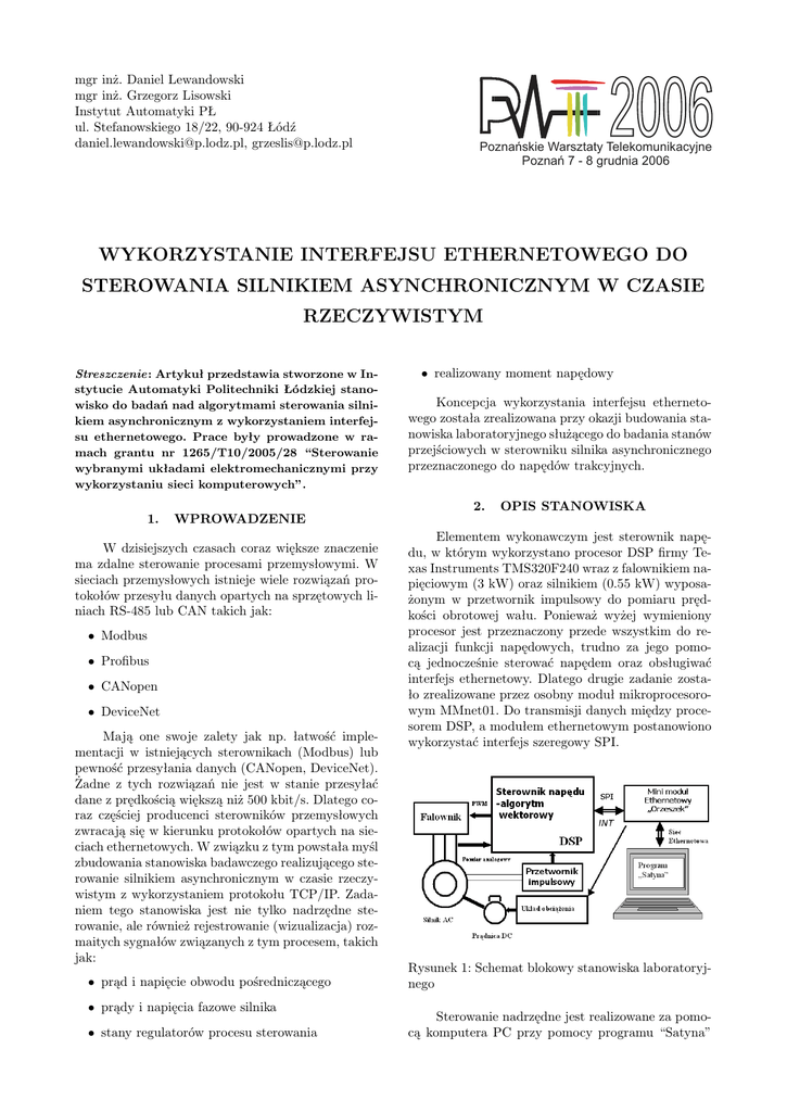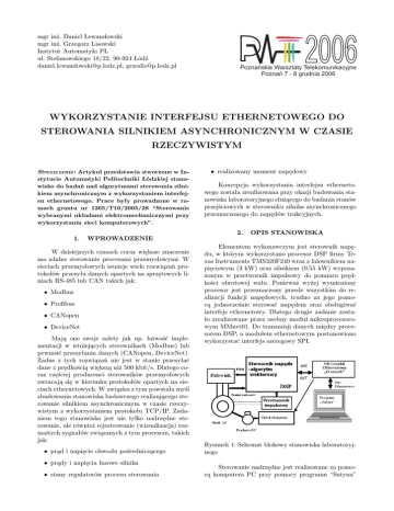 mgr inż. Daniel Lewandowski mgr inż. Grzegorz Lisowski Instytut Automatyki PŁ ul. Stefanowskiego 18/22, 90-924 Łódź [email protected], [email protected] 2006 Poznańskie Warsztaty Telekomunikacyjne Poznań 7 - 8 grudnia 2006 WYKORZYSTANIE INTERFEJSU ETHERNETOWEGO DO STEROWANIA SILNIKIEM ASYNCHRONICZNYM W CZASIE RZECZYWISTYM Streszczenie: Artykuł przedstawia stworzone w Instytucie Automatyki Politechniki Łódzkiej stanowisko do badań nad algorytmami sterowania silnikiem asynchronicznym z wykorzystaniem interfejsu ethernetowego. Prace były prowadzone w ramach grantu nr 1265/T10/2005/28 “Sterowanie wybranymi układami elektromechanicznymi przy wykorzystaniu sieci komputerowych”. • realizowany moment napędowy Koncepcja wykorzystania interfejsu ethernetowego została zrealizowana przy okazji budowania stanowiska laboratoryjnego służącego do badania stanów przejściowych w sterowniku silnika asynchronicznego przeznaczonego do napędów trakcyjnych. 2. 1. OPIS STANOWISKA WPROWADZENIE W dzisiejszych czasach coraz większe znaczenie ma zdalne sterowanie procesami przemysłowymi. W sieciach przemysłowych istnieje wiele rozwiązań protokołów przesyłu danych opartych na sprzętowych liniach RS-485 lub CAN takich jak: • Modbus • Profibus • CANopen • DeviceNet Mają one swoje zalety jak np. łatwość implementacji w istniejących sterownikach (Modbus) lub pewność przesyłania danych (CANopen, DeviceNet). Żadne z tych rozwiązań nie jest w stanie przesyłać dane z prędkością większą niż 500 kbit/s. Dlatego coraz częściej producenci sterowników przemysłowych zwracają się w kierunku protokołów opartych na sieciach ethernetowych. W związku z tym powstała myśl zbudowania stanowiska badawczego realizującego sterowanie silnikiem asynchronicznym w czasie rzeczywistym z wykorzystaniem protokołu TCP/IP. Zadaniem tego stanowiska jest nie tylko nadrzędne sterowanie, ale również rejestrowanie (wizualizacja) rozmaitych sygnałów związanych z tym procesem, takich jak: • prąd i napięcie obwodu pośredniczącego • prądy i napięcia fazowe silnika • stany regulatorów procesu sterowania Elementem wykonawczym jest sterownik napędu, w którym wykorzystano procesor DSP firmy Texas Instruments TMS320F240 wraz z falownikiem napięciowym (3 kW) oraz silnikiem (0.55 kW) wyposażonym w przetwornik impulsowy do pomiaru prędkości obrotowej wału. Ponieważ wyżej wymieniony procesor jest przeznaczony przede wszystkim do realizacji funkcji napędowych, trudno za jego pomocą jednocześnie sterować napędem oraz obsługiwać interfejs ethernetowy. Dlatego drugie zadanie zostało zrealizowane przez osobny moduł mikroprocesorowym MMnet01. Do transmisji danych między procesorem DSP, a modułem ethernetowym postanowiono wykorzystać interfejs szeregowy SPI. Rysunek 1: Schemat blokowy stanowiska laboratoryjnego Sterowanie nadrzędne jest realizowane za pomocą komputera PC przy pomocy programu “Satyna” napisanego przez autorów, który umożliwia sterowanie momentem oraz archiwizację danych przesyłanych w czasie rzeczywistym ze sterownika. Schemat blokowy stanowiska przedstawiono na rysunku nr (1). 3. STEROWNIK NAPĘDU Sterowanie trójfazowego silnika indukcyjnego oparte jest na algorytmie wektorowym o tak zwanej orientacji wektora prądu stojana - rysunek (2) (wszystkie zmienne silnika - napięcie i strumień magnetyczny wirnika odniesione są do układu współrzędnych wirującego synchronicznie z wektorem prądu). Sygnałami wyjściowymi układu sterowania są chwilowe wartości napięć Ua , Ub , Uc realizowane przez falownik napięciowy w postaci fal PWM. Algorytm wektorowy realizowany jest na podstawie wartości zadanej momentu mieszczącej się w przedziale (–0.99, 0.99) momentu znamionowego. 3. Przekształcenie zmierzonych wielkości fazowych prądu na ich reprezentację wektorową. 4. Wyznaczenie, na podstawie sygnału zadanego (moment), nowego stanu elektromagnetycznego silnika (moduł wektora prądu oraz jego położenie). 5. Przekształcenie pomierzonego wektora prądu z układu stacjonarnego do układu wirującego synchronicznie z zadanym wektorem prądu. 6. Wyznaczenie wektora napięcia na podstawie regulatora kompensującego błąd wektora pomierzonego prądu i wektora wyznaczonego w punkcie 4. 7. Przekształcenie wektora napięcia do układu stacjonarnego. 8. Przekształcenie wektora napięcia na wartości chwilowe PWM w poszczególnych fazach (realizacja tzw. SVPWM ). 9. Realizacja algorytmu stanów magnetycznych silnika takich jak: wyłączenie, praca, wzbudzenie, odwzbudzenie, opisanych w [3]. 10. Przygotowanie do komunikacji z modułem ethernetowym. Rysunek 2: Reprezentacja wektorowa zmiennych prądu i strumienia w układzie wirującym Program wykorzystuje ideę stymulatora stanu opisanego w szerzej w [1], [2] opartego na równaniach opisujących silnik indukcyjny w układzie biegunowym (wzory (1) i (2)). Na wyjściu stymulatora otrzymujemy zmienne w postaci pulsacji poślizgu oraz modułu wektora prądu wykorzystywane do realizacji zadanego momentu. Tr d ∗ Ψ = −Ψ∗r + Lm Is∗ cos ϕ∗Ψ dt r d ∗ 1 1 ϕ = − Lm Is∗ ∗ sin ϕ∗Ψ + Ω∗r dt Ψ Tr Ψr (1) (2) Realizacja fali PWM o częstotliwości 2.5 kHz determinuje wykonywanie algorytmu sterowania wektorowego dokładnie co 400 µs. Działanie algorytmu zostaje zapoczątkowane dokładnie w chwili gdy realizowany jest zerowy wektor napięcia. Jest to związane z minimalizacją zakłóceń w analogowym torze pomiarowym prądu. Algorytm wygląda następująco: 1. Pomiar wielkości analogowych. 2. Pomiar prędkości obrotowej oraz wyznaczenie kąta położenia wału. Na wykonanie wszystkich kroków algorytmu procesor DSP potrzebuje ok. 100 µs. Pozostały czas może zostać przeznaczony na komunikację szeregową z modułem ethernetowym. Ze względu na wspomniane reżimy czasowe sterownik napędu narzuca przedział czasowy, w trakcie którego można wykonać transmisj