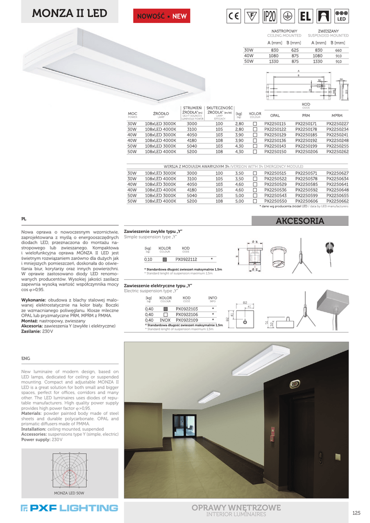 MONZA II LED A B 100 23 223 50 30 AKCESORIA PL Nowa oprawa o nowoczesnym wzornictwie, zaprojektowana z myślą o energooszczędnych diodach LED, przeznaczona do montażu nastropowego lub zwieszanego. Kompaktowa i wielofunkcyjna oprawa MONZA II LED jest świetnym rozwiązaniem zarówno dla dużych jak i mniejszych pomieszczeń, doskonała do oświetlania biur, korytarzy oraz innych powierzchni. W oprawie zastosowano diody LED renomowanych producentów. Wysokiej jakości zasilacz zapewnia wysoką wartość współczynnika mocy cos ϕ >0,95. Wykonanie: obudowa z blachy stalowej malowanej elektrostatycznie na kolor biały. Boczki ze wzmacnianego poliwęglanu. Klosze mleczne OPAL lub pryzmatyczne PRM, MPRM z PMMA. Montaż: nastropowy, zwieszany Akcesoria: zawieszenia Y (zwykłe i elektryczne) Zasilanie: 230 V Zawieszenie zwykłe typu „Y” Simple suspension type „Y” * Standardowa długość zwieszeń maksymalnie 1,5m * Standard lenght of suspension maximum 1,5m Zawieszenie elektryczne typu „Y” Electric suspension type „Y” * Standardowa długość zwieszeń maksymalnie 1,5m * Standard lenght of suspension maximum 1,5m ENG New luminaire of modern design, based on LED lamps, dedicated for ceiling or suspended mounting. Compact and adjustable MONZA II LED is a great solution for both small and bigger spaces, perfect for offices, corridors and many other. The LED luminaires uses diodes of reputable manufacturers. High quality power supply provides high power factor ϕ >0,95. Materials: powder painted body made of steel sheets and durable polycarbonate. OPAL and prismatic diffusers made of PMMA. Installation: ceiling mounted, suspended Accessories: suspensions type Y (simple, electric) Power supply: 230 V MONZA LED 50W OPRAWY WNĘTRZOWE INTERIOR LUMINAIRES 125
