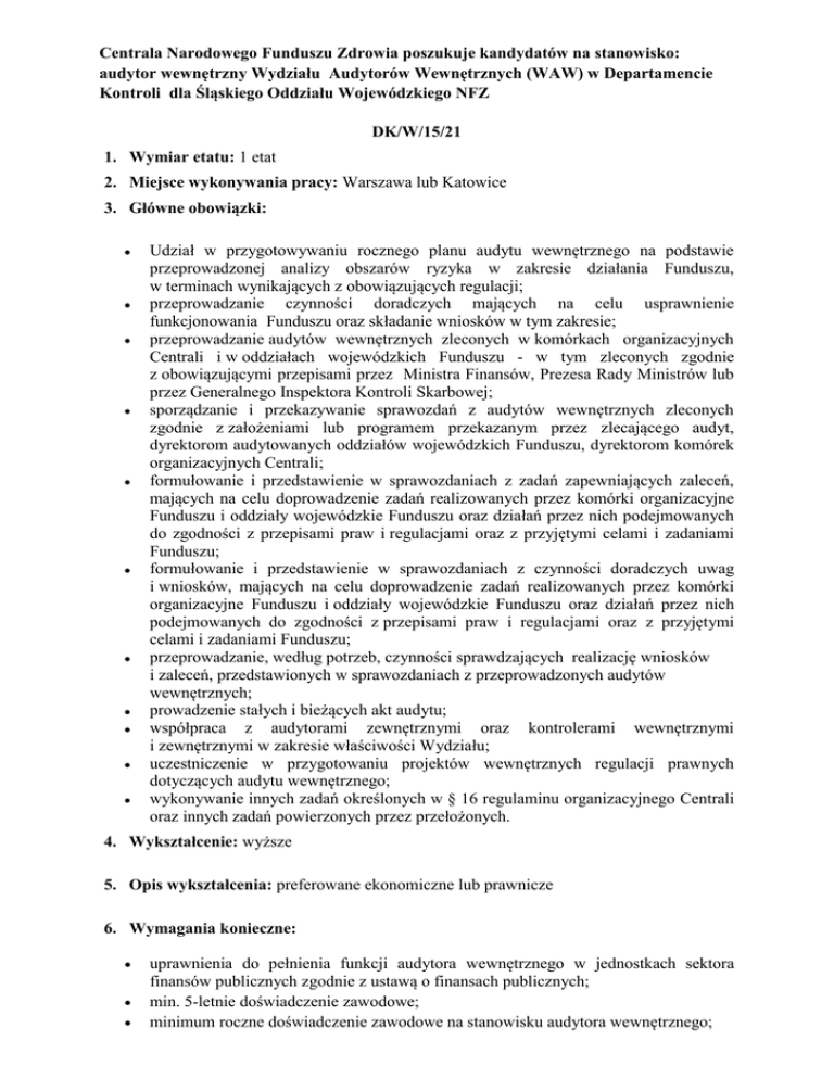 Centrala Narodowego Funduszu Zdrowia poszukuje kandydatów na stanowisko: audytor wewnętrzny Wydziału Audytorów Wewnętrznych (WAW) w Departamencie Kontroli dla Śląskiego Oddziału Wojewódzkiego NFZ DK/W/15/21 1. Wymiar etatu: 1 etat 2. Miejsce wykonywania pracy: Warszawa lub Katowice 3. Główne obowiązki: Udział w przygotowywaniu rocznego planu audytu wewnętrznego na podstawie przeprowadzonej analizy obszarów ryzyka w zakresie działania Funduszu, w terminach wynikających z obowiązujących regulacji; przeprowadzanie czynności doradczych mających na celu usprawnienie funkcjonowania Funduszu oraz składanie wniosków w tym zakresie; przeprowadzanie audytów wewnętrznych zleconych w komórkach organizacyjnych Centrali i w oddziałach wojewódzkich Funduszu - w tym zleconych zgodnie z obowiązującymi przepisami przez Ministra Finansów, Prezesa Rady Ministrów lub przez Generalnego Inspektora Kontroli Skarbowej; sporządzanie i przekazywanie sprawozdań z audytów wewnętrznych zleconych zgodnie z założeniami lub programem przekazanym przez zlecającego audyt, dyrektorom audytowanych oddziałów wojewódzkich Funduszu, dyrektorom komórek organizacyjnych Centrali; formułowanie i przedstawienie w sprawozdaniach z zadań zapewniających zaleceń, mających na celu doprowadzenie zadań realizowanych przez komórki organizacyjne Funduszu i oddziały wojewódzkie Funduszu oraz działań przez nich podejmowanych do zgodności z przepisami praw i regulacjami oraz z przyjętymi celami i zadaniami Funduszu; formułowanie i przedstawienie w sprawozdaniach z czynności doradczych uwag i wniosków, mających na celu doprowadzenie zadań realizowanych przez komórki organizacyjne Funduszu i oddziały wojewódzkie Funduszu oraz działań przez nich podejmowanych do zgodności z przepisami praw i regulacjami oraz z przyjętymi celami i zadaniami Funduszu; przeprowadzanie, według potrzeb, czynności sprawdzających realizację wniosków i zaleceń, przedstawionych w sprawozdaniach z przeprowadzonych audytów wewnętrznych; prowadzenie stałych i bieżących akt audytu; współpraca z audytorami zewnętrznymi oraz kontrolerami wewnętrznymi i zewnętrznymi w zakresie właściwości Wydziału; uczestniczenie w przygotowaniu projektów wewnętrznych regulacji prawnych dotyczących audytu wewnętrznego; wykonywanie innych zadań określonych w § 16 regulaminu organizacyjnego Centrali oraz innych zadań powierzonych przez przełożonych. 4. Wykształcenie: wyższe 5. Opis wykształcenia: preferowane ekonomiczne lub prawnicze 6. Wymagania konieczne: uprawnienia do pełnienia funkcji audytora wewnętrznego w jednostkach sektora finansów publicznych zgodnie z ustawą o finansach publicznych; min. 5-letnie doświadczenie zawodowe; minimum roczne doświadczenie zawodowe na stanowisku audytora wewnętrznego; obywatelstwo państwa członkowskiego Unii Europejskiej lub innego państwa, którego obywatelom, na podstawie umów międzynarodowych lub przepisów prawa wspólnotowego, przysługuje prawo podjęcia zatrudnienia na terytorium Rzeczypospolitej Polskiej; pełna zdolność do czynności prawnych oraz korzystanie z pełni praw publicznych; niekaralność za umyślne przestępstwo lub umyślne przestępstwo skarbowe; znajomość przepisów prawa finansów publicznych, rachunkowości, zamówień publicznych; znajomość specyfiki pracy w podmiotach zaliczanych do sektora finansów publicznych; znajomość i umiejętność stosowania narzędzi i technik audytorskich; umiejętność ustalania priorytetów wykonywanych zadań; umiejętność analitycznego myślenia i formułowania wniosków; dyspozycyjność, gotowość do pracy związanej z delegacjami służbowymi; duża odporność na stres; bardzo dobra znajomość obsługi pakietu Microsoft Office (Word, Excel, i PowerPoint). 7. Dodatkowym atutem będzie: doświadczenie zawodowe w administracji publicznej doświadczenie zawodowe w obszarze ochrony zdrowia: ukończone szkolenia, kursy, studia podyplomowe rozwijające umiejętności audytora wewnętrznego; 8. Wymagane dokumenty: kwestionariusz osobowy dla osoby ubiegającej się o zatrudnienie, kopie dokumentów potwierdzających wykształcenie, kopie świadectw pracy lub zaświadczeń potwierdzających minimum roczny staż pracy, podpisane: list motywacyjny i CV, podpisane oświadczenie o treści - „wyrażam zgodę na przetwarzanie danych osobowych zawartych w mojej ofercie pracy, dla potrzeb niezbędnych do procesu rekrutacyjnego - zgodnie z ustawą z dnia 29.08.1997 r. o ochronie danych osobowych (Dz. U. z 2014 r. poz. 1182 z późn. zm.). 9. Informacje dodatkowe dotyczące naboru: Kandydaci proszeni są o podanie numeru telefonu i adresu poczty elektronicznej Kandydaci spełniający wymagania formalne, którzy - po analizie dokumentów zostaną zakwalifikowani do kolejnego etapu naboru, będą powiadomieni telefonicznie lub za pomocą poczty elektronicznej o terminie i miejscu przeprowadzenia testu wiedzy oraz rozmowy kwalifikacyjnej Kandydaci, których oferty zostaną rozpatrzone negatywnie nie będą o tym informowani Zainteresowane osoby prosimy o przesłanie dokumentów w terminie do dnia 8 lipca 2015 r. na adres: Centrala Narodowego Funduszu Zdrowia 02-390 Warszawa, ul. Grójecka 186 Biuro Kadr i Szkoleń, pokój 2.10 z dopiskiem: oferta pracy – DK/15/21 Informacje telefoniczne pod nr 0-22 572-64-35 10. Inne informacje: Oferty otrzymane po terminie nie będą rozpatrywane (liczy się data wpływu do Centrali NFZ). Oferty osób, które nie zostały wybrane na dane stanowisko w procesie rekrutacji, zostaną komisyjnie zniszczone Ponadto kandydaci do zatrudnienia powinni spełniać wymogi określone dla pracowników NFZ w art. 112 ustawy z dnia 27 sierpnia 2004 r. o świadczeniach opieki zdrowotnej finansowanych ze środków publicznych ( Dz. U. z 2015 r. poz. 581, z późn. zm. ). Art. 112. 1. Pracownicy Funduszu nie mogą być jednocześnie: 1) świadczeniodawcami, którzy zawarli u