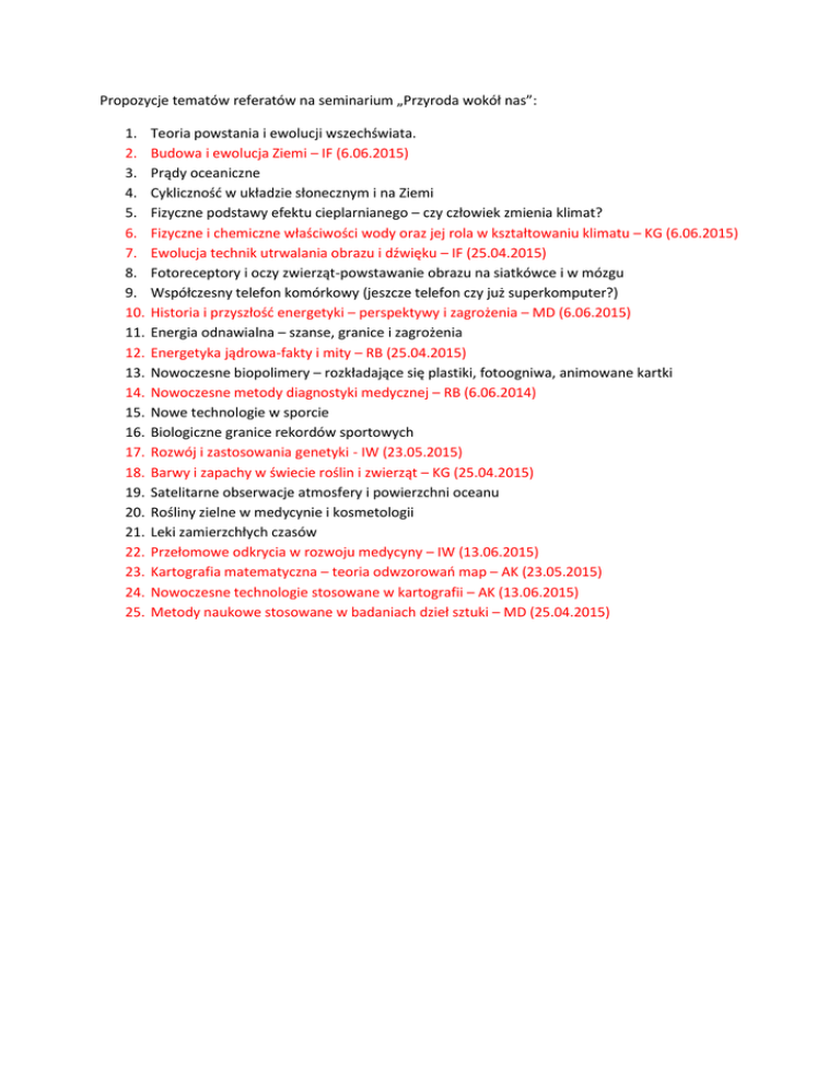 Propozycje tematów referatów na seminarium „Przyroda wokół nas”: 1. 2. 3. 4. 5. 6. 7. 8. 9. 10. 11. 12. 13. 14. 15. 16. 17. 18. 19. 20. 21. 22. 23. 24. 25. Teoria powstania i ewolucji wszechświata. Budowa i ewolucja Ziemi – IF (6.06.2015) Prądy oceaniczne Cykliczność w układzie słonecznym i na Ziemi Fizyczne podstawy efektu cieplarnianego – czy człowiek zmienia klimat? Fizyczne i chemiczne właściwości wody oraz jej rola w kształtowaniu klimatu – KG (6.06.2015) Ewolucja technik utrwalania obrazu i dźwięku – IF (25.04.2015) Fotoreceptory i oczy zwierząt-powstawanie obrazu na siatkówce i w mózgu Współczesny telefon komórkowy (jeszcze telefon czy już superkomputer?) Historia i przyszłość energetyki – perspektywy i zagrożenia – MD (6.06.2015) Energia odnawialna – szanse, granice i zagrożenia Energetyka jądrowa-fakty i mity – RB (25.04.2015) Nowoczesne biopolimery – rozkładające się plastiki, fotoogniwa, animowane kartki Nowoczesne metody diagnostyki medycznej – RB (6.06.2014) Nowe technologie w sporcie Biologiczne granice rekordów sportowych Rozwój i zastosowania genetyki - IW (23.05.2015) Barwy i zapachy w świecie roślin i zwierząt – KG (25.04.2015) Satelitarne obserwacje atmosfery i powierzchni oceanu Rośliny zielne w medycynie i kosmetologii Leki zamierzchłych czasów Przełomowe odkrycia w rozwoju medycyny – IW (13.06.2015) Kartografia matematyczna – teoria odwzorowań map – AK (23.05.2015) Nowoczesne technologie stosowane w kartografii – AK (13.06.2015) Metody naukowe stosowane w badaniach dzieł sztuki – MD (25.04.2015)