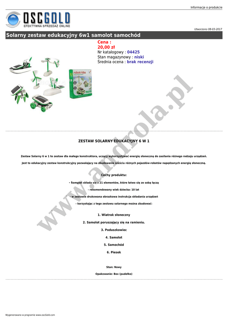 Informacje o produkcie Utworzono 08-03-2017 Solarny zestaw edukacyjny 6w1 samolot samochód Cena : 20,00 zł ro la .p l Nr katalogowy : 04425 Stan magazynowy : niski Średnia ocena : brak recenzji nd ZESTAW SOLARNY EDUKACYJNY 6 W 1 Zestaw Solarny 6 w 1 to zestaw dla małego konstruktora, uczący wykorzystywać energię słoneczną do zasilania różnego rodzaju urządzeń. Jest to edukacyjny zestaw konstrukcyjny pozwalający na zbudowanie sześciu różnych pojazdów-robotów napędzanych energią słoneczną. w .a Cechy produktu: - komplet składa się z 21 elementów, które łatwo się ze sobą łączą - rekomendowany wiek dziecka: 10 lat - w zestawie drukowana obrazkowa instrukcja składania urządzeń w w - korzystając z tego zestawu solarnego można zbudować: 1. Wiatrak słoneczny 2. Samolot poruszający się na ramieniu. 3. Poduszkowiec 4. Samolot 5. Samochód 6. Piesek Stan: Nowy Opakowanie: Box (pudełko) Wygenerowano w programie www.oscGold.com