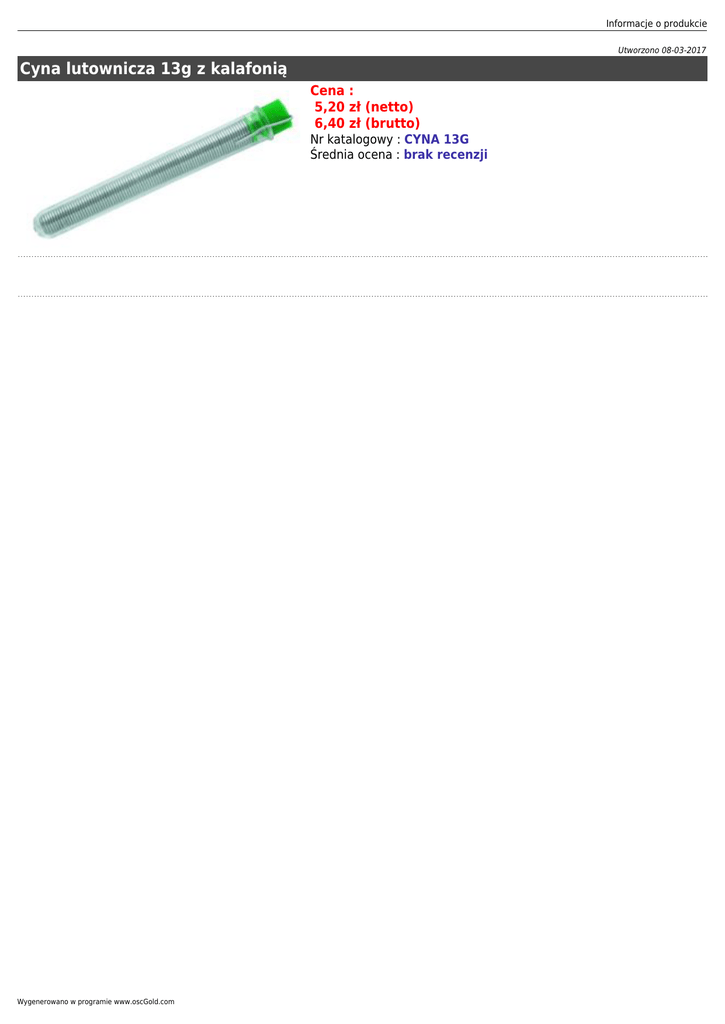 Informacje o produkcie Utworzono 08-03-2017 Cyna lutownicza 13g z kalafonią Cena : 5,20 zł (netto) 6,40 zł (brutto) Nr katalogowy : CYNA 13G Średnia ocena : brak recenzji Wygenerowano w programie www.oscGold.com