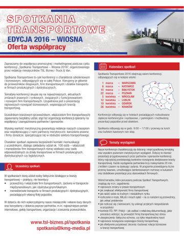 EDYCJA 2016 – WIOSNA Oferta współpracy Zapraszamy do współpracy promocyjnej i marketingowej podczas cyklu konferencji „Spotkania Transportowe – Wiosna 2016”, organizowanego przez redakcję miesięczników TSL Biznes i Truck & Van. Spotkania Transportowe to cykl konferencji o charakterze szkoleniowym i biznesowym, odbywających się w całej Polsce. Kierujemy je głównie do przewoźników drogowych, firm transportowych i działów transportu w firmach produkcyjnych i dystrybucyjnych. Kalendarz spotkań Spotkania Transportowe 2016 obejmują osiem konferencji, odbywających się w kolejne wtorki: Tematyka konferencji skupia się na najważniejszych, aktualnych zmianach prawnych i rynkowych, związanych z funkcjonowaniem i rozwojem firm transportowych. Uzupełniona jest o prezentację najnowszych rozwiązań biznesowych, wspierających branżę transportową. 1marca – WARSZAWA 8 marca – KATOWICE 15marca – BIAŁYSTOK 22marca –POZNAŃ 5kwietnia – WROCŁAW 12 kwietnia – LUBLIN 19kwietnia – GDAŃSK 26kwietnia – KRAKÓW Uczestnikom branżowym (przewoźnikom, właścicielom firm transportowych) zapewniamy bezpłatny udział, stąd też organizację konferencji opieramy na współpracy i zaangażowaniu partnerów i sponsorów. Konferencje odbywają się w hotelach posiadających rozbudowane zaplecze konferencyjne i wystawowe, z parkingiem i możliwością prezentacji pojazdów przed obiektem. Wysoką wartość merytoryczną gwarantują redakcje naszych czasopism oraz współpracujący z nami partnerzy merytoryczni: kancelarie prawne i firmy doradcze, specjalizujące się w obsłudze sektora transportowego. Spotkania odbywają się w godz. 9:00 – 17:00 z przerwą na lunch oraz bufetem kawowym non-stop. Charakter spotkań zapewnia bezpośredni kontakt i komunikację z uczestnikami, dlatego zakładamy udział ok. 100 osób – właścicieli i menedżerów firm transportowych różnej wielkości oraz osób odpowiedzialnych za działy transportowe w firmach produkcyjnych, dystrybucyjnych czy logistycznych. Uczestnicy spotkań: W spotkaniach biorą udział osoby faktycznie działające w branży transportowej – praktycy, nie teoretycy: • przewoźnicy i właściciele firm transportowych, zarówno w transporcie międzynarodowym, jak i dystrybucyjnym/lokalnym. • menedżerowie transportu w firmach produkcyjnych i dystrybucyjnych, posiadających własną flotę pojazdów. W dotarciu do nich wykorzystujemy nasze miesięczniki i własne bazy danych oraz korzystamy z dotarcia poprzez partnerów, m.in. najważniejsze portale internetowe, giełdy transportowe, organizacje i zrzeszenia przewoźników. www.tsl-biznes.pl/spotkania [email protected] Tematy wystąpień Nasze konferencje charakteryzują się dobraną i nieprzypadkową tematyką oraz wysokim poziomem merytorycznym wystąpień. Dotyczy to również prezentacji przygotowywanych przez partnerów i sponsorów konferencji, którzy najczęściej przedstawiają konkretne rozwiązania dedykowane branży transportowej. Każde wystąpienie partnerskie liczy maksymalnie 20 min. z krótkim czasem na dyskusję i pytania. W programie przewidujemy liczne przerwy kawowe, umożliwiające zainteresowanym rozmowy w kuluarach oraz dodatkowe prezentacje przy stanowiskach firmowych. Wśród tematów, które poruszamy podczas Spotkań Transportowych, znajdują się m.in. zagadnienia: • najnowsze zmiany w prawie transportowym • jak zwiększać efektywność firmy transportowej • jak radzić sobie na trudnym i niestabilnym rynku • rozliczanie e-myta, MiLoG i innych opłat – na co narażeni są przewoźnicy, jak unikać problemów • jak rozliczać się z kierowcami, by uniknąć przykrych niespodzianek w przyszłości • kontrole ITD, PIP i Policji – jak zadbać o właściwą dokumentację, jakie procedury wdrożyć, by prowadzić firmę transportową bez stresu • ubezpieczenia: faktyczna ochrona, czy tylko niepotrzebny koszt • najnowsze rozwiązania wspierające branżę transportową • jak efektywnie pozyskiwać zlecenia i budować relacje biznesowe w branży transportowej Pakiety marketingowe: Sprawdzona koncepcja spotkań: Przewidujemy kilka opcji udziału w cyklu spotkań, w zależności od Państwa oczekiwań i możliwości. • w pełni bezpłatne dla uczestników (oparte na sponsoringu partnerów) • spotkania o charakterze regionalnym – przewoźnicy i transportowcy nie mają czasu, by z drugiego krańca Polski jechać na centralną konferencję do Warszawy. My jedziemy z konferencją do nich. • biznesowo-szkoleniowy charakter – właściciele i osoby decyzyjne z firm transportowych postrzegają Spotkania Transportowe jako miejsce, gdzie można w efektywny sposób zdobyć informacje o najciekawszych i najważniejszych zagadnieniach prowadzenia firmy transportowej, a także nawiązać bezpośrednie relacje z dostawcami rozwiązań i usług dedykowanych dla branży. Tu nie ma przypadkowych osób. • merytoryczne wystąpienia – również wystąpienia sponsorów przedstawiają w merytoryczny sposób dane zagadnienie. Takie praktyczne, rzeczowe i niezbyt długie wystąpienia przewoźnicy doceniają dużo bardziej, niż typowo marketingową prezentację lub rozbudowane referaty. • nie liczba, lecz odpowiedni profil uczestników – celowo określamy liczbę uczestników na każdym spotkaniu na około 100 osób, by umożliwić większą interakcję, dyskusje itd. Dbamy o to, by uczestnikami byli faktycznie przewoźnicy, właściciele i menedżerowie transportu, co realizujemy m.in. wcześniejszą rejestracją i określonymi kanałami informowania o konferencji. Pakiet 1 CENA pakietu: Za cykl ośmiu spotkań. . . . . . . . . . . . . . . . . . . . . . 40 000 zł netto Partner konferencji z wystąpieniem – logotypy partnera w reklamach, zaproszeniach • dwudziestominutowe wystąpienie merytoryczne i innych informacjach, • wyłączność branżowa na prezentację – rozstawienie rollupów/ścianki • pełen 