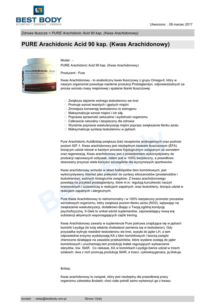 Utworzono : 08 marzec 2017 Zdrowe tłuszcze > PURE Arachidonic Acid 90 kap. (Kwas Arachidonowy) PURE Arachidonic Acid 90 kap. (Kwas Arachidonowy) Model : PURE Arachidonic Acid 90 kap. (Kwas Arachidonowy) Producent : Pure Kwas Arachidonowy - to anaboliczny kwas tłuszczowy z grupu Omega-6, który w naszym organizmie powoduje nasilenie produkcji Prostaglandyn, odpowiedzialnych za proces wzrostu masy mięśniowej i spalanie tkanki tłuszczowej. � Zwiększa stężenie wolnego testosteronu we krwi � Promuje wzrost twardych i gęstych mięśni � Zmniejsza konwersję testosteronu to estrogenu � Maksymalizuje wzrost mięśni i ich siłę � Poprawia sprawność seksualna i wydolność organizmu � Całkowicie naturalny i bezpieczny dla zdrowia � Wyraźnie poprawia waskularyzację mięśni poprzez zwiększenie tlenku azotu � Maksymalizuje syntezę testosteronu w jądrach y d Pure Arachidonic Acid zwiększa ilość receptorów androgennych oraz podnosi poziom IGF-1. Kwas arachidonowy jest niezbędnym kwasem tłuszczowym (EFA) biorącym udział niemal w każdym procesie fizjologicznym związanym ze wzrostem oraz regeneracją. Kwas arachidonowy jest z powodzeniem wykorzystywany do produkcji najnowszych odżywek, zatem jest w 100% bezpieczny, a prawidłowo stosowany przynosi wiele korzyści szczególnie dla wyczynowych sportowców. t s e B o B Kwas arachidonowy wchodzi w skład fosfolipidów błon komórkowych, jest wykorzystywany również jako prekursor do syntezy eikozanoidów (prostanoidów i leukotrienów), ważnych biologicznie związków. Z kwasu arachidonowego powstają na przykład prostaglandyny, które m.in. regulują kurczliwość naczyń krwionośnych i uczestniczą w reakcjach zapalnych, oraz leukotrieny, biorące udział w reakcjach zapalnych i alergicznych. Pure Kwas Arachidonowy to niehormonalny i w 100% bezpieczny promotor procesów wzrostowych organizmu, który zwiększa poziom tlenku azotu (NO2), wpływając na zwiększenie waskularyzacji, dodatkowo dbając o Twoją ogólną kondycję psychofizyczną. X-Gels to unikat wśród suplementów, zapowiadający nową erę substancji aktywnych wspomagających ciężki trening. Kwas Arachidonowy zawarty w suplemencie Pure pokrywa znajdujące się w jądrach komórki Leydiga (to tutaj właśnie cholesterol zamienia się w testosteron). Gdy przysadka wykryje niedobór testosteronu we krwi, wysyła do jąder LH, a tam odpowiednie enzymy wydobywają KA z błon komórkowych i tworzą związki chemiczne działające na zasadzie przekaźników, które wysłane zostają do jąder komórkowych i uruchamiają tam produkcję białek regulujących wytwarzanie sterydów, tzw. StAR . Co ciekawe, KA w komórkach Leydiga bierze udział w trzech szlakach: dwa z nich promują produkcję StAR, a trzeci, cyklooksygenaza, ją blokuje. Kwas arachidonowy to związek, który jest niezbędny dla prawidłowej pracy organizmu człowieka – choć ciało potrafi samo wytworzyć go z kwasu kontakt : - [email protected] Strona 1/{nb} Utworzono : 08 marzec 2017 Zdrowe tłuszcze > PURE Arachidonic Acid 90 kap. (Kwas Arachidonowy) PURE Arachidonic Acid 90 kap. (Kwas Arachidonowy) linolowego, praktycznie nie występuje on w pożywieniu. Kwas arachidonowy jest niezbędny do produkcji między innymi prostaglandyn, które są bardzo ważnym czynnikiem przy wzroście masy mięśniowej i spalaniu tkanki tłuszczowej. Do suplementacji sportowej został wprowadzony dzięki odkryciu Williama Llewellyna, amerykańskiego sterydowego guru. W chwili obecnej składnik ten został opatentowany. Kwas arachidonowy podawany z zewnątrz zwiększa masę mięśniową właśnie dzięki zwiększonej produkcji prostaglandyn, czyli głównych substancji naprawczych organizmu. Efekt jest wprost proporcjonalny od dawki – im więcej kwasu arachidonowego zostanie spożyte, tym szybciej i skuteczniej zostanie zreperowana uszkodzona po treningu tkanka mięśniowa, co prowadzi do znacznie większego wzrostu masy i siły. Co więcej, kwas arachidonowy zwiększa ilość receptorów androgennych oraz podnosi poziom IGF-1. Podczas testu sprawdzającego skuteczność kwasu arachidonowego w jednym z najpopularniejszych amerykańskich serwisów, beta-testerzy notowali wzrost masy mięśniowej do 8kg w ciągu 50 dni suplementacji. W organiźmie odpowiada za nasilenie produkcji prostaglandyn, odpowiadających za proces budowy masy mięśniowej i utlenianie kwasów tłuszczowych (spalanie tłuszczu). Co więcej, kwas arachidonowy zawarty w Animal Test zwiększa liczbę receptorów androgennych i podnosi stężenie IGF-1. Wielkość porcji: 1 kap. Ilość porcji w opakowaniu: 90 t s e B y d o B Skład: 1 kap. zawiera 450mg kwasu Arachidonowego. Dawkowanie i sposób użycia: najleży stosować 1 kap. Kwasu Arachidonowego 4 razy dziennie, najlepiej z posiłkami oraz przed i po treningu. UWAGA - kopiowanie oraz rozpowrzechnianie opisów jest zabronione przez BEST BODY © 2014. Ustawa z dnia 4 lutego 1994 r. o prawie autorskim i prawach pokrewnych (Dz. U. z 2006 r. Nr 90, poz. 631 z późn. zm.). Ochrona autorskich praw osobistych: Twórca, którego autorskie prawa osobiste zostały zagrożone cudzym działaniem, może żądać zaniechania tego działania. W razie dokonanego naruszenia może także żądać, aby osoba, która dopuściła się naruszenia, dopełniła czynności potrzebnych do usunięcia jego skutków, w szczególności, aby złożyła publiczne oświadczenie o odpowiedniej treści i formie. Jeżeli naruszenie było zawinione, sąd może przyznać twórcy odpowiednią sumę pieniężną tytułem zadośćuczynienia za doznaną krzywdę albo - na żądanie twórcy - zobowiązać sprawcę, aby uiścił odpowiednią sumę pieniężną na wskazany przez twórcę cel społeczny. Cena : 129,00 zł Brutto ( 120,56 zł Netto) kontakt : - [email protected] Strona 2/{nb} Utworzono : 08 marzec 2017 Zdrowe tłuszcze > PURE Arachidonic Acid 90 kap. (Kwas Arachidonowy) PURE Arachidonic Acid 90 kap. (Kw