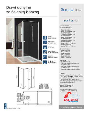 Drzwi uchylne ze ścianką boczną Drzwi uchylne ze ścianką boczną PFLEGE PLUS · · · · · · SANPKDS0080L lewe 800 x 1850 mm SANPKDS0080P prawe800 x 1850 mm SANPKDS0090L lewe 900 x 1850 mm SANPKDS0090P prawe900 x 1850 mm SANPKDS0100L lewe 1000 x 1850 mm SANPKDS0100P prawe1000 x 1850 mm Ścianka boczna · SANPKSB080 800 x 1850mm · SANPKSB090 900 x 1850mm · SANPKSB100 1000 x 1850mm Wspornik · SANPKWS080 do drzwi o szerokości 80cm · SANPKWS090 do drzwi o szerokości 90cm · SANPKWS100 do drzwi o szerokości 100cm Uwaga! Można tworzyć dowolną kombinację drzwi ze ścianką budując zarówno kabiny kwadratowe jak i prostokątne. Montaż drzwi ze ścianką wymaga dokupienia wspornika o szerokości drzwi. Można dokupić profil poszerzający drzwi: o 20-40 mm SANPKPP020 o 40-50 mm SANPKPP040 www.lazienkizpomyslem.pl