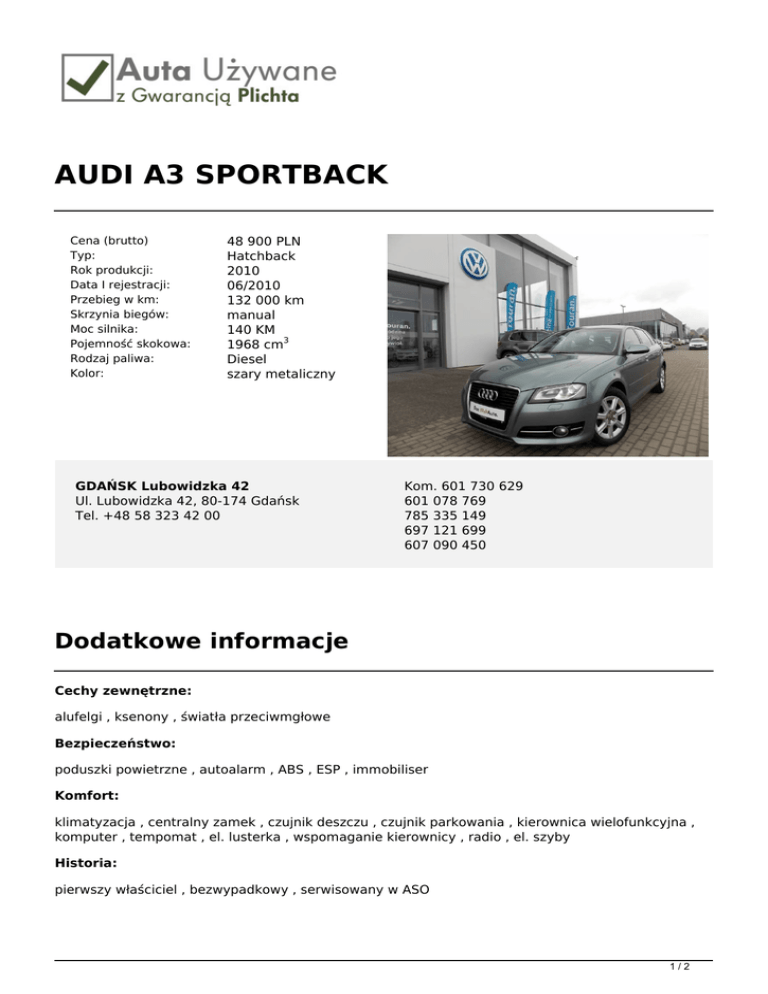 AUDI A3 SPORTBACK Cena (brutto) Typ: Rok produkcji: Data I rejestracji: Przebieg w km: Skrzynia biegów: Moc silnika: Pojemność skokowa: Rodzaj paliwa: Kolor: 48 900 PLN Hatchback 2010 06/2010 132 000 km manual 140 KM 1968 cm3 Diesel szary metaliczny GDAŃSK Lubowidzka 42 Ul. Lubowidzka 42, 80-174 Gdańsk Tel. +48 58 323 42 00 Kom. 601 730 629 601 078 769 785 335 149 697 121 699 607 090 450 Dodatkowe informacje Cechy zewnętrzne: alufelgi , ksenony , światła przeciwmgłowe Bezpieczeństwo: poduszki powietrzne , autoalarm , ABS , ESP , immobiliser Komfort: klimatyzacja , centralny zamek , czujnik deszczu , czujnik parkowania , kierownica wielofunkcyjna , komputer , tempomat , el. lusterka , wspomaganie kierownicy , radio , el. szyby Historia: pierwszy właściciel , bezwypadkowy , serwisowany w ASO 1/2 Gwarancja Szanowni Państwo, Pragniemy Państwa poinformować, iż firma Plichta – Autoryzowany Dealer Škoda Auto prowadzi skup oraz sprzedaż samochodów używanych wszystkich marek, oferując także samochody używane z gwarancją objęte programem „Auta używane z Gwarancją Plichta”. W ramach programu „Auta Używane z Gwarancją Plichta ” każdy Klient otrzymuje atrakcyjny pakiet zniżek pozwalający zoptymalizować koszty eksploatacji samochodu: -50% na serwis klimatyzacji -50% na ustawienie zbieżności -50% na kosmetykę auta -50% na ścieżkę diagnostyczną -25% na wymiany oleju -25% na zakup opon + 5zł na sezon za hotelowanie opon -15% na części i akcesoria Oferujemy również kompleksową obsługę w zakresie finansowania i ubezpieczenia: - kredyty już od 4,99% - leasingi i kredyty bez zaświadczeń - uproszczone procedury – decyzja już od 30 min. - atrakcyjne pakiety AC/OC/NW/ASS wiodących firm ubezpieczeniowych Możliwość pozostawienia dotychczas użytkowanego auta w rozliczeniu – BEZPŁATNA WYCENA!!! Zapraszamy wszystkich Klientów na jazdę próbną wybranym autem. Numer oferty: D854 Informacja nie stanowi oferty w rozumieniu art. 66 KC. Podane dane mają charakter wyłącznie informacyjny. 2/2 Powered by TCPDF (www.tcpdf.org)