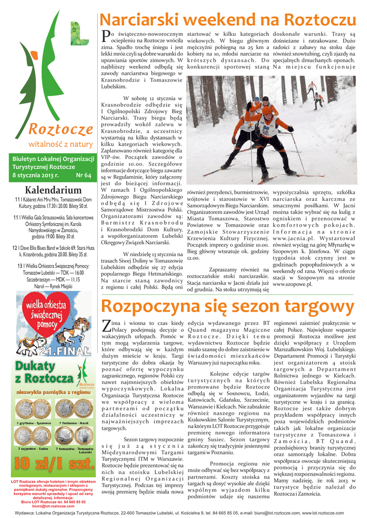 Narciarski weekend na Roztoczu P o świąteczno-noworocznym ociepleniu na Roztocze wróciła zima. Spadło trochę śniegu i jest lekki mróz czyli są dobre warunki do uprawiania sportów zimowych. W najbliższy weekend odbędą się zawody narciarstwa biegowego w Krasnobrodzie i Tomaszowie Lubelskim. Biuletyn Lokalnej Organizacji Turystycznej Roztocze 8 stycznia 2013 r. Nr 64 Kalendarium 51 11 I Kabaret Ani Mru Mru. Tomaszowski Dom Kultury, godzina 17.30 i 20.00. Bilety 50 zł. 11 I Wielka Gala Straussowska. Sala koncertowa Orkiestry Symfonicznej im. Karola Namysłowskiego w Zamościu, godzina 19.00. Bilety 30 zł. 12 I Dave Ellis Blues Band w Szkole 69. Stara Huta k. Krasnbrodu, godzina 20.00. Bilety 35 zł. 13 I Wielka Orkiestra Świątecznej Pomocy: Tomaszów Lubelski – TDK – 16.00 Szczebrzeszyn – MDK – 11.15 Narol – Rynek Miejski startować w kilku kategoriach wiekowych. W biegu głównym mężczyźni pobiegną na 25 km a kobiety na 10, młodsi narciarze na krótszych dystansach. Do konkurencji sportowej staną doskonałe warunki. Trasy są dośnieżane i ratrakowane. Dużo radości z zabawy na stoku daje również snowtubing, czyli zjazdy na specjalnych dmuchanych oponach. Na miejscu funkcjonuje również prezydenci, burmistrzowie, wójtowie i starostowie w XVI Samorządowym Biegu Narciarskim. Organizatorem zawodów jest Urząd Miasta Tomaszowa, Starostwo Powiatowe w Tomaszowie oraz Zamojskie Stowarzyszenie Krzewienia Kultury Fizycznej. Początek imprezy o godzinie 10.00. Bieg główny wtsratuje ok. godziny W niedzielę 13 stycznia na 12.00. trasach Siwej Doliny w Tomaszowie Lubelskim odbędzie się 27 edycja Zapraszamy również na popularnego Biegu Hetmańskiego. roztoczańskie stoki narciaraskie. Na starcie staną zawodnicy Stacja narciarska w Jacni działa już z regionu i całej Polski. Będą oni od grudnia. Na stoku utrzymują się wypożyczalnia sprzętu, szkółka narciarska oraz karczma ze smacznymi posiłkami. W Jacni można także wybrać się na kulig z ogniskiem i przenocować w komfortow ych pokojach. Informacja na stronie w w w.jacnia.pl. Wystartował również wyciąg na górę Młynarkę w Szopowym k. Józefowa. W ciągu tygodnia stok czynny jest w godzinach popopłudniowych a w weekendy od rana. Więcej o ofercie stacji w Szopowym na stronie www.szopowe.pl. W sobotę 12 stycznia w Krasnobrodzie odbędzie się I Ogólnopolski Zdrojowy Bieg Narciarski. Trasy biegu będą prowadziły wokół zalewu w Krasnobrodzie, a uczestnicy wystartują na kilku dystansach w kilku kategoriach wiekowych. Zaplanowano również kategorię dla VIP-ów. Początek zawodów o godzinie 10.00. Szczegółowe informacje dotyczące biegu zawarte są w Regulaminie, który załączony jest do bieżącej informacji. W ramach I Ogólnopolskiego Zdrojowego Biegu Narciarskiego odbędą się I Zdrojowe Samorządowe Mistrzostwa Polski. Organizatorami zawodów są: Burmistrz Krasnobrodu i Krasnobrodzki Dom Kultury, a współorganizatorem Lubelski Okręgowy Związek Narciarski. Rozpoczyna się sezon targowy Z ima i wiosna to czas kiedy Polacy podejmują decyzje o wakacyjnych urlopach. Pomóc w tym mogą wydarzenia targowe, które odbywają się w każdym dużym mieście w kraju. Targi turystyczne do dobra okazja by p oz n a ć o f e r tę w y p o c z y n k u zagranicznego, regionów Polski czy nawet najmniejszych obiektów w ypoczynkow ych. L okalna Organizacja Turystyczna Roztocze we współprac y z wieloma partnerami od początku d z i a ł a l n o ś c i u c ze s t n i c z y w n a j wa ż n i e j s z yc h i m p re z a c h targowych. LOT Roztocze oferuje hotelom i innym obiektom noclegowym, restauracjom i sklepom z pamiątkami dukaty regionalne. Proponujemy korzystne warunki sprzedaży i upust od ceny detalicznej. Informacje: Biuro LOT Roztocze tel. 84 665 85 05 [email protected] edycja wydawanego przez BT Quand magazynu Magiczne Roztocze. Dzięki temu wydawnictwu Roztocze będzie miało szansę do dobre zaistnienie w świadomości mieszkańców Warszawy już na początku roku. Kolejne edycje targów tur ystycznych na któr ych promowane będzie Roztocze odbędą się w Sosnowcu, Łodzi, Katowicach, Gdańsku, Szczecinie, Warszawie i Kielcach. Nie zabraknie również naszego regionu na Krakowskim Salonie Turystycznym, na którym LOT Roztocze przygotuje premierę nowego informatora Sezon targowy rozpocznie gminy Susiec. Sezon targowy s i ę j u ż 2 4 s t y c z n i a zakończy się tradycyjnie jesiennymi Międzynarodow ymi Targami targami w Poznaniu. Turystycznymi ITM w Warszawie. Promocja regionu nie Roztocze będzie prezentować się na nich na stoisku Lubelskiej może odbywać się bez współpracy z R e g i o n a l n e j O r g a n i z a c j i partnerami. Koszty stoiska na Turystycznej. Podczas tej imprezy targach są dosyć wysokie ale dzięki swoją premierę będzie miała nowa w s p ó l ny m w y j a z d o m k i l k u podmiotów udaje się naszemu regionowi zaistnieć praktycznie w całej Polsce. Największe wsparcie promocji Roztocza możliwe jest dzięki współpracy z Urzędem Marszałkowskim Woj. Lubelskiego. Departament Promocji i Turystyki jest organizatorem 4 stoisk targow ych a Departament Rolnictwa jednego w Kielcach. Również Lubelska Regionalna Organizacja Turystyczna jest organizatorem wyjazdów na targi turystyczne w kraju i za granicą. Roztocze jest także dobrym przykładem współpracy innych poza wojewódzkich podmiotów takich jak lokalne organizacje turystyczne z Tomaszowa i Zamościa, BT Quand, przedsiębiorcy branży turystycznej oraz samorządy lokalne. Dobra współpraca owocuje skuteczniejszą promocją i przyczynia się do większej rozpoznawalności regionu. Mamy nadzieję, że rok 2013 w turystyce będzie należał do Roztocza i Zamościa. Wydawca: Lokalna Organizacja Turystyczna Roztocze, 22-600 Tomaszów Lubelski, ul. Kościelna 9, tel. 84 665 85 05, e-mail: [email protected], www.lot.roztocze.com Zima w OEM RPN Kolejne inwestycje w Zwierzyńcu S Samorz