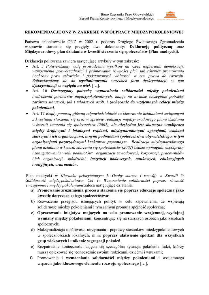 Biuro Rzecznika Praw Obywatelskich Zespół Prawa Konstytucyjnego i Międzynarodowego REKOMENDACJE ONZ W ZAKRESIE WSPÓŁPRACY MIĘDZYPOKOLENIOWEJ Państwa członkowskie ONZ w 2002 r. podczas Drugiego Światowego Zgromadzenia w sprawie starzenia się przyjęły dwa dokumenty: Deklarację polityczną oraz Międzynarodowy plan działania w kwestii starzenia się społeczeństw (Plan madrycki). Deklaracja polityczna zawiera następujące artykuły w tym zakresie: Art. 5 Potwierdzamy wolę prowadzenia wysiłków na rzecz wspierania demokracji, wzmocnienia praworządności i promowania równości płci, jak również promowania i ochrony praw człowieka i podstawowych wolności, w tym prawa do rozwoju. Zobowiązujemy się do wyeliminowania wszelkich form dyskryminacji, w tym dyskryminacji ze względu na wiek […]. Art. 16 Dostrzegamy potrzebę wzmocnienia solidarności między pokoleniami i wdrożenia partnerstw międzypokoleniowych, mając na uwadze szczególne potrzeby zarówno starszych, jak i młodszych osób, i zachęcanie do wzajemnych relacji między pokoleniami. Art. 17 Rządy ponoszą główną odpowiedzialność za kierowanie działaniami związanymi z kwestiami starzenia się oraz w sprawie realizacji międzynarodowego planu działania w kwestii starzenia się społeczeństw (2002), ale niezbędna jest skuteczna współpraca między krajowymi i lokalnymi rządami, międzynarodowymi agencjami, osobami starszymi i ich organizacjami, innymi podmiotami społeczeństwa obywatelskiego, w tym organizacjami pozarządowymi i sektorem prywatnym. Realizacja międzynarodowego planu działania w kwestii starzenia się społeczeństw (2002) będzie wymagała współpracy i zaangażowania wielu podmiotów: organizacji zawodowych, korporacji, pracowników i ich organizacji, spółdzielni, instytucji badawczych, naukowych, edukacyjnych i religijnych, oraz mediów. Plan madrycki w Kierunku priorytetowym I: Osoby starsze i rozwój; w Kwestii 5: Solidarność międzypokoleniowa; Cel 1: Wzmocnienie solidarności poprzez równość i wzajemność między pokoleniami zaleca następujące działania: a) Promowanie zrozumienia procesu starzenia się poprzez edukację społeczną jako kwestię dotyczącą całego społeczeństwa; b) Rozważenie przeglądu istniejących polityk w celu zapewnienia, że wspierają solidarność między pokoleniami i tym samym promują spójność społeczną; c) Opracowanie inicjatyw mających na celu promowanie wzajemnej, wydajnej wymiany między pokoleniami, koncentrując się na starszych osobach jako zasobach społecznych; d) Maksymalizacja możliwości utrzymania i poprawy stosunków międzypokoleniowych w społecznościach lokalnych, m.in. poprzez ułatwienie spotkań dla wszystkich grup wiekowych i unikanie segregacji pokoleń; e) Rozpatrzenie konieczności zajęcia się szczególną sytuacją pokolenia ludzi, którzy muszą opiekować się jednocześnie swoimi rodzicami, dziećmi i wnukami; f) Promowanie i wzmacnianie solidarności między pokoleniami i wzajemnego wsparcia jako kluczowego elementu rozwoju społecznego […].