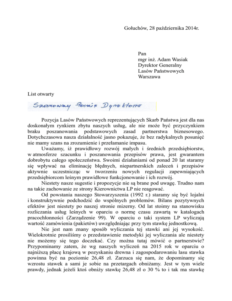 Gołuchów, 28 października 2014r. Pan mgr inż. Adam Wasiak Dyrektor Generalny Lasów Państwowych Warszawa List otwarty Pozycja Lasów Państwowych reprezentujących Skarb Państwa jest dla nas doskonałym rynkiem zbytu naszych usług, ale nie może być przyczynkiem braku poszanowania podstawowych zasad partnerstwa biznesowego. Dotychczasowa nasza działalność jasno pokazuje, że bez radykalnych posunięć nie mamy szans na zrozumienie i przełamanie impasu. Uważamy, iż prawidłowy rozwój małych i średnich przedsiębiorstw, w atmosferze szacunku i poszanowania przepisów prawa, jest gwarantem dobrobytu całego społeczeństwa. Swoimi działaniami od ponad 20 lat staramy się wpływać na eliminację błędnych, niepartnerskich zaleceń i przepisów aktywnie uczestnicząc w tworzeniu nowych regulacji zapewniających przedsiębiorcom leśnym prawidłowe funkcjonowanie i ich rozwój. Niestety nasze sugestie i propozycje nie są brane pod uwagę. Trudno nam na takie zachowanie ze strony Kierownictwa LP nie reagować. Od powstania naszego Stowarzyszenia (1992 r.) staramy się być lojalni i konstruktywnie podchodzić do wspólnych problemów. Bilans pozytywnych efektów jest niestety po naszej stronie mizerny. Od lat stoimy na stanowisku rozliczania usług leśnych w oparciu o normę czasu zawartą w katalogach pracochłonności (Zarządzenie 99). W oparciu o taki system LP wyliczają wartość zamówienia (pakietów) uwzględniając przy tym stawkę jednostkową. Nie jest nam znany sposób wyliczania tej stawki ani jej wysokość. Wielokrotnie prosiliśmy o przedstawienie metodyki jej wyliczania ale niestety nie możemy się tego doczekać. Czy można tutaj mówić o partnerstwie? Przypominamy zatem, że wg naszych wyliczeń na 2015 rok w oparciu o najniższą płacę krajową w pozyskaniu drewna i zagospodarowaniu lasu stawka powinna być na poziomie 26,48 zł. Zarzuca się nam, że dopominamy się wzrostu stawek a sami je sobie na przetargach obniżamy. Jest w tym wiele prawdy, jednak jeżeli ktoś obniży stawkę 26,48 zł o 30 % to i tak ma stawkę 18,50, stawkę i tak wyższą od tej którą w większości przypadków bierzecie Państwo do kosztorysowania. Z zadowoleniem przyjęliśmy zapowiedź tworzenia dużych pakietów tj. na poziomie obrębu. Jesteśmy od lat zwolennikami dużych pakietów i kompleksowego świadczenia usług dających podstawę do rozwoju firm. Naszym zdaniem (od lat to podkreślamy) pakiety specjalistyczne powinny być tworzone tylko w przypadku klęsk żywiołowych. Zalecanie rozdrabniania pakietów przez tworzenie pakietów z zagospodarowania lasu po to aby sprawdzić do jakiego poziomu mogą firmy leśne obniżyć stawki jest nieporozumieniem i bardzo nieuczciwe. Stosowanie takich metod nieuchronnie zmierza do konfliktów społecznych, myślimy, że na dziś nikomu niepotrzebnych. Usługi leśne zostały uznane jako usługi nie priorytetowe zatem wnioskowaliśmy o zastosowanie w przetargach na 2015 rok kryteriów poza cenowych na poziomie 30% i wyżej. Kierownictwo LP uznało jednak, że najlepszym rozwiązaniem jest 10% kryteriów poza cenowych gdzie z góry wiadomo, że przy tak postawionej sprawie liczy się i tak, tylko najniższa cena. Uznajemy to za krok w tył. Poprawiacie Państwo sobie samopoczucie i oczywiście statystyki. Czy taki kierunek działań można uznać za partnerstwo? We wskazówkach DGLP do przetargów na 2015 rok wyeksponowane miejsce zajmują kary umowne stosowane w oparciu o cenę drewna. Nawet nie chce się tego komentować. Zwracamy tylko uwagę na proporcje kar do innych proporcji również do niesymetryczności umów. Dlaczego w umowie nie ma kar dla zamawiającego np. za: nieterminowość odbioru prac, brak ciągłości w wystawianiu zleceń, dezorganizacja a nie organizacja pracy, wstrzymywanie prac na pozycjach, nierzetelny odbiór prac przy zagospodarowaniu, itp. Czy LP chcą sobie zrobić z naliczania nam kar dodatkowe źródło dochodu? Praktycznie można nas karać za wszystko, ale znaleźć rozwiązania naszych problemów i pochylić się nad naszymi sugestiami na poprawę relacji między nami jest trudniejsze a wręcz prawie niemożliwe. Wielokrotnie sugerowaliśmy (i byliśmy wspólnie zgodni) szersze stosowanie umów wieloletnich dających firmom stabilizację, umożliwiając rozwój i odkładanie kapitału inwestycyjnego. Kierunek jest niestety odwrotny, gdyż podobno trudno jest przy umowach wieloletnich określić coroczną waloryzację stawek (cen). Czy to jest problem dla LP? Zaleca się więc stosowanie umów jednorocznych, bardzo stresogennych i w wielu przypadkach ograniczających podejmowanie decyzji inwestycyjnych. Takich działań ze strony Kierownictwa Lasów Państwowych niestety nie możemy nazwać działaniami partnerskimi. Zwracamy się zatem ponownie o partnerskie zasady współpracy i rozwiązanie narastających problemów w procesie realizacji usług leśnych. - Proponujemy aby kosztorysowanie i rozliczanie prac leśnych następowało w oparciu o Katalogi Norm Czasu dla Prac Leśnych wprowadzone Zarządzeniem nr 99 Dyrektora Generalnego Lasów Państwowych z dnia 21.11.2003r. - Kształtowanie poziomu cen na usługi leśne musi uwzględnić zasady wolnego rynku jednak z zachowaniem specyfiki prac leśnych (porównywalnej w wielu obszarach do prac w górnictwie), danych dotyczących średnich wynagrodzeń w kraju (lub w leśnictwie) oraz uwarunkowań regionalnych. W związku z tym należy wspólnie opracować metodykę ustalania wysokości stawki na usługi leśne, która mogłaby również stanowić granice dla rażąco niskiej ceny. - W nieograniczony sposób stosować umowy wieloletnie. - Jednym z elementów partnerstwa biznesowego musi być dbałość stron o zadowolenie każdej z nich. Przejawem takiego podejścia musi być taka organizacja prac określonych w SIWZ a następnie w umowie, która zagwarantuje stronom jak najkorzystniejsze wyniki finansowe. Tworzyć należy większe całośc
