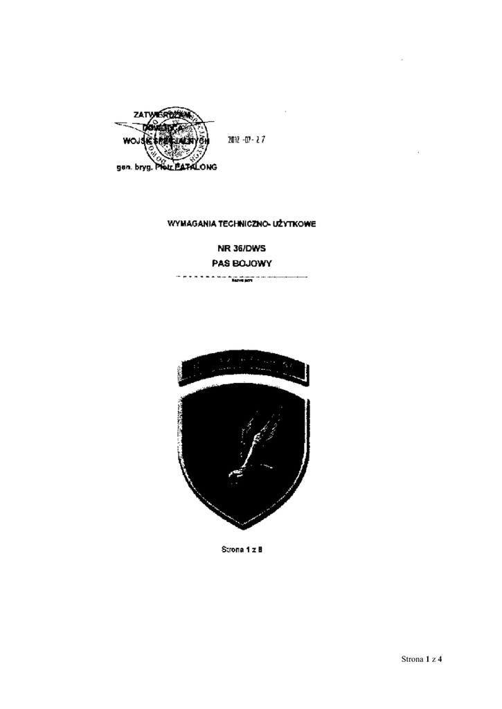 Strona 1 z 4 1. RYSUNEK MODELOWY/ZDJĘCIE 2. OPIS OGÓLNY WYROBU Przedmiotem dokumentacji jest pas bojowy. Pas bojowy przeznaczony jest do montażu kabury udowej używanej przez żołnierzy Wojsk Specjalnych. 3. WYMAGANIA TECHNICZNE. Pas musi być wykonany z tkaniny zasadniczej typy bardzo mocny fakturowany poliamid powleczony lub pokryty trzykrotnie silikonem i elastomerem PU o dużej wytrzymałości na przetarcia i zginania. Wykonany musi być w kolorze czarnym. Materiał użyty do konstrukcji pasa – taśma poliamidowa powleczona lub równoważny o parametrach równorzędnych lub wyższych. 4. OPIS WYKONANIA. Klamra główna pasa musi posiadać ruchomy rygiel dociskający pas po zapięciu, który uniemożliwia rozpięcie się pasa podczas jego użytkowania. Zewnętrzna strona pasa musi posiadać naszytą taśmę rzepową w kolorze czarnym umożliwiającą dopięcie końcówki pasa. Na wewnętrznej stronie pasa musi znajdować się dodatkowa kieszeń o wymiarach 30x4cm (rozmiar M) lub 45x4cm (rozmiar L) zapinana na zamek. 5. WYMIARY STAŁE WYROBU GOTOWEGO. Rozmiar M – 120 x 4,7 cm – dla użytkowników do 105 cm w obwodzie pasa, Strona 2 z 4 Rozmiar L – 136 x 4,7 cm – dla użytkowników do 125 cm w obwodzie pasa. Waga nie więcej niż 300g 6. CECHOWANIE I PAKOWANIE. 1. Konserwacja środki do konserwacji i utrzymania czystości obuwia zalecane przez producenta muszą być powszechnie dostępne na rynku. 2. Cechowanie 1) Przy każdym pasie muszą znajdować się wszywki firmowe zawierające nazwę i znak producenta, umieszczone po wewnętrznej stronie pasa z oznaczeniem wielkości wyrobu. 2) Wszywkę informacyjną o sposobie konserwacji zamocowaną pod wszywką firmową; 3) Etykietę jednostkową zamocowaną do wszywki informacyjnej wyrobu zawierającą co najmniej następujące dane: a) Nazwę i adres producenta; b) Wielkość wyrobu oznaczona według tabeli wielkości; c) Jakość wyrobu podana słownie (wymagana pierwsza); d) Miesiąc i rok produkcji. 3. Pakowanie Pasy muszą być złożone i zapakowane jednostkowo w worek plastikowy. Pasy muszą być pakowane po 50 sztuk do zamkniętego i zaplombowanego kartonu zbiorczego, oznakowanego etykietą zbiorczą. Oznakowanie każdego opakowania zbiorczego zawiera następujące informacje: a) nazwa i pełny adres producenta: ; b) ilość i rozmiary pasów w opakowaniu zbiorczym; 4. Kody kreskowe - Zasady i sposób kodyfikacji wyrobu określa umowa. 7. ZASADY ODBIORU: Zasady i warunki odbioru wyrobu określa umowa. 8. GWARANCJA: Okres i warunki gwarancji udzielone przez Wykonawcę na wyrób określa umowa. Strona 3 z 4 Arkusz uzgodnień – tylko w dokumentacji oryginalnej Strona 4 z 4