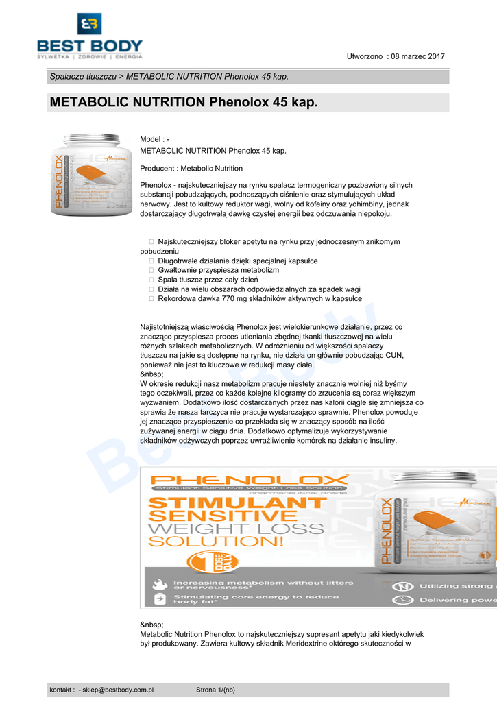 Utworzono : 08 marzec 2017 Spalacze tłuszczu > METABOLIC NUTRITION Phenolox 45 kap. METABOLIC NUTRITION Phenolox 45 kap. Model : METABOLIC NUTRITION Phenolox 45 kap. Producent : Metabolic Nutrition Phenolox - najskuteczniejszy na rynku spalacz termogeniczny pozbawiony silnych substancji pobudzających, podnoszących ciśnienie oraz stymulujących układ nerwowy. Jest to kultowy reduktor wagi, wolny od kofeiny oraz yohimbiny, jednak dostarczający długotrwałą dawkę czystej energii bez odczuwania niepokoju. � Najskuteczniejszy bloker apetytu na rynku przy jednoczesnym znikomym pobudzeniu � Długotrwałe działanie dzięki specjalnej kapsułce � Gwałtownie przyspiesza metabolizm � Spala tłuszcz przez cały dzień � Działa na wielu obszarach odpowiedzialnych za spadek wagi � Rekordowa dawka 770 mg składników aktywnych w kapsułce y d Najistotniejszą właściwością Phenolox jest wielokierunkowe działanie, przez co znacząco przyspiesza proces utleniania zbędnej tkanki tłuszczowej na wielu różnych szlakach metabolicznych. W odróżnieniu od większości spalaczy tłuszczu na jakie są dostępne na rynku, nie działa on głównie pobudzając CUN, ponieważ nie jest to kluczowe w redukcji masy ciała. W okresie redukcji nasz metabolizm pracuje niestety znacznie wolniej niż byśmy tego oczekiwali, przez co każde kolejne kilogramy do zrzucenia są coraz większym wyzwaniem. Dodatkowo ilość dostarczanych przez nas kalorii ciągle się zmniejsza co sprawia że nasza tarczyca nie pracuje wystarczająco sprawnie. Phenolox powoduje jej znaczące przyspieszenie co przekłada się w znaczący sposób na ilość zużywanej energii w ciągu dnia. Dodatkowo optymalizuje wykorzystywanie składników odżywczych poprzez uwrażliwienie komórek na działanie insuliny. t s e B o B Metabolic Nutrition Phenolox to najskuteczniejszy supresant apetytu jaki kiedykolwiek był produkowany. Zawiera kultowy składnik Meridextrine októrego skuteczności w kontakt : - [email protected] Strona 1/{nb} Utworzono : 08 marzec 2017 Spalacze tłuszczu > METABOLIC NUTRITION Phenolox 45 kap. METABOLIC NUTRITION Phenolox 45 kap. hamowaniu łaknienia oraz redukcji tłuszczu przekonały się tysiące osób na całym świecie. W odróżnieniu od wątpliwej jakości substancji, meridextrine hamuje łaknienie na długie godziny, jednocześnie dodając energii i poprawiając nastrój. Już jedno opakowanie suplementu jest wystarczające do uzyskania satysfakcjonującego efektu, bez odczuwania żadnych skutków ubocznych które mogą występować przy stosowaniu środków przepełnionych silnymi stymulantami. Phenolox promuje redukcję zbędnego tłuszczu z całego ciała, a także z bardzo newralgicznych miejsc takich jak brzuch czy biodra. Dodatkowo już jedna kapsułka w ciągu dnia dostarcza ogromną dawkę składników aktywnych. Wielkość porcji: 1 kap. Ilość porcji w opakowaniu: 45 Dawkowanie i sposób użycia: stosować 1 kap. Phenoloks jeden do dwóch razy dziennie, najlepiej rano przed śniadaniem oraz przed treningiem ewentualnie w godzinach popołudniowych czy wieczornych. y d Produkt nie może być stosowany jako substytut zróżnicowanej diety. Nie należy stosować w przypadku jakichkolwiek problemów fizjologicznych lub psychologicznych, a także podczas stosowania niektórych leków. W razie wątpliwości należy skonsultować się z lekarzem. Nie należy przekraczać zalecanej przez producenta dziennej porcji do spożycia. Przechowywać w miejscu niedostępnym dla dzieci. t s e B o B UWAGA - kopiowanie oraz rozpowrzechnianie opisów jest zabronione przez sklep BEST BODY © 2015. Ustawa z dnia 4 lutego 1994 r. o prawie autorskim i prawach pokrewnych (Dz. U. z 2006 r. Nr 90, poz. 631 z późn. zm.). Ochrona autorskich praw osobistych: Twórca, którego autorskie prawa osobiste zostały zagrożone cudzym działaniem, może żądać zaniechania tego działania. W razie dokonanego naruszenia może także żądać, aby osoba, która dopuściła się naruszenia, dopełniła czynności potrzebnych do usunięcia jego skutków, w szczególności, aby złożyła publiczne oświadczenie o odpowiedniej treści i formie. Jeżeli naruszenie było zawinione, sąd może przyznać twórcy odpowiednią sumę pieniężną tytułem zadośćuczynienia za doznaną krzywdę albo - na żądanie twórcy - zobowiązać sprawcę, aby uiścił odpowiednią sumę pieniężną na wskazany przez twórcę cel społeczny. Cena : 199,00 zł Brutto ( 185,98 zł Netto) Dostępność: Produkt dostępny w naszym sklepie od 24 czerwiec 2015 kontakt : - [email protected] Strona 2/{nb}