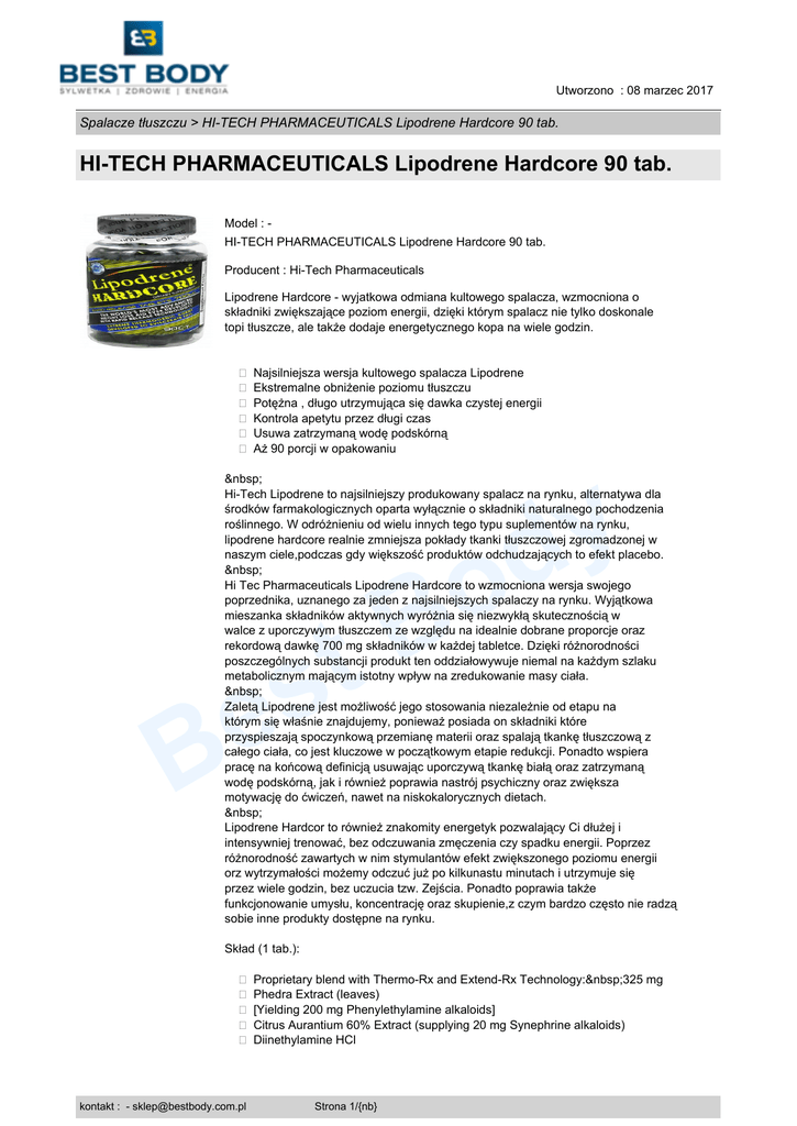 Utworzono : 08 marzec 2017 Spalacze tłuszczu > HI-TECH PHARMACEUTICALS Lipodrene Hardcore 90 tab. HI-TECH PHARMACEUTICALS Lipodrene Hardcore 90 tab. Model : HI-TECH PHARMACEUTICALS Lipodrene Hardcore 90 tab. Producent : Hi-Tech Pharmaceuticals Lipodrene Hardcore - wyjatkowa odmiana kultowego spalacza, wzmocniona o składniki zwiększające poziom energii, dzięki którym spalacz nie tylko doskonale topi tłuszcze, ale także dodaje energetycznego kopa na wiele godzin. � Najsilniejsza wersja kultowego spalacza Lipodrene � Ekstremalne obniżenie poziomu tłuszczu � Potężna , długo utrzymująca się dawka czystej energii � Kontrola apetytu przez długi czas � Usuwa zatrzymaną wodę podskórną � Aż 90 porcji w opakowaniu y d Hi-Tech Lipodrene to najsilniejszy produkowany spalacz na rynku, alternatywa dla środków farmakologicznych oparta wyłącznie o składniki naturalnego pochodzenia roślinnego. W odróżnieniu od wielu innych tego typu suplementów na rynku, lipodrene hardcore realnie zmniejsza pokłady tkanki tłuszczowej zgromadzonej w naszym ciele,podczas gdy większość produktów odchudzających to efekt placebo. Hi Tec Pharmaceuticals Lipodrene Hardcore to wzmocniona wersja swojego poprzednika, uznanego za jeden z najsilniejszych spalaczy na rynku. Wyjątkowa mieszanka składników aktywnych wyróżnia się niezwykłą skutecznością w walce z uporczywym tłuszczem ze względu na idealnie dobrane proporcje oraz rekordową dawkę 700 mg składników w każdej tabletce. Dzięki różnorodności poszczególnych substancji produkt ten oddziałowywuje niemal na każdym szlaku metabolicznym mającym istotny wpływ na zredukowanie masy ciała. Zaletą Lipodrene jest możliwość jego stosowania niezależnie od etapu na którym się właśnie znajdujemy, ponieważ posiada on składniki które przyspieszają spoczynkową przemianę materii oraz spalają tkankę tłuszczową z całego ciała, co jest kluczowe w początkowym etapie redukcji. Ponadto wspiera pracę na końcową definicją usuwając uporczywą tkankę białą oraz zatrzymaną wodę podskórną, jak i również poprawia nastrój psychiczny oraz zwiększa motywację do ćwiczeń, nawet na niskokalorycznych dietach. Lipodrene Hardcor to również znakomity energetyk pozwalający Ci dłużej i intensywniej trenować, bez odczuwania zmęczenia czy spadku energii. Poprzez różnorodność zawartych w nim stymulantów efekt zwiększonego poziomu energii orz wytrzymałości możemy odczuć już po kilkunastu minutach i utrzymuje się przez wiele godzin, bez uczucia tzw. Zejścia. Ponadto poprawia także funkcjonowanie umysłu, koncentrację oraz skupienie,z czym bardzo często nie radzą sobie inne produkty dostępne na rynku. t s e B o B Skład (1 tab.): � Proprietary blend with Thermo-Rx and Extend-Rx Technology: 325 mg � Phedra Extract (leaves) � [Yielding 200 mg Phenylethylamine alkaloids] � Citrus Aurantium 60% Extract (supplying 20 mg Synephrine alkaloids) � Diinethylamine HCl kontakt : - [email protected] Strona 1/{nb} Utworzono : 08 marzec 2017 Spalacze tłuszczu > HI-TECH PHARMACEUTICALS Lipodrene Hardcore 90 tab. HI-TECH PHARMACEUTICALS Lipodrene Hardcore 90 tab. � Cassia Nomame Extract (plant) � Naringen (fruit) � 6,7 dihydroxybergamottin (fruit) � 5-Methoxytryptamine HCL � Yohimbe 8% Extract (bark)(Supplying 1.5 mg Yohimbine, 11-Hydroxy-Yohimbine, Alpha-Yohimbine) � Evodiamine � 5-Methoxytryptamine HCI � Yohimbe 8% Extract (Bark) � Proprietary Tri-Xanthine Blend: 375mg � Yerba Mate Extract � Green Tea Extract � Theobroma Cocoa extract (standardized to 200 mg Caffeine, 45 mg EGCG, 25 mg Theobromine, and 5 mg Theophylline) y d Wielkość porcji: 1 tab. Ilość porcji w opakowaniu: 90 Dawkowanie i sposób użycia: stosować 1 tab. Lipodrene Hardcore codziennie po przebudzeniu i 1 tab. przed aktywnością fizyczną lub w godzinach popołudniowych zachowując odpowiedni odstęp między porcjami. o B Produkt nie może być stosowany jako substytut zróżnicowanej diety. Nie należy stosować w przypadku jakichkolwiek problemów fizjologicznych lub psychologicznych, a także podczas stosowania niektórych leków. W razie wątpliwości należy skonsultować się z lekarzem. Nie należy przekraczać zalecanej przez producenta dziennej porcji do spożycia. Przechowywać w miejscu niedostępnym dla dzieci. t s e B UWAGA - kopiowanie oraz rozpowrzechnianie opisów jest zabronione przez sklep BEST BODY © 2015. Ustawa z dnia 4 lutego 1994 r. o prawie autorskim i prawach pokrewnych (Dz. U. z 2006 r. Nr 90, poz. 631 z późn. zm.). Ochrona autorskich praw osobistych: Twórca, którego autorskie prawa osobiste zostały zagrożone cudzym działaniem, może żądać zaniechania tego działania. W razie dokonanego naruszenia może także żądać, aby osoba, która dopuściła się naruszenia, dopełniła czynności potrzebnych do usunięcia jego skutków, w szczególności, aby złożyła publiczne oświadczenie o odpowiedniej treści i formie. Jeżeli naruszenie było zawinione, sąd może przyznać twórcy odpowiednią sumę pieniężną tytułem zadośćuczynienia za doznaną krzywdę albo - na żądanie twórcy - zobowiązać sprawcę, aby uiścił odpowiednią sumę pieniężną na wskazany przez twórcę cel społeczny. Cena : 249,00 zł Brutto ( 232,71 zł Netto) Dostępność: Produkt dostępny w naszym sklepie od 04 lipiec 2015 kontakt : - [email protected] Strona 2/{nb}
