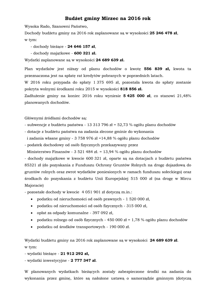 Budżet gminy Mirzec na 2016 rok Wysoka Rado, Szanowni Państwo, Dochody budżetu gminy na 2016 rok zaplanowane są w wysokości 25 246 478 zł, w tym: - dochody bieżące - 24 646 157 zł, - dochody majątkowe - 600 321 zł. Wydatki zaplanowane są w wysokości 24 689 639 zł. Plan wydatków jest niższy od planu dochodów o kwotę 556 839 zł, kwota ta przeznaczona jest na spłatę rat kredytów pobranych w poprzednich latach. W 2016 roku przypada do spłaty 1 375 695 zł, pozostała kwota do spłaty zostanie pokryta wolnymi środkami roku 2015 w wysokości 818 856 zł. Zadłużenie gminy na koniec 2016 roku wyniesie 5 425 000 zł, co stanowi 21,48% planowanych dochodów. Głównymi źródłami dochodów są: - subwencje z budżetu państwa - 13 313 796 zł = 52,73 % ogółu planu dochodów - dotacje z budżetu państwa na zadania zlecone gminie do wykonania i zadania własne gminy - 3 758 976 zł =14,88 % ogółu planu dochodów - podatek dochodowy od osób fizycznych przekazywany przez Ministerstwo Finansów - 3 521 484 zł. = 13,94 % ogółu planu dochodów - dochody majątkowe w kwocie 600 321 zł, oparte są na dotacjach z budżetu państwa 85321 zł (do pozyskania z Funduszu Ochrony Gruntów Rolnych na drogę dojazdową do gruntów rolnych oraz zwrot wydatków poniesionych w ramach funduszu sołeckiego) oraz środkach do pozyskania z budżetu Unii Europejskiej 515 000 zł (na drogę w Mircu Majoracie) - pozostałe dochody w kwocie 4 051 901 zł dotyczą m.in.: podatku od nieruchomości od osób prawnych - 1 520 000 zł, podatku od nieruchomości od osób fizycznych - 315 000 zł, opłat za odpady komunalne - 397 092 zł, podatku rolnego od osób fizycznych - 450 000 zł = 1,78 % ogółu planu dochodów podatku od środków transportowych - 190 000 zł. Wydatki budżetu gminy na 2016 rok zaplanowane są w wysokości 24 689 639 zł. w tym: - wydatki bieżące - 21 912 292 zł, - wydatki inwestycyjne - 2 777 347 zł. W planowanych wydatkach bieżących zostały zabezpieczone środki na zadania do wykonania przez gminę, które są nałożone ustawą o samorządzie gminnym (dotyczą m.in.: utrzymania dróg gminnych, administracji publicznej, oświaty, ochrony przeciwpożarowej, ochrony zdrowia, gospodarki komunalnej i ochrony środowiska, pomocy społecznej, kultury ) Największy udział w wydatkach bieżących stanowi utrzymanie placówek oświatowych i wynosi ponad 52,29 % ogółu planowanych wydatków bieżących. Całkowity koszt utrzymania placówek oświatowych w 2016 roku wynosi 11 459 766 zł. Koszty pokryte są subwencją oświatową i dotacją z budżetu państwa w kwocie 8 204 493 zł oraz dochodami własnymi - 3 255 273 zł. Pomoc Społeczna to kwota 4 545 277 zł, co stanowi bieżących, Administracja Publiczna (plan) 20,74 % ogółu wydatków 2 889 168 zł, co stanowi 13,18 % wydatków bieżących. W wydatkach ujęta jest dopłata dla gospodarstw domowych do odprowadzanych ścieków w wysokości 130 000 zł. (1,80 zł. do 1m3). Po raz kolejny w budżecie gminy został wyodrębniony plan wydatków w ramach funduszu sołeckiego. Wartość planowanych przedsięwzięć do wykonania w ramach funduszu sołeckiego w roku 2016 to kwota 258 867 zł. Tu chciałbym zwrócić uwagę na fakt gospodarskiego podejścia rad sołeckich, sołtysów i mieszkańców sołectw do dysponowania przeznaczonymi kwotami funduszu. Słowa uznania i podziękowania. Większość zadań to zadania inwestycyjne, które w znaczącym stopniu podniosą jakość życia mieszkańców (budowa linii oświetlenia ulicznego-3 projekty, wymiana pokrycia dachu na sali gimnastycznej w Jagodnem, izolacja ściany fundamentowej w szkole w Gadce, wymiana okien i wykładziny podłogowej w szkole w Trębowcu, zakup mebli szkolnych w Tychowie Starym czy też renowacja ścian w budynku remizy w Ostrożance. Plan wydatków inwestycyjnych na 2016 rok to kwota 2 777 347 zł. Do realizacji przyjęto łącznie 32 zadania. W większości zadania te wsparte są środkami z budżetu Unii Europejskiej. Priorytetowym działaniem jest dokończenie kanalizacji sanitarnej w miejscowościach Osiny i Małyszyn. Stąd w budżecie znalazły się pozycje na aktualizację kosztorysów przedmiotowych odcinków kanalizacji, a w chwili pojawienia się możliwości sięgnięcia po środki zewnętrzne, po które gmina Mirzec będzie się mogła ubiegać, należy podjąć kroki w tym kierunku, zabezpieczając wkład własny kredytem tak, aby przynajmniej jeden odcinek kanalizacji mógł zostać zrealizowany. Pozostałe ważniejsze inwestycje roczne to: projekt na budowę sięgaczy pod drogami; przebudowa drogi gminnej w Gadce; inwestycje o których wspomniałem przy okazji omawiania funduszy sołeckich; renowacja kapliczki Jana Nepomucena w Tychowie Starym. Z inwestycji wieloletnich należy wyróżnić: przebudowę drogi gminnej w Mircu Majoracie; przebudowę remiz OSP w Ostrożance i Tychowie Nowym; zadania związane z drugim etapem rewitalizacji centrum Mirca; termomodernizację budynków użyteczności publicznej (7 budynków oświatowych, budynek urzędu gminy); przebudowę drogi gminnej w Osinach; przebudowę drogi powiatowej Mirzec Ogrody, Poddąbrowa do drogi 744, współudział finansowy zadania; przebudowę drogi powiatowej Trębowiec - Osiny przez Mokrą Niwę, współudział finansowy zadania. Jak widać z przedstawionych inwestycji, środki na ten cel nie są zbyt imponujące, ale obecnie takie są możliwości budżetowe, dlatego w przyszłości należy pomyśleć o zwiększeniu dochodów gminy. Jest wiele spraw do uregulowania, które latami nie zostały rozwiązane jak te związane z odwodnieniami i regulacją stosunków wodnych, regulacją prawną dróg będących we władaniu gminy, a będących własnością skarbu państwa bądź o statusie prawnie nieuregulowanym. W związku z tym należy starać się o przeznaczanie jak najwięcej pieniędzy na zadania inwestycyjne podnoszące w efekcie jakość życia mieszkańców gminy Mir