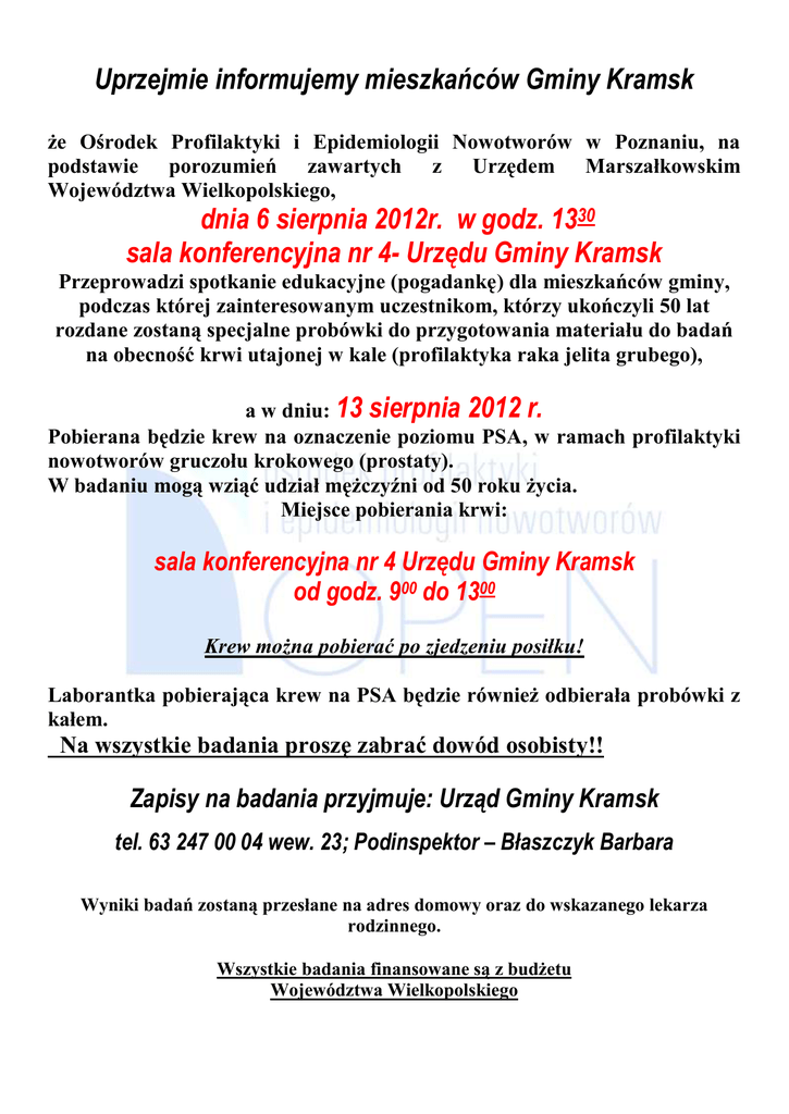 Uprzejmie informujemy mieszkańców Gminy Kramsk że Ośrodek Profilaktyki i Epidemiologii Nowotworów w Poznaniu, na podstawie porozumień zawartych z Urzędem Marszałkowskim Województwa Wielkopolskiego, dnia 6 sierpnia 2012r. w godz. 1330 sala konferencyjna nr 4- Urzędu Gminy Kramsk Przeprowadzi spotkanie edukacyjne (pogadankę) dla mieszkańców gminy, podczas której zainteresowanym uczestnikom, którzy ukończyli 50 lat rozdane zostaną specjalne probówki do przygotowania materiału do badań na obecność krwi utajonej w kale (profilaktyka raka jelita grubego), a w dniu: 13 sierpnia 2012 r. Pobierana będzie krew na oznaczenie poziomu PSA, w ramach profilaktyki nowotworów gruczołu krokowego (prostaty). W badaniu mogą wziąć udział mężczyźni od 50 roku życia. Miejsce pobierania krwi: sala konferencyjna nr 4 Urzędu Gminy Kramsk od godz. 900 do 1300 Krew można pobierać po zjedzeniu posiłku! Laborantka pobierająca krew na PSA będzie również odbierała probówki z kałem. Na wszystkie badania proszę zabrać dowód osobisty!! Zapisy na badania przyjmuje: Urząd Gminy Kramsk tel. 63 247 00 04 wew. 23; Podinspektor – Błaszczyk Barbara Wyniki badań zostaną przesłane na adres domowy oraz do wskazanego lekarza rodzinnego. Wszystkie badania finansowane są z budżetu Województwa Wielkopolskiego