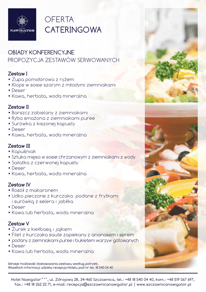 OFERTA CATERINGOWA OBIADY KONFERENCYJNE PROPOZYCJA ZESTAWÓW SERWOWANYCH Zestaw I • Zupa pomidorowa z ryżem • Klops w sosie szarym z młodymi ziemniakami • Deser • Kawa, herbata, woda mineralna Zestaw II • Barszcz zabielany z ziemniakami • Ryba smażona z ziemniakami puree • Surówka z kiszonej kapusty • Deser • Kawa, herbata, woda mineralna Zestaw III • Kapuśniak • Sztuka mięsa w sosie chrzanowym z ziemniakami z wody • Sałatka z czerwonej kapusty • Deser • Kawa, herbata, woda mineralna Zestaw IV • Rosół z makaronem • Udko pieczone z kurczaka podane z frytkami i surówką z selera i jabłka • Deser • Kawa lub herbata, woda mineralna Zestaw V • Żurek z kiełbasą i jajkiem • Filet z kurczaka saute zapiekany z ananasem i serem • podany z ziemniakami puree i bukietem warzyw gotowanych • Deser • Kawa lub herbata, woda mineralna Istnieje możliwość dostosowania zestawu według potrzeb. Wszelkich informacji udziela recepcja Hotelu pod nr tel. 18 540 04 40 Hotel Nawigator***, ul. Zdrojowa 28, 34-460 Szczawnica, tel.: +48 18 540 04 40, kom.: +48 519 067 697, fax.: +48 18 262 22 71, e-mail: [email protected] | www.szczawnicanawigator.pl