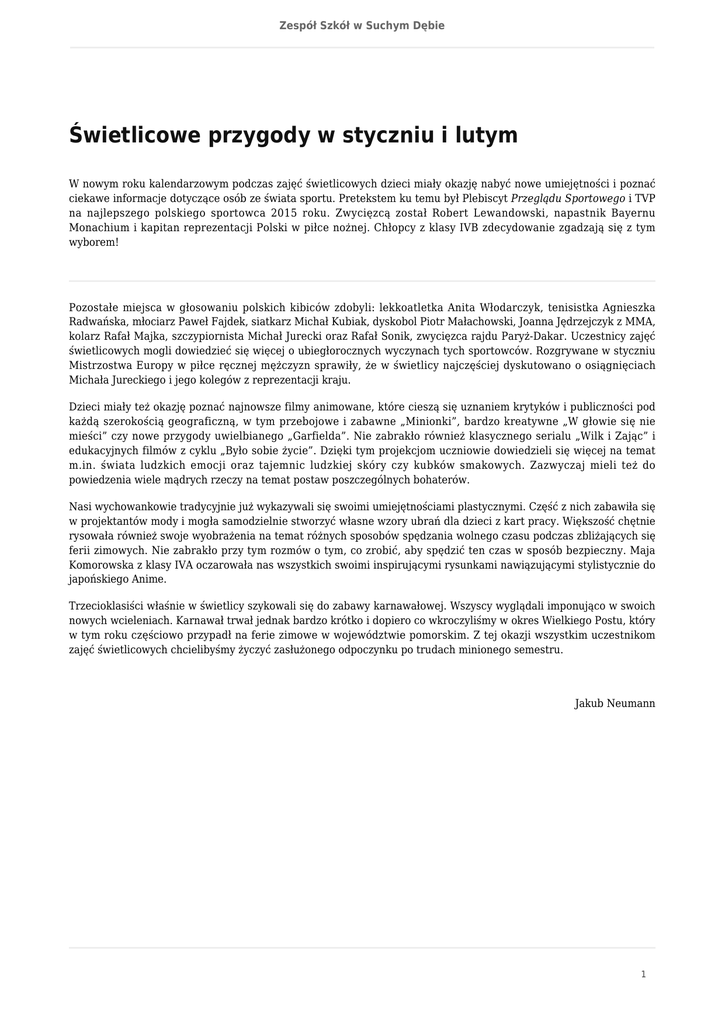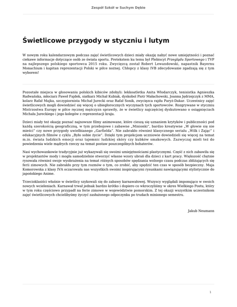 Zespół Szkół w Suchym Dębie Świetlicowe przygody w styczniu i lutym W nowym roku kalendarzowym podczas zajęć świetlicowych dzieci miały okazję nabyć nowe umiejętności i poznać ciekawe informacje dotyczące osób ze świata sportu. Pretekstem ku temu był Plebiscyt Przeglądu Sportowego i TVP na najlepszego polskiego sportowca 2015 roku. Zwycięzcą został Robert Lewandowski, napastnik Bayernu Monachium i kapitan reprezentacji Polski w piłce nożnej. Chłopcy z klasy IVB zdecydowanie zgadzają się z tym wyborem! Pozostałe miejsca w głosowaniu polskich kibiców zdobyli: lekkoatletka Anita Włodarczyk, tenisistka Agnieszka Radwańska, młociarz Paweł Fajdek, siatkarz Michał Kubiak, dyskobol Piotr Małachowski, Joanna Jędrzejczyk z MMA, kolarz Rafał Majka, szczypiornista Michał Jurecki oraz Rafał Sonik, zwycięzca rajdu Paryż-Dakar. Uczestnicy zajęć świetlicowych mogli dowiedzieć się więcej o ubiegłorocznych wyczynach tych sportowców. Rozgrywane w styczniu Mistrzostwa Europy w piłce ręcznej mężczyzn sprawiły, że w świetlicy najczęściej dyskutowano o osiągnięciach Michała Jureckiego i jego kolegów z reprezentacji kraju. Dzieci miały też okazję poznać najnowsze filmy animowane, które cieszą się uznaniem krytyków i publiczności pod każdą szerokością geograficzną, w tym przebojowe i zabawne „Minionki”, bardzo kreatywne „W głowie się nie mieści” czy nowe przygody uwielbianego „Garfielda”. Nie zabrakło również klasycznego serialu „Wilk i Zając” i edukacyjnych filmów z cyklu „Było sobie życie”. Dzięki tym projekcjom uczniowie dowiedzieli się więcej na temat m.in. świata ludzkich emocji oraz tajemnic ludzkiej skóry czy kubków smakowych. Zazwyczaj mieli też do powiedzenia wiele mądrych rzeczy na temat postaw poszczególnych bohaterów. Nasi wychowankowie tradycyjnie już wykazywali się swoimi umiejętnościami plastycznymi. Część z nich zabawiła się w projektantów mody i mogła samodzielnie stworzyć własne wzory ubrań dla dzieci z kart pracy. Większość chętnie rysowała również swoje wyobrażenia na temat różnych sposobów spędzania wolnego czasu podczas zbliżających się ferii zimowych. Nie zabrakło przy tym rozmów o tym, co zrobić, aby spędzić ten czas w sposób bezpieczny. Maja Komorowska z klasy IVA oczarowała nas wszystkich swoimi inspirującymi rysunkami nawiązującymi stylistycznie do japońskiego Anime. Trzecioklasiści właśnie w świetlicy szykowali się do zabawy karnawałowej. Wszyscy wyglądali imponująco w swoich nowych wcieleniach. Karnawał trwał jednak bardzo krótko i dopiero co wkroczyliśmy w okres Wielkiego Postu, który w tym roku częściowo przypadł na ferie zimowe w województwie pomorskim. Z tej okazji wszystkim uczestnikom zajęć świetlicowych chcielibyśmy życzyć zasłużonego odpoczynku po trudach minionego semestru. Jakub Neumann 1