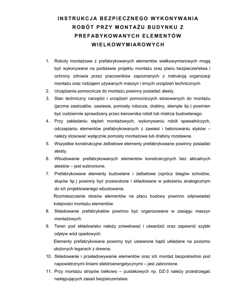 INSTRUKCJA BEZPIECZNEGO WYKONYWANIA ROBÓT PRZY MONTAśU BUDYNKU Z PREFABYKOWANYCH ELEMENTÓW WIELKOWYMIAROWYCH 1. Roboty montaŜowe z prefabrykowanych elementów wielkowymiarowych mogą być wykonywane na podstawie projektu montaŜu oraz planu bezpieczeństwa i ochrony zdrowia przez pracowników zapoznanych z instrukcją organizacji montaŜu oraz rodzajem uŜywanych maszyn i innych urządzeń technicznych. 2. Urządzenia pomocnicze do montaŜu powinny posiadać atesty. 3. Stan techniczny narzędzi i urządzeń pomocniczych stosowanych do montaŜu (jarzma zastrzałów, zawiesia, pomosty robocze, drabiny, stemple itp.) powinien być codziennie sprawdzany przez kierownika robót lub mistrza budowlanego. 4. Przy zakładaniu stęŜeń montaŜowych, wykonywaniu robót spawalniczych, odczepianiu elementów prefabrykowanych z zawiesi i betonowaniu styków – naleŜy stosować wyłącznie pomosty montaŜowe lub drabiny rozstawne. 5. Wszystkie konstrukcyjne Ŝelbetowe elementy prefabrykowane powinny posiadać atesty. 6. Wbudowanie prefabrykowanych elementów konstrukcyjnych bez aktualnych atestów – jest wzbronione. 7. Prefabrykowane elementy budowlane i Ŝelbetowe (oprócz biegów schodów, słupów itp.) powinny być przewoŜone i składowane w połoŜeniu analogicznym do ich projektowanego wbudowania. Rozmieszczenie stosów elementów na placu budowy powinno odpowiadać kolejności montaŜu elementów. 8. Składowanie prefabrykatów powinno być organizowane w zasięgu maszyn montaŜowych. 9. Teren pod składowisko naleŜy zniwelować i utwardzić oraz zapewnić szybki odpływ wód opadowych. Elementy prefabrykowane powinny być ustawione bądź układane na poziomo ułoŜonych legarach z drewna. 10. Składowanie i przeładowywanie elementów oraz ich montaŜ bezpośrednio pod napowietrznymi liniami elektroenergetycznymi – jest zabronione. 11. Przy montaŜu stropów belkowo – pustakowych np. DZ-3 naleŜy przestrzegać następujących zasad bezpieczeństwa: 1) belki naleŜy układać na spoziomowanych i wyrównanych podporach (murach), 2) rozmieszczenie belek na stropie powinno się odbywać z rusztowań wewnętrznych, 3) roznoszenie i układanie pustaków oraz betonowanie stropów dopuszczalne jest tylko przy zastosowaniu pomostów transportowych. 12. MontaŜ prefabrykowanych elementów klatek schodowych powinien odbywać się równolegle do postępu robót murowych. 13. Prowadzenie montaŜu z elementów wielkowymiarowych jest zabronione przy: 1) prędkości wiatru powyŜej 10 m/sek, 2) złej widoczności o zmroku, we mgle i w porze nocnej, jeŜeli stanowiska pracy nie mają wymaganego oświetlenia. 14. Punkty świetlne przy stanowiskach montaŜowych powinny być tak rozmieszczone, aby zapewniały równomierne oświetlenie, bez ostrych cieni i olśnień osób. 15. Dźwig montaŜowy powinien być zaopatrzony w tablicę informacyjną, umieszczoną w widocznym miejscu z podanym na niej dopuszczalnym udźwigiem. 16. Do podawania sygnałów operatorowi i pracownikom współpracującym przy przemieszczanych Ŝurawiem elementów – naleŜy wyznaczyć jedną osobę (hakowego) i zapoznać ją z zasadami sygnalizacji. 17. Przed podaniem sygnału do podnoszenia elementów – naleŜy usunąć wszystkich pracowników poza strefę bezpośredniego zagroŜenia. 18. Podnoszenie i przemieszczanie łącznie z elementami prefabrykowanymi innych przedmiotów lub materiałów (narzędzi, rozpór montaŜowych) – jest zabronione. 19. Materiały i sprzęt pomocniczy na stropach montaŜowych obiektów naleŜy składać w miejscach nie utrudniających poruszania się pracowników. 20. KaŜdy z podnoszonych elementów musi być sterowany przy pomocy lin kierunkowych, utrzymywanych przez pracowników znajdujących się poza strefą bezpośredniego zagroŜenia. 21. CięŜar podnoszonego ładunku łącznie z cięŜarem urządzeń pomocniczych (np. pojemników) nie moŜe przewyŜszać wartości dopuszczalnego udźwigu. 22. Montowanie budynków z elementów uszkodzonych (uszkodzone uchwyty stalowe, pęknięcia, ubytki) – jest zabronione. 23. Podnoszenie elementów przymarzniętych do ziemi lub zasypanych ziemią albo śniegiem względnie zakleszczonych – jest zabronione. 2 24. Elementy konstrukcji – nie posiadające dostatecznej sztywności, naleŜy prowizorycznie wzmocnić przed ich podniesieniem. 25. Podnoszenie i przemieszczanie na elementach prefabrykowanych osób, przedmiotów, materiałów lub wyrobów – jest zabronione. 26. W czasie montaŜu, w szczególności słupów, belek i wiązarów, naleŜy stosować podkładki pod liny zawiesi, zapobiegające przetarciu i załamaniu lin. 27. Elementy prefabrykowane moŜna zwolnić z podwieszenia, po ich uprzednim zamocowaniu w miejscu wbudowania. 28. Budynki naleŜy montować pełnymi działkami montaŜowymi w kierunku podłuŜnym i poprzecznym. 29. Przebywanie osób na górnych płaszczyznach ścian, belek, słupów, ram lub kratownic oraz na dwóch niŜszych kondygnacjach, znajdujących się bezpośrednio pod kondygnację, na której są prowadzone roboty montaŜowe – jest zabronione. 30. Do wykonywania kolejnych robót montaŜowych i zwalniania elementów z uchwytów, a takŜe umocowywania lub spawania węzłów i ustawiania rozpór – Ŝelbetowe słupy i ramy powinny być zaopatrzone w drabiny montaŜowe. 31. Spawanie i zabetonowanie węzłów zmontowanych konstrukcji naleŜy wykonywać z ruchomych rusztowań z pomostami. 32. Wykonywanie konstrukcji złącza w niedogodnym połoŜeniu, obniŜa jego jakość i moŜe być bezpośrednią przyczyną wypadku. 33. Brygada montaŜowa obowiązana jest: a) wykonywać roboty zgodnie z projektem montaŜu oraz planem bezpieczeństwa i ochrony zdrowia oraz wskaźnikami i warunkami instrukcji organizacji montaŜu, podanymi przez kierownika robót i mistrza budowlanego, b) przestrzegać przepisów i warunków bezpieczeństwa i higieny pracy, c) stosować się do poleceń kierownika robót lub mistrza budowlanego. 34. 