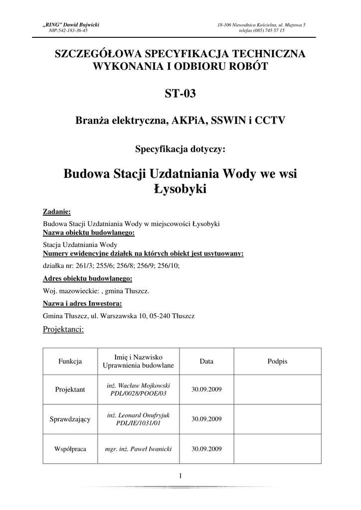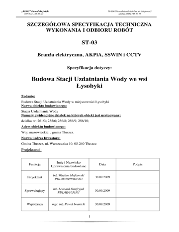 „RING” Dawid Bujwicki 18-106 Niewodnica Kościelna, ul. Miętowa 5 telefax (085) 745 57 15 NIP:542-183-36-45 SZCZEGÓŁOWA SPECYFIKACJA TECHNICZNA WYKONANIA I ODBIORU ROBÓT ST-03 Branża elektryczna, AKPiA, SSWIN i CCTV Specyfikacja dotyczy: Budowa Stacji Uzdatniania Wody we wsi Łysobyki Zadanie: Budowa Stacji Uzdatniania Wody w miejscowości Łysobyki Nazwa obiektu budowlanego: Stacja Uzdatniania Wody Numery ewidencyjne działek na których obiekt jest usytuowany: działka nr: 261/3; 255/6; 256/8; 256/9; 256/10; Adres obiektu budowlanego: Woj. mazowieckie: , gmina Tłuszcz. Nazwa i adres Inwestora: Gmina Tłuszcz, ul. Warszawska 10, 05-240 Tłuszcz Projektanci: Funkcja Imię i Nazwisko Uprawnienia budowlane Data Projektant inż. Wacław Mojkowski PDL/0028/POOE/03 30.09.2009 Sprawdzający inż. Leonard Onufryjuk PDL/IE/1031/01 30.09.2009 Współpraca mgr. inż. Paweł Iwanicki 30.09.2009 1 Podpis „RING” Dawid Bujwicki 18-106 Niewodnica Kościelna, ul. Miętowa 5 telefax (085) 745 57 15 NIP:542-183-36-45 Kod CPV 45310000-3 45311100-1 45311100-2 45315700-5 45231400-9 31121111-1 31121110-4 45315600-4 45311000-0 45314320-0 45317000-2 25211100-4 45223110-0 31215000-6 30231210-2 29861000-2 30241200-2 45312200-9 31625300-6 Roboty w zakresie instalacji niskiego napięcia Roboty w zakresie układania przewodów Roboty w zakresie montażu opraw Instalowanie rozdzielni elektrycznych Roboty w zakresie wykonania linii kablowych Elektryczne przekształtniki obrotowe Przekształtniki mocy Instalacje niskiego napięcia Roboty w zakresie przewodów instalacji elektrycznych oraz opraw elektrycznych Instalowanie innego osprzętu elektrycznego w budynku Inne instalacje elektryczne Elektryczne kanały kablowe z tworzyw sztucznych Instalowanie konstrukcji metalowych Ograniczniki napięcia Centralna jednostka sterująca Układy sterowania Oprogramowanie aplikacyjne Instalowanie alarmów włamaniowych Alarmy antywłamaniowe 2 „RING” Dawid Bujwicki 18-106 Niewodnica Kościelna, ul. Miętowa 5 telefax (085) 745 57 15 NIP:542-183-36-45 SPIS ZAWARTOŚCI: 1 Część ogólna .................................................................................................................................... 7 1.1 Przedmiot specyfikacji i zakres robót budowlanych .................................................................. 7 1.2 Uczestnicy procesu inwestycyjnego ........................................................................................... 7 1.3 Zakres stosowania specyfikacji technicznej ............................................................................... 7 1.4 Zakres robót objętych specyfikacją techniczną .......................................................................... 7 1.5 Ogólne wymagania dotyczące robót .......................................................................................... 7 1.6 Informacje o terenie budowy ..................................................................................................... 8 1.6.1 Organizacja pracy na budowie........................................................................................... 8 1.6.2 Warunki bezpieczeństwa pracy ......................................................................................... 8 1.7 Dokumentacja projektowa ......................................................................................................... 9 1.8 Zgodność robót z dokumentacją i specyfikacją techniczną ....................................................... 9 1.9 Ochrona środowiska w czasie wykonywania robót ................................................................... 9 1.10 2 Określenia podstawowe......................................................................................................... 9 Wymagania dotyczące właściwości wyrobów budowlanych ........................................................ 10 2.1 Ogólne wymagania dotyczące wyrobów stosowanych przy budowie instalacji elektrycznych10 2.1.1 Kable i przewody.............................................................................................................. 10 2.1.2 Folia ................................................................................................................................. 10 2.1.3 Przepusty kablowe i osłonowe ........................................................................................ 11 2.1.4 Szafy sterujące i zasilające ............................................................................................... 11 2.2 Niezbędne wymagania związane z transportowaniem i przechowywaniem wyrobów stosowanych przy budowie instalacji elektrycznych. ........................................................................ 12 3. 2.2.1 Wymagania ogólne .......................................................................................................... 12 2.2.2 Transport materiałów ...................................................................................................... 12 2.2.3 Odbiór i przyjmowanie materiałów, wyrobów i urządzeń – kontrola jakości ................. 13 2.2.4 Składowanie materiałów ................................................................................................. 13 Wymagania dotyczące sprzętu i maszyn przewidzianych do wykonania robót............................ 14 2.3 Maszyny i urządzenia stosowane przy wykonywaniu robót elektrycznych ............................. 15 3 Wymagania dotyczące środków transportu.................................................................................. 15 3.1 Ogólne wymagania dotyczące środków transportu ................................................................. 15 3.2 Środki transportu ..................................................................................................................... 15 4 Wymagania dotyczące wykonania robót ....................................................................................